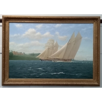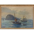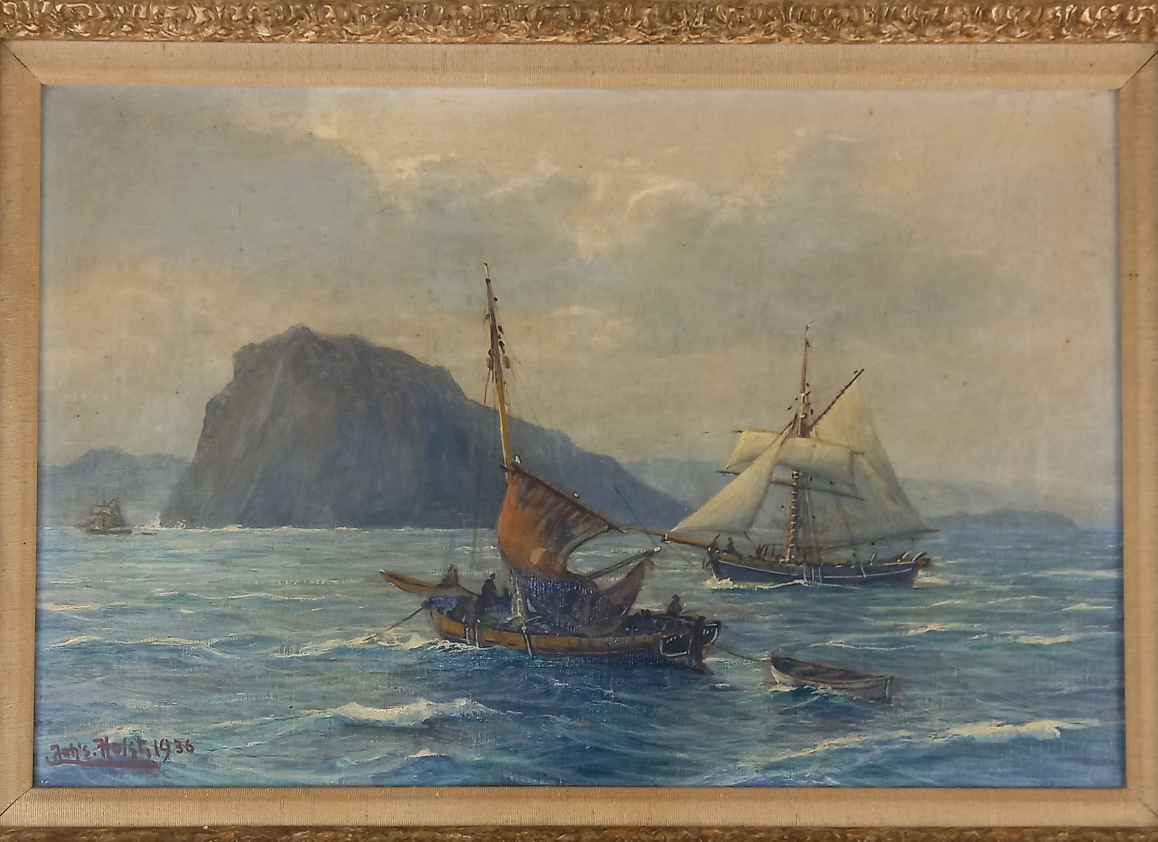Johannes Holst (20th Century) sailing boats off a headland, oil on canvas, signed and dated 1936, 29cm by 44cm