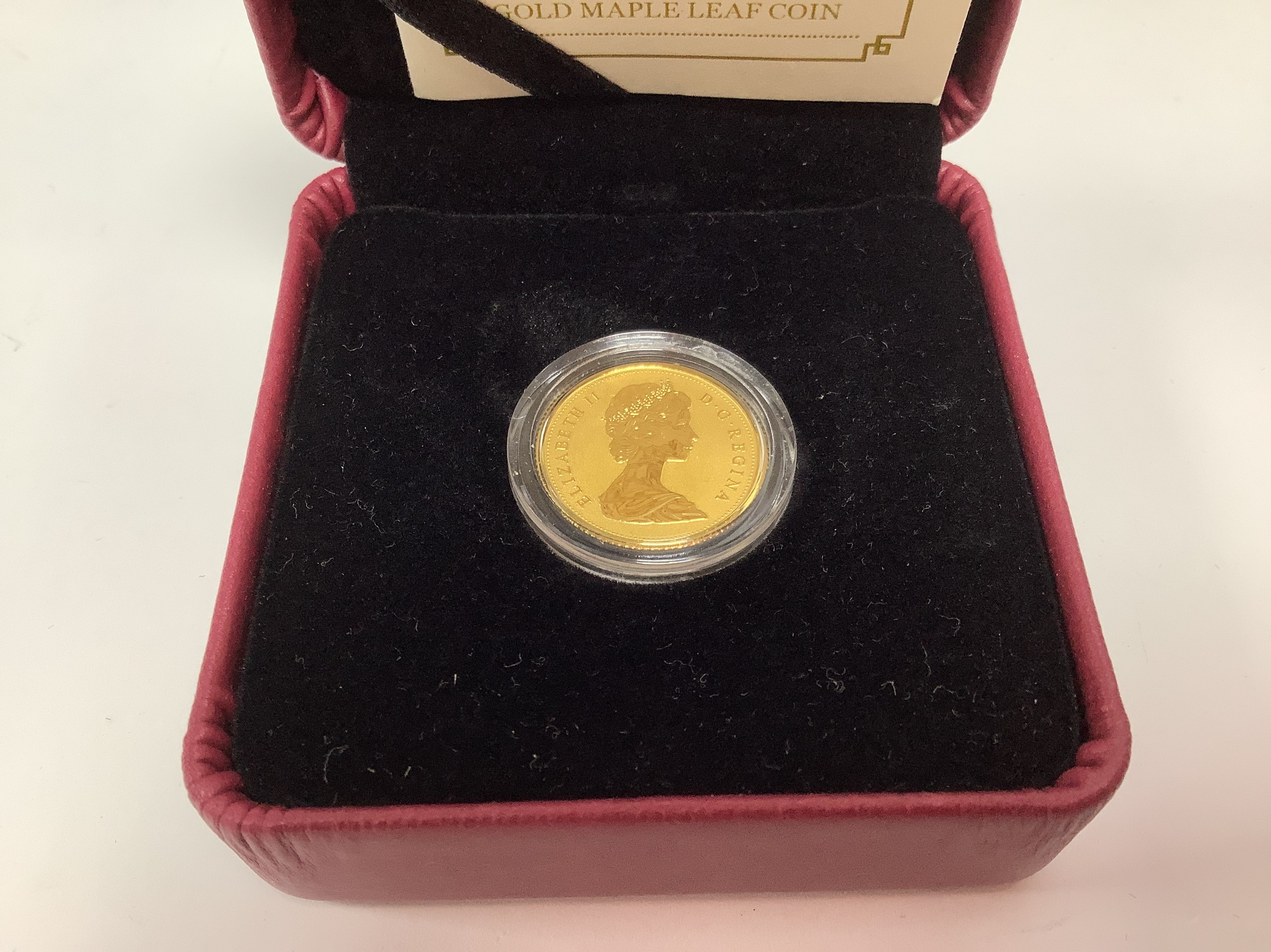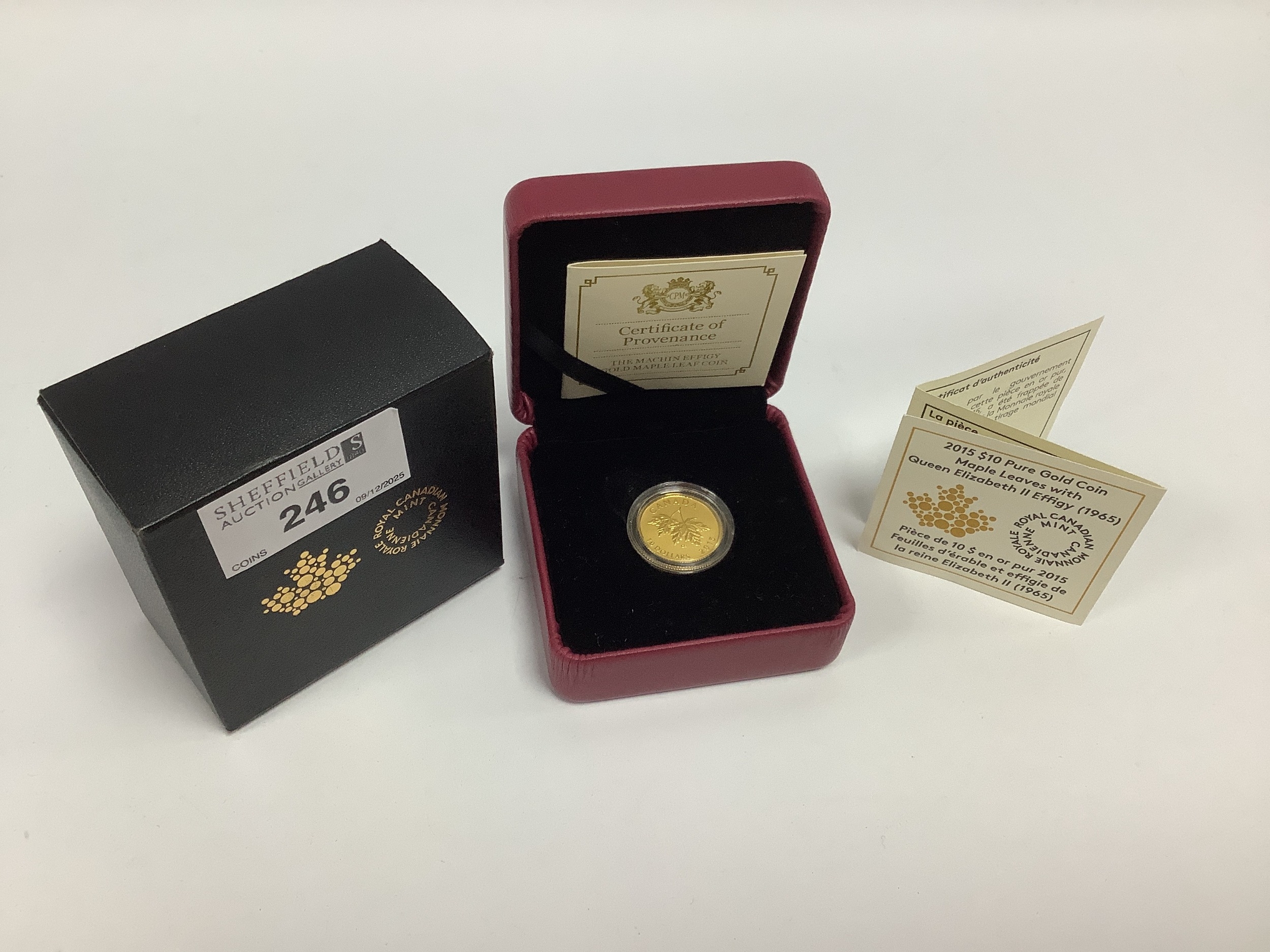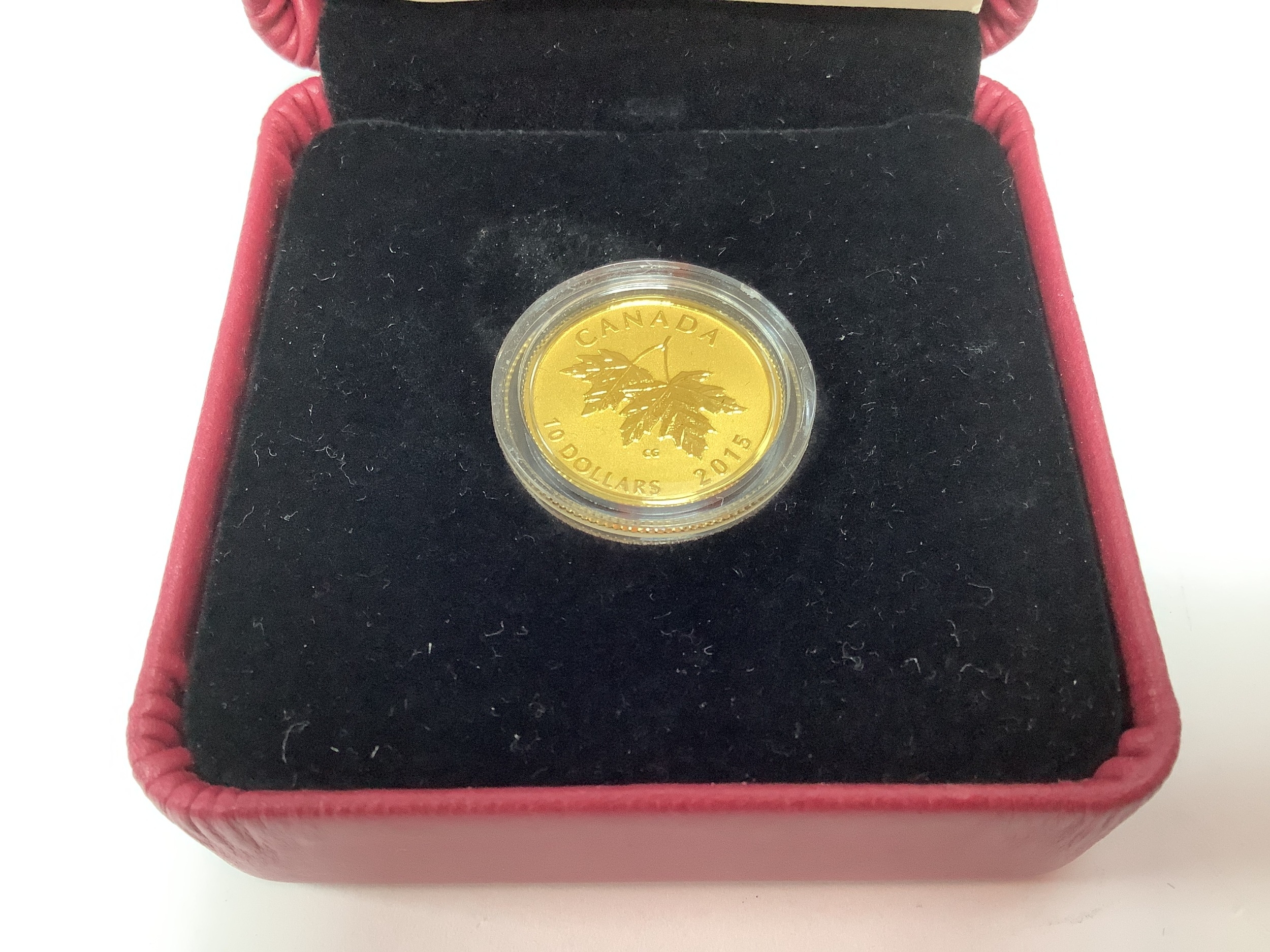 2015 Royal Canadian Mint Fine Gold Maple Leaves $10 Coin, cased with a certificate of authenticity.