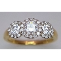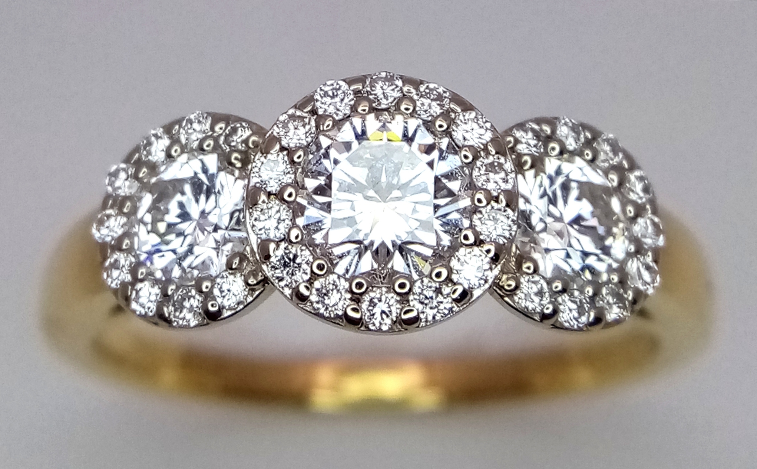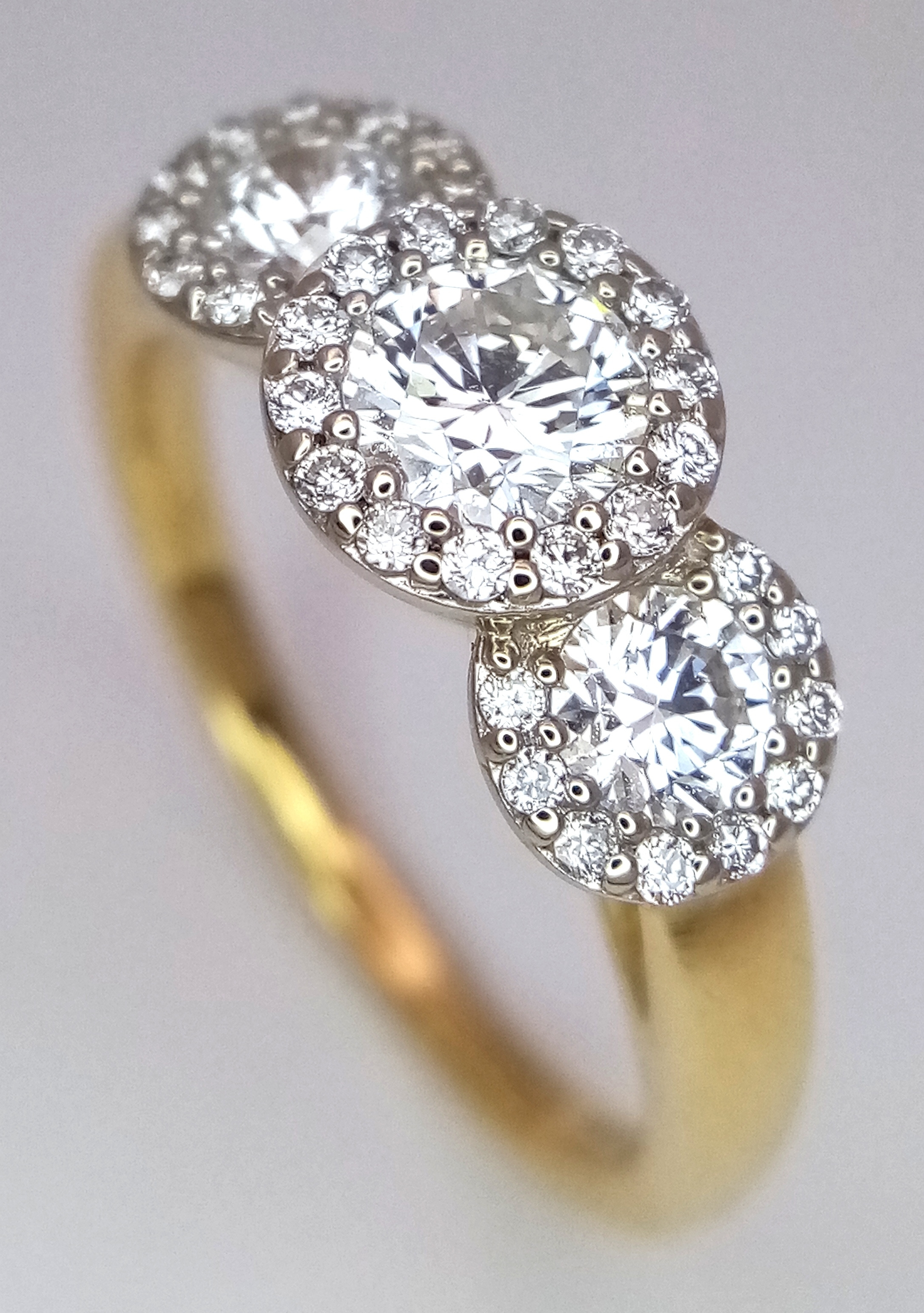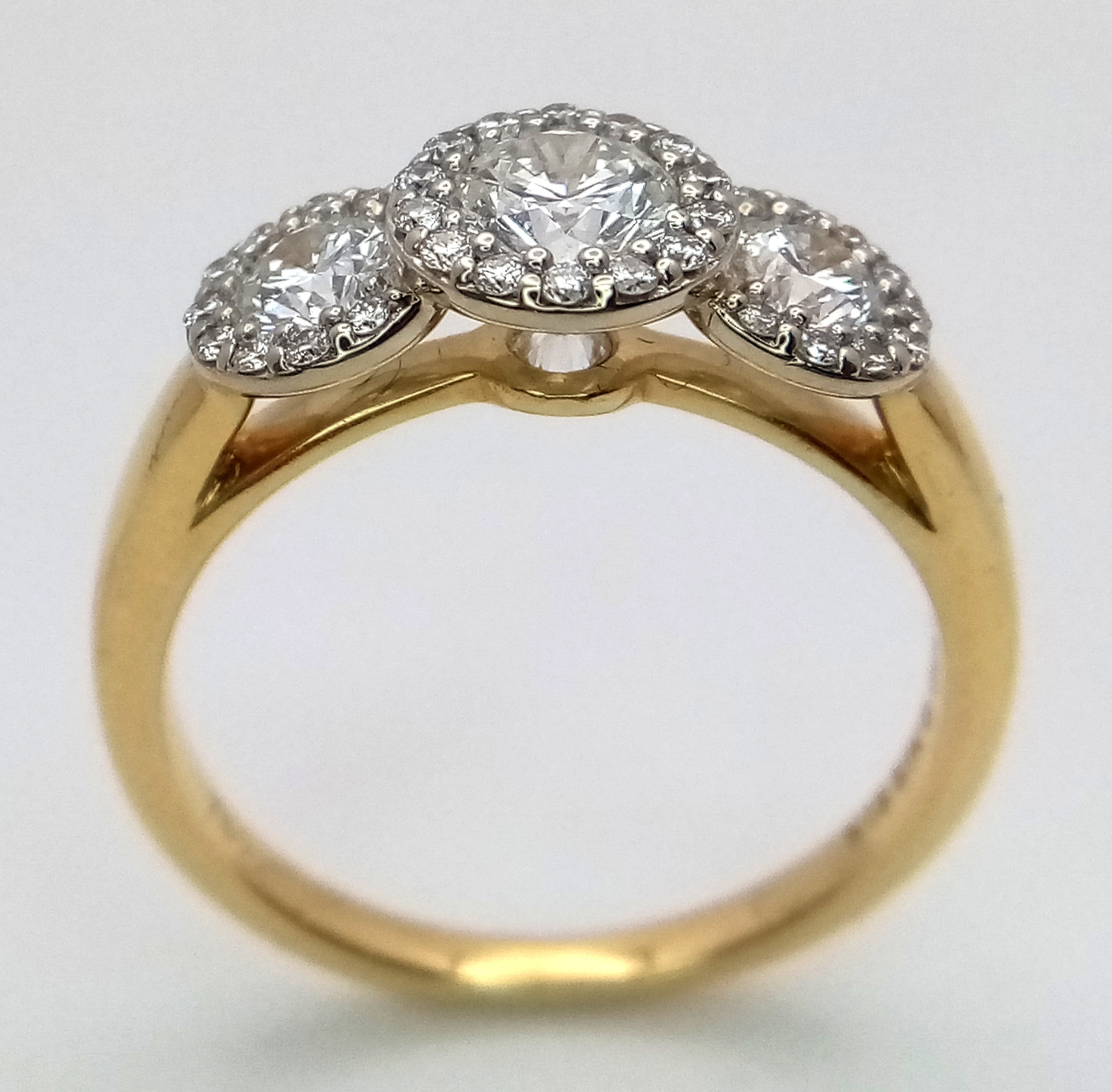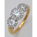 A Breath-Taking 18K Yellow Gold Diamond Cluster Ring. Three round brilliant cut diamonds with diamond surrounds - 1.2ctw. VS2-SI1 clarity. G-I colour. Size N 1/2. Ref: C6504.
