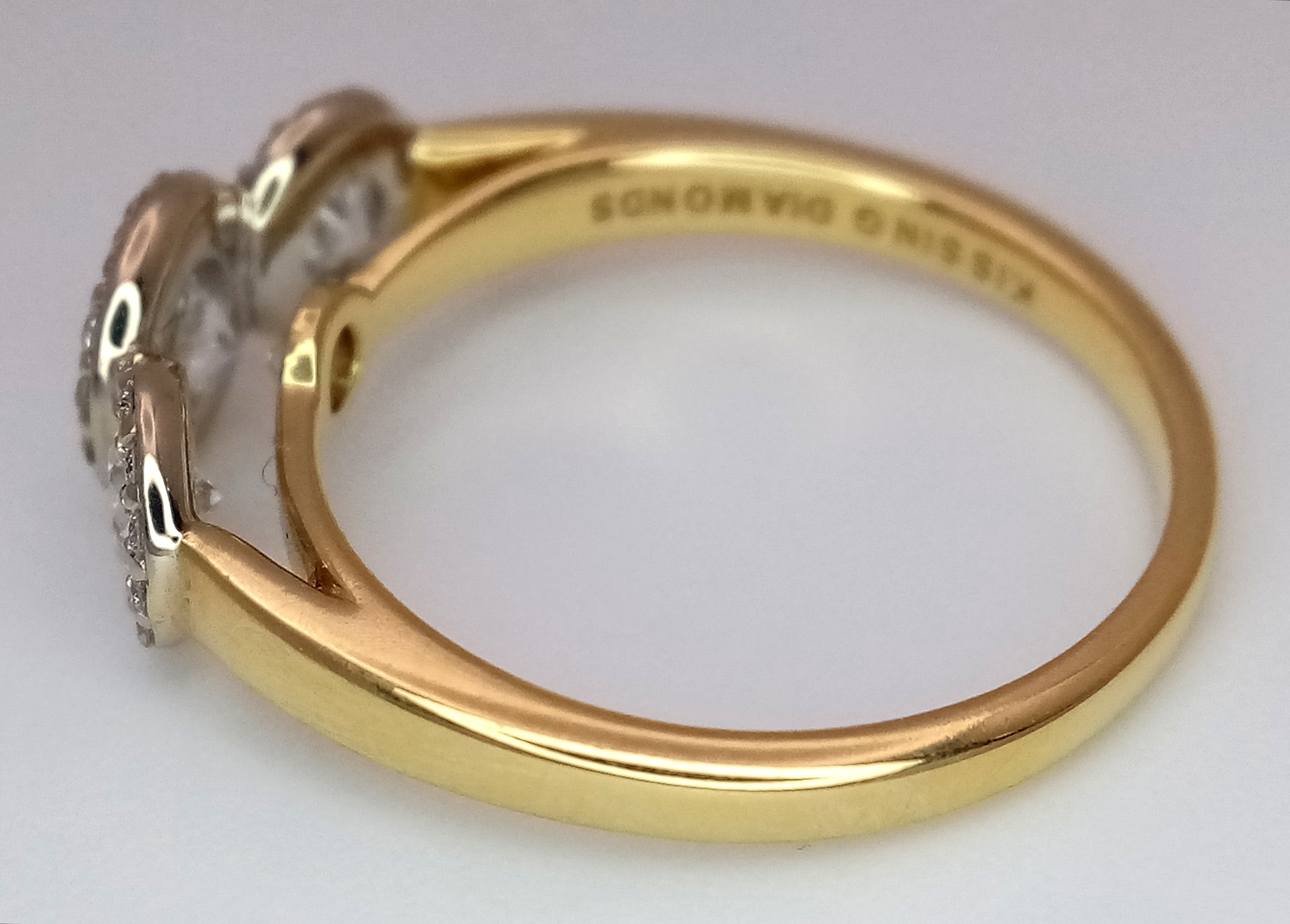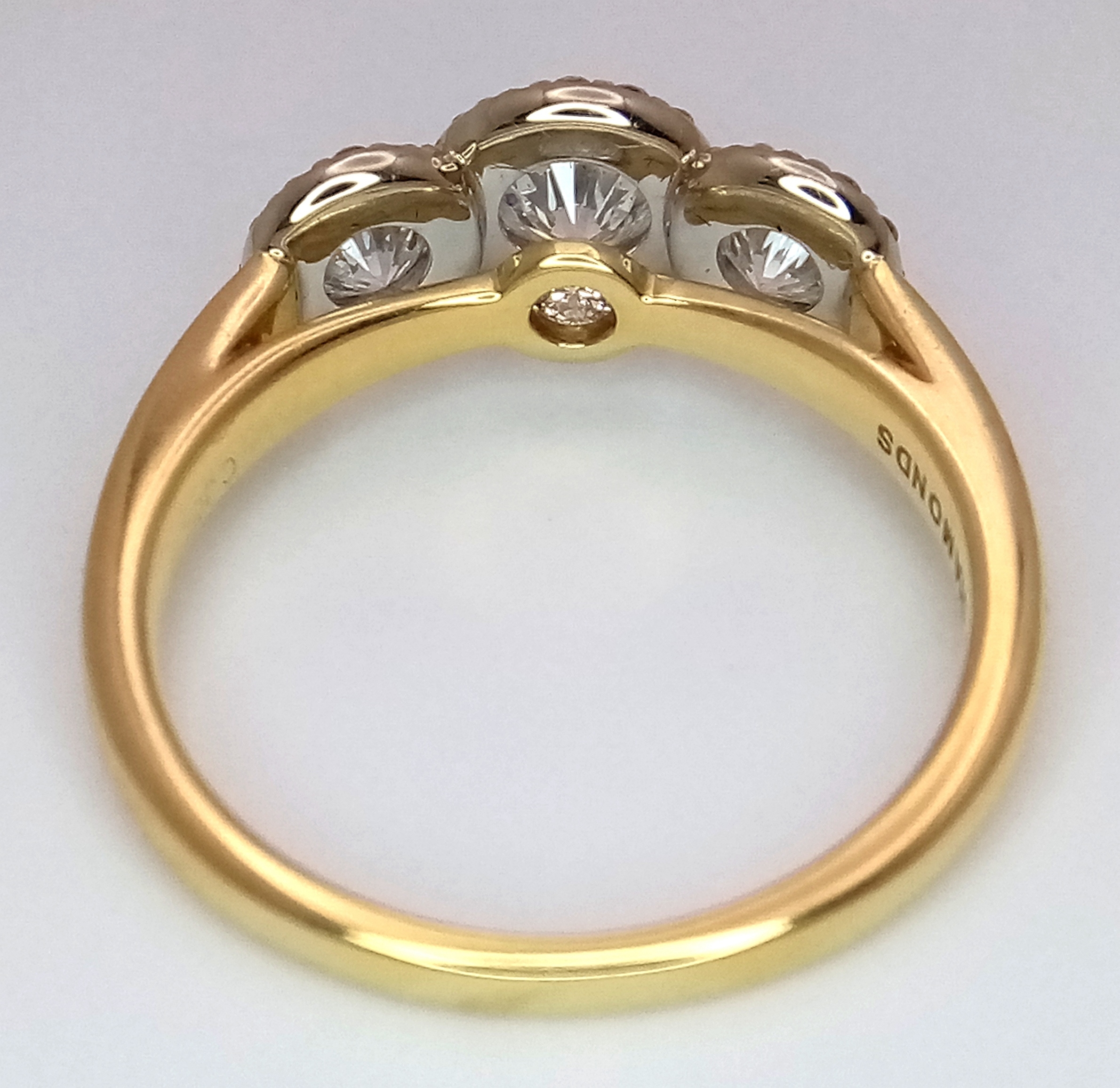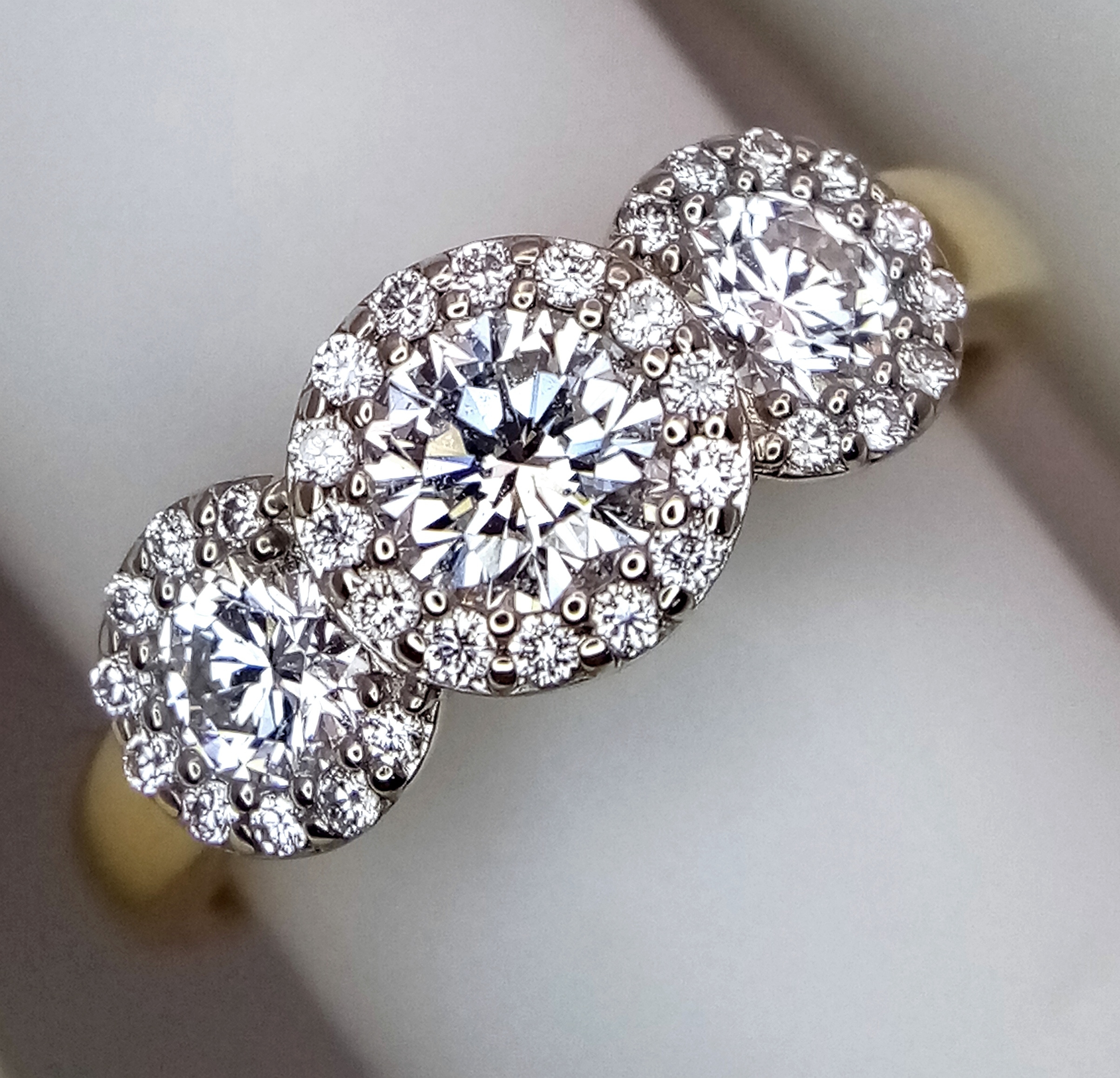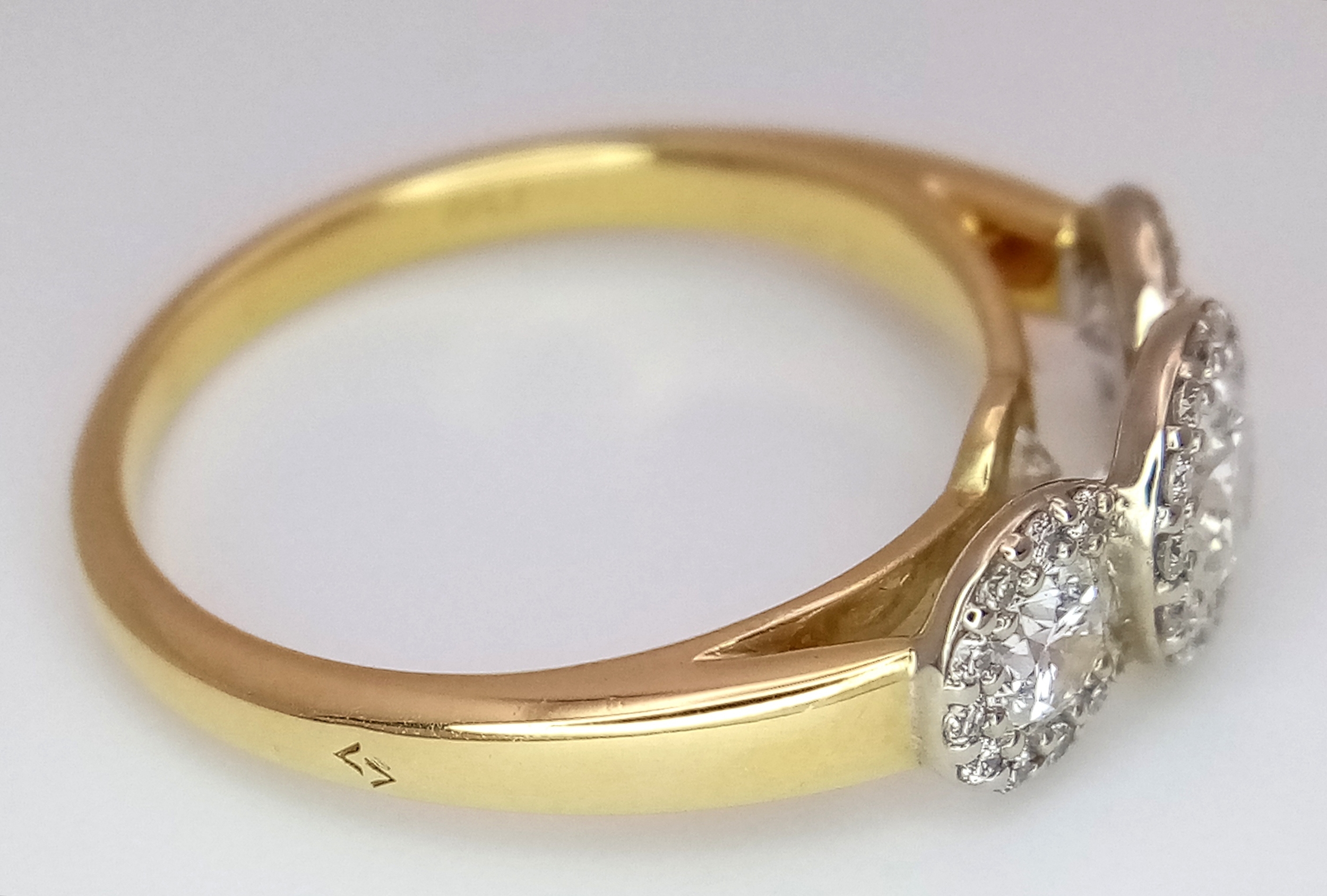 A Breath-Taking 18K Yellow Gold Diamond Cluster Ring. Three round brilliant cut diamonds with diamond surrounds - 1.2ctw. VS2-SI1 clarity. G-I colour. Size N 1/2. Ref: C6504.