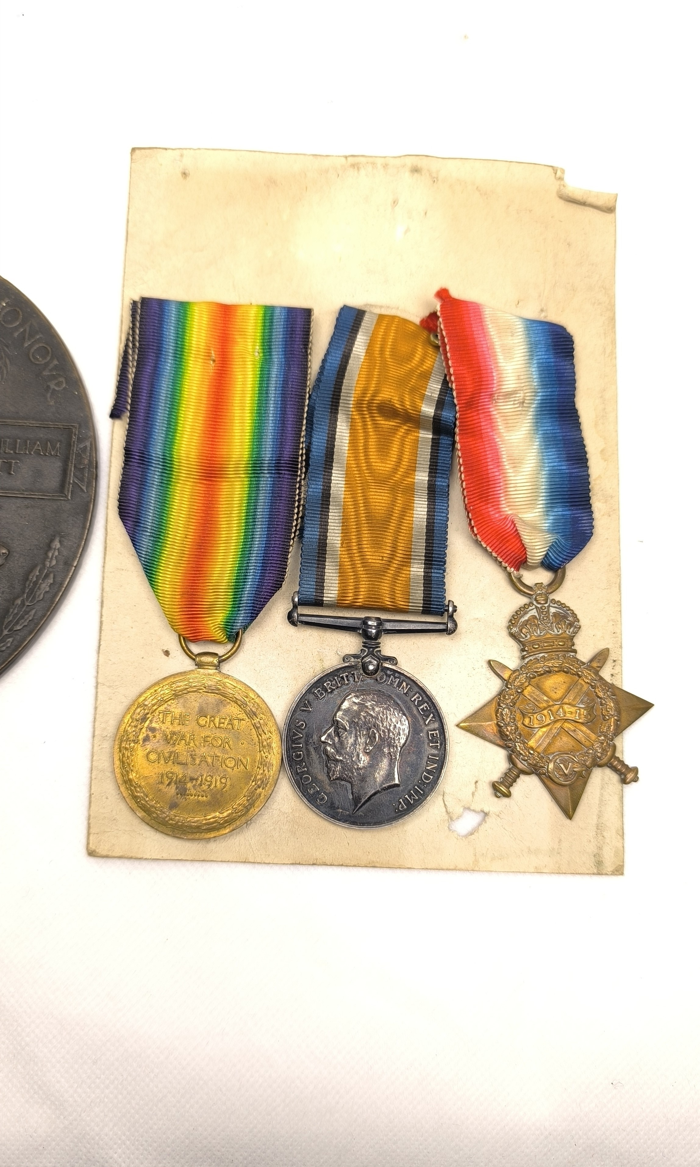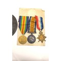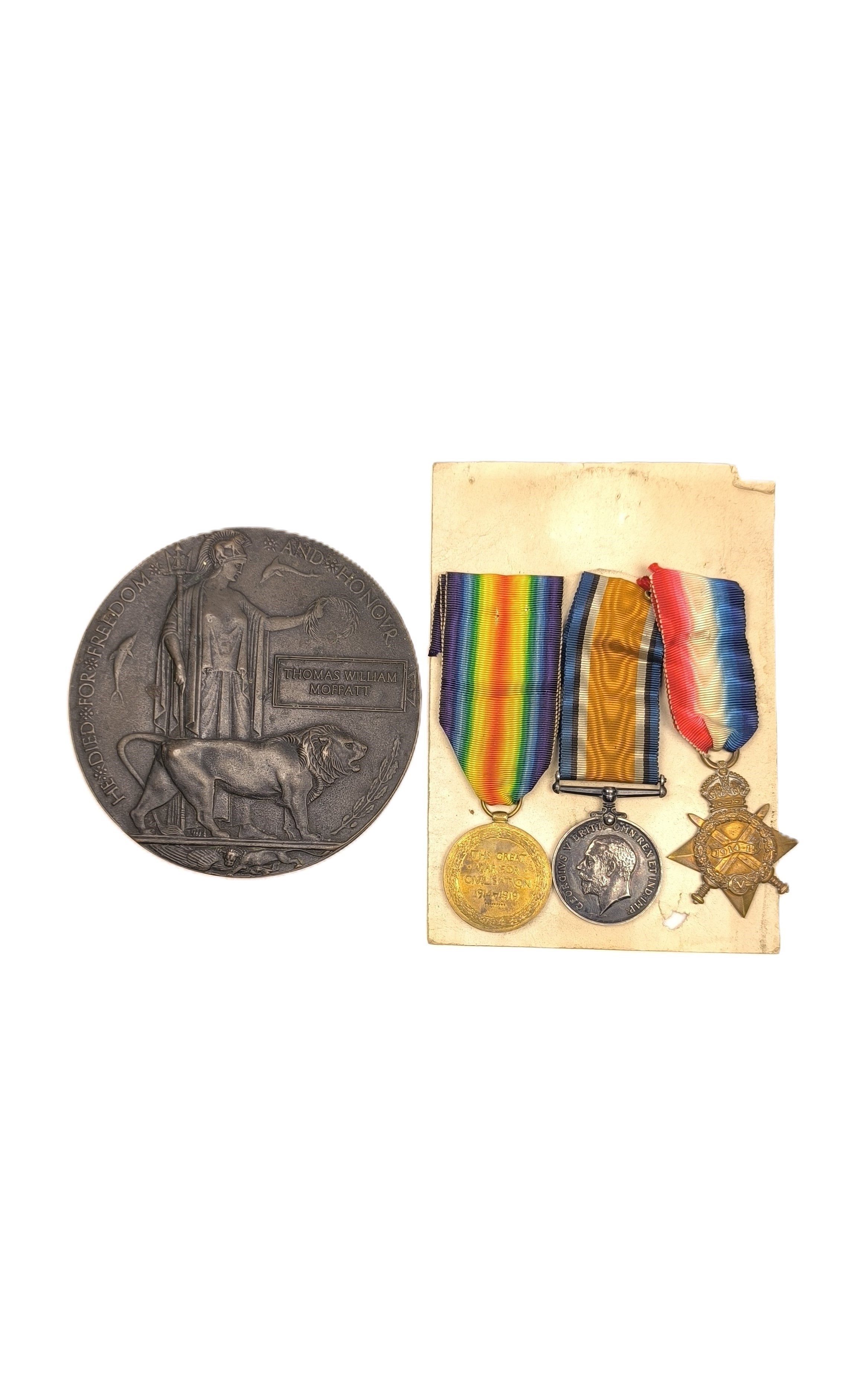WW1 Medals relating to three brothers of the Moffatt family to include the Death penny of Thomas William Moffatt, a 1914-15 star and war medal of Pte A.J.Moffatt K.O.S.B 15287, a Victory medal for Pte R Moffatt Argyle and Southern Highlanders 3182 (4)