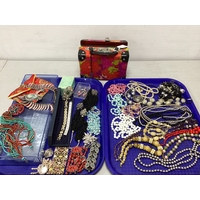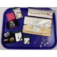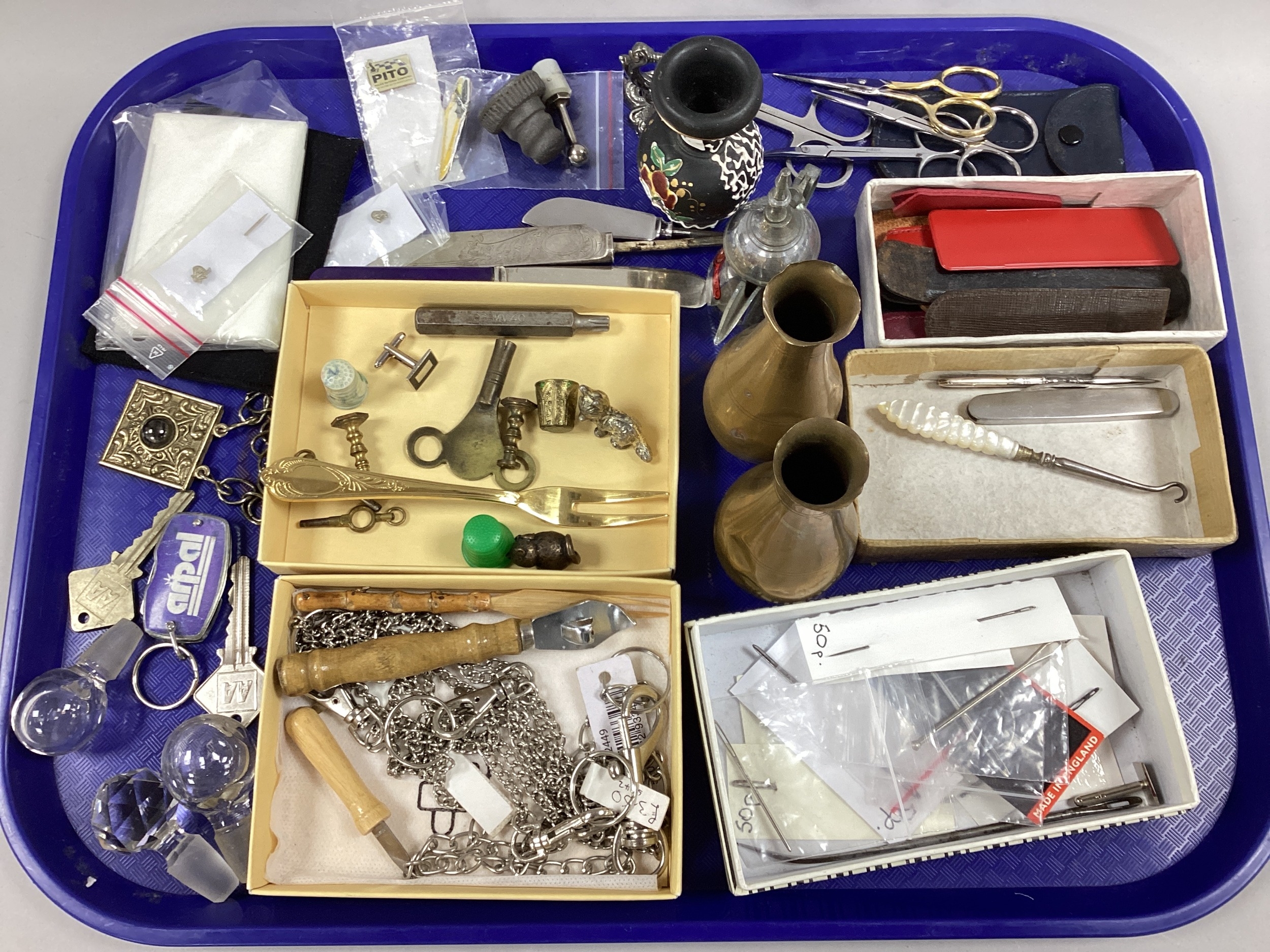 Scissors, glass stoppers, folding pocket knife, button hook, chains, etc :- One Tray