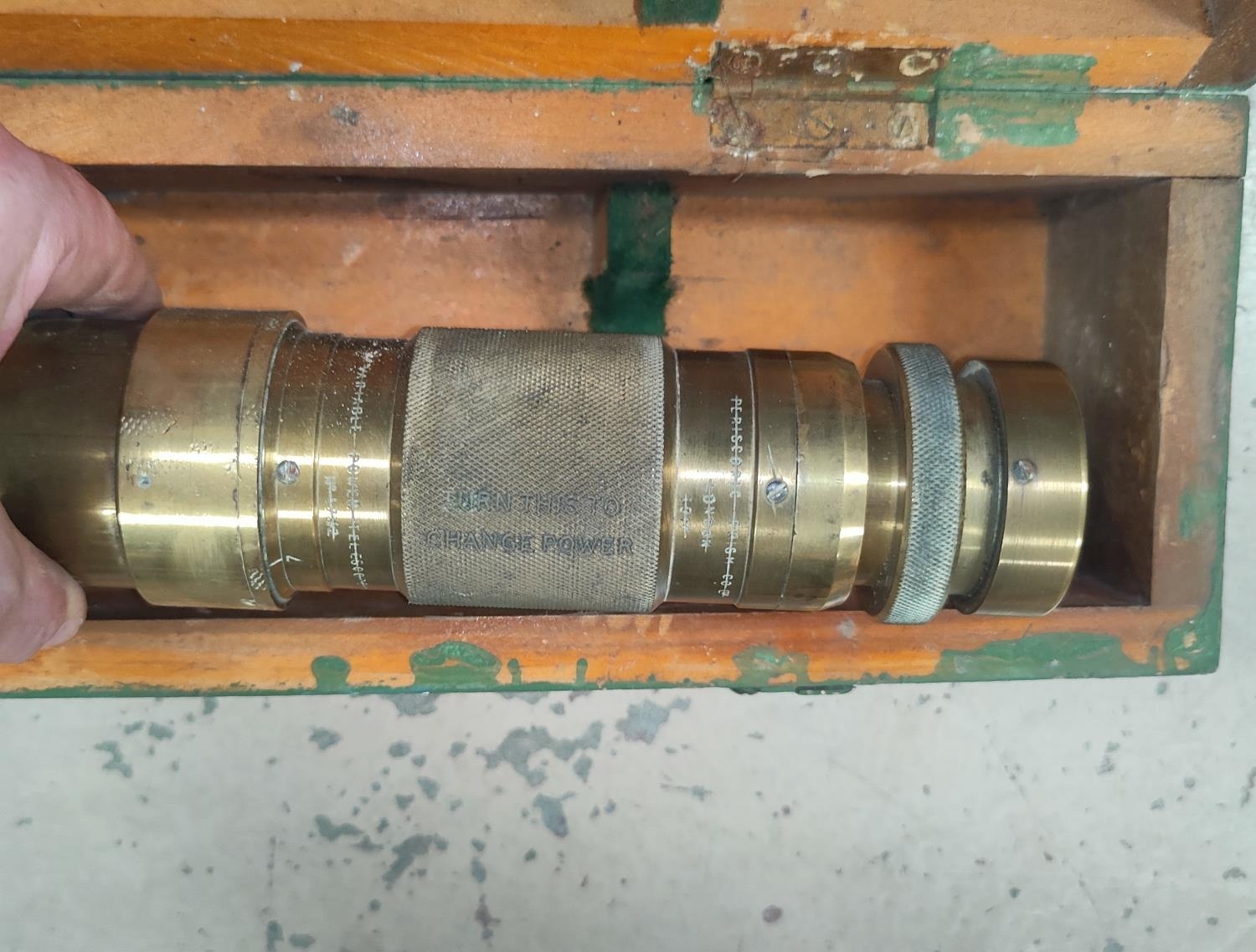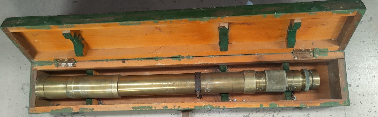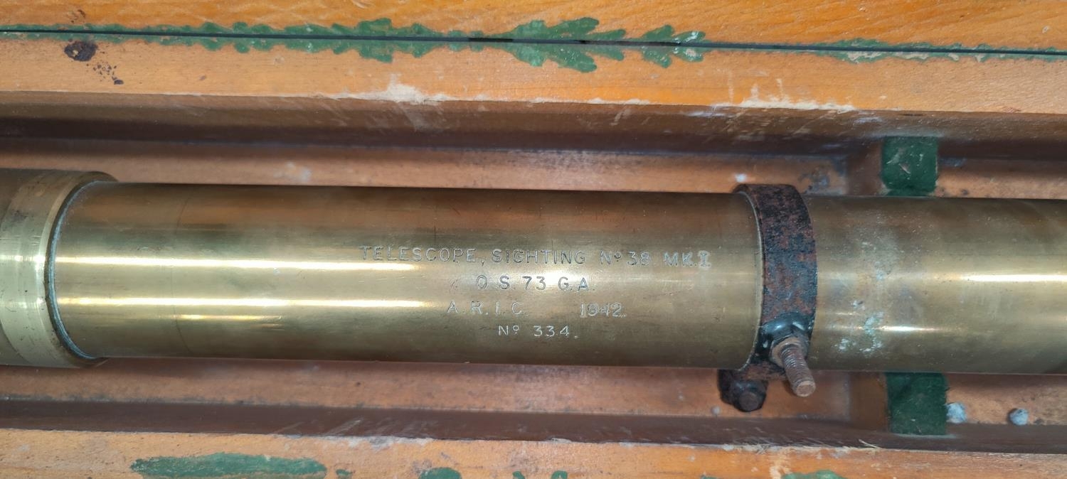 A military "Telescope Sighting No. 38 MK1 05 73 GA ARIG 1934 No. 334." Length 75cm in an original stained wood box.