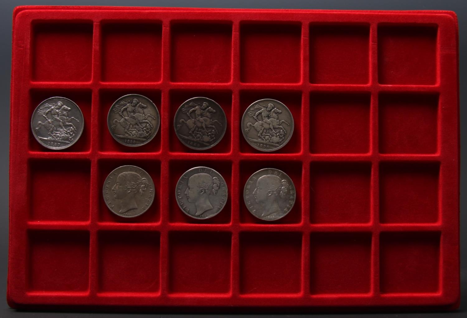 Coins, Great Britain, Crowns, 1844, good Fine but minor mark at date; 1845, eks Fine; 1847, Fine but mark at date; 1887-90 Fine (4) [7]
