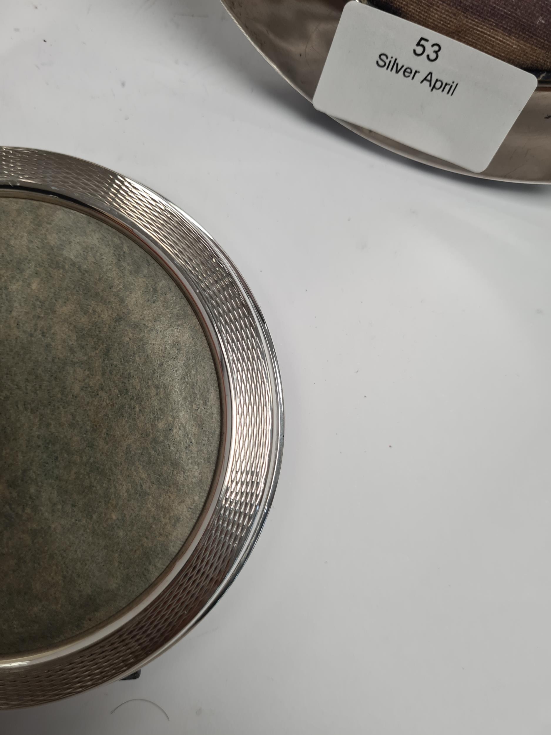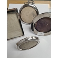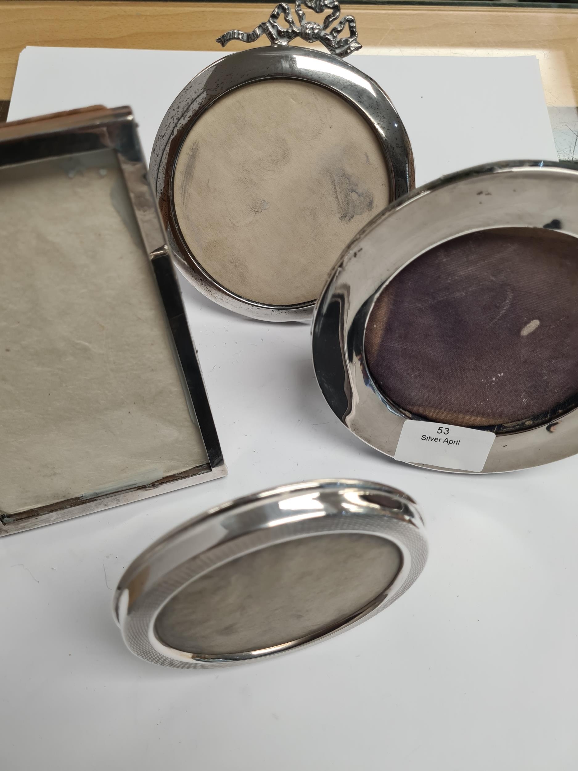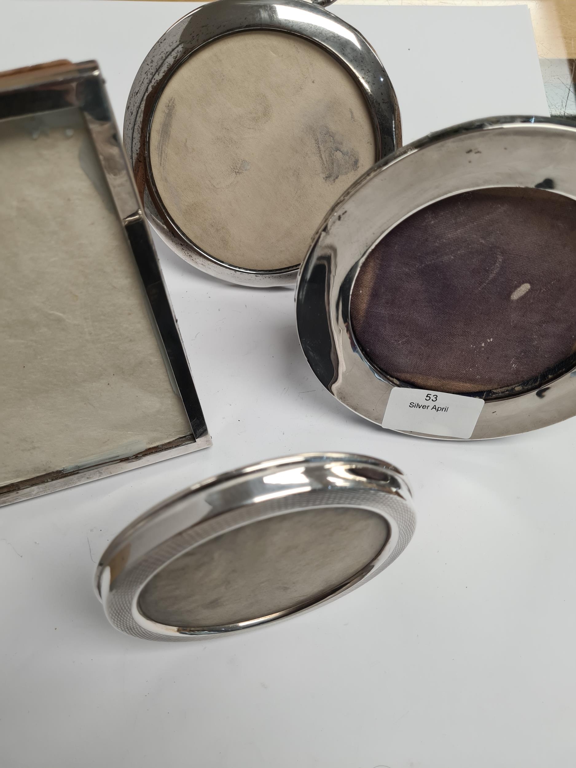 Various silver photo frames of different styles. One by Charles S Green and Co Ltd., one Mappin and Webb, Sanders and Mackenzie, and a rectangular example by the some maker. Condition Report: Some damage