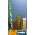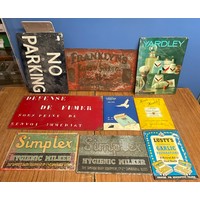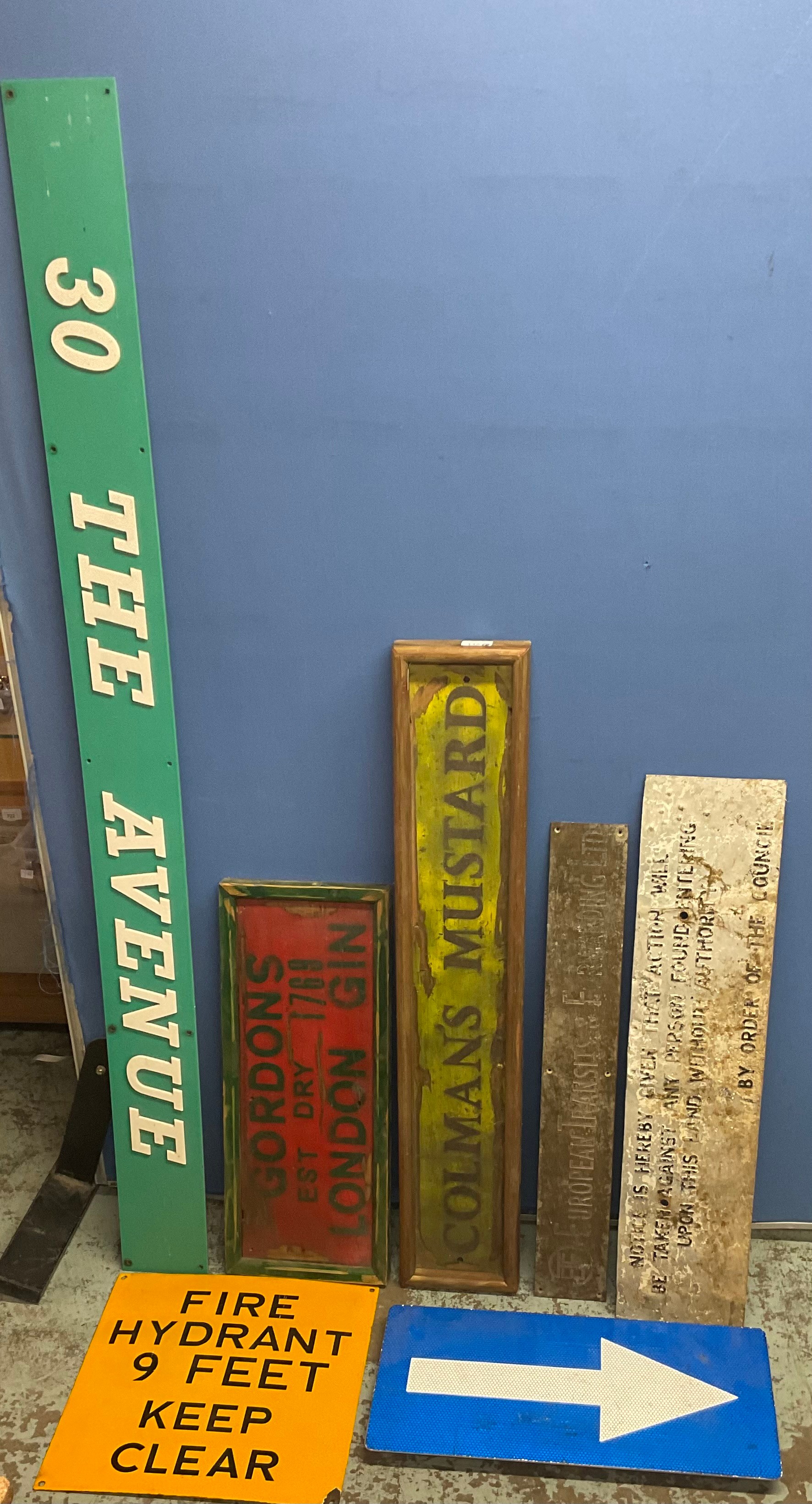 Coleman’s mustard wooden sign, Gordon’s London gin sign, and five other signs (7)