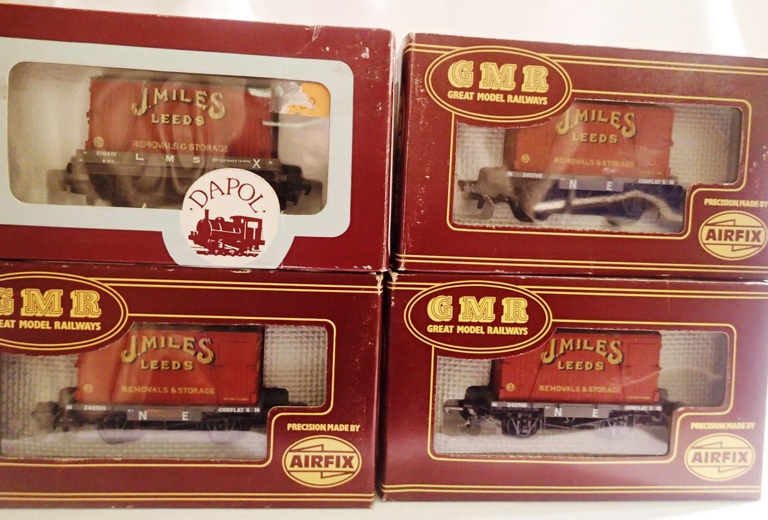 Three OO scale Airfix wagons and a Dapol conflat with J Miles leeds containers, mostly in excellent condition, wear to boxes. P&P Group 1 (£14+VAT for the first lot and £1+VAT for subsequent lots)
