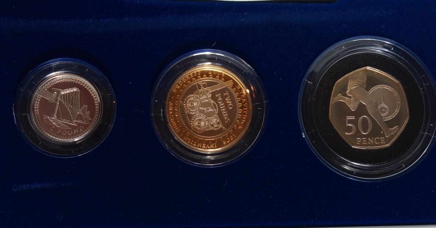Two pound coin, one pound coin and fifty pence, in a protective capsules and fitted box, complete with certificate of authenticity.