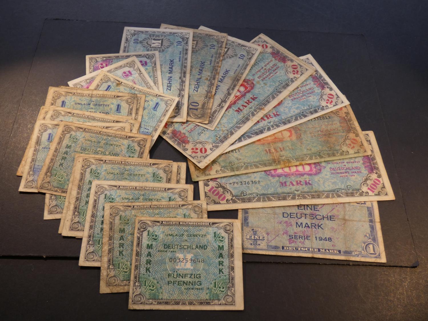 GERMANY. Allied occupation, WWII, 1944; ½ Mark, P-191a, x8, 1 Mark, P-192a x7, 5 Mark, P-193a & P-193d, 10 Mark (P-194a, P-194b & P-194d), 20 Mark, P-195a x2 & P-195d, and 100 Mark, P-197d, plus West Germany, 1 Deutschemark, 1948, P-2a. Mixed grades and condition, VG to VF (25)