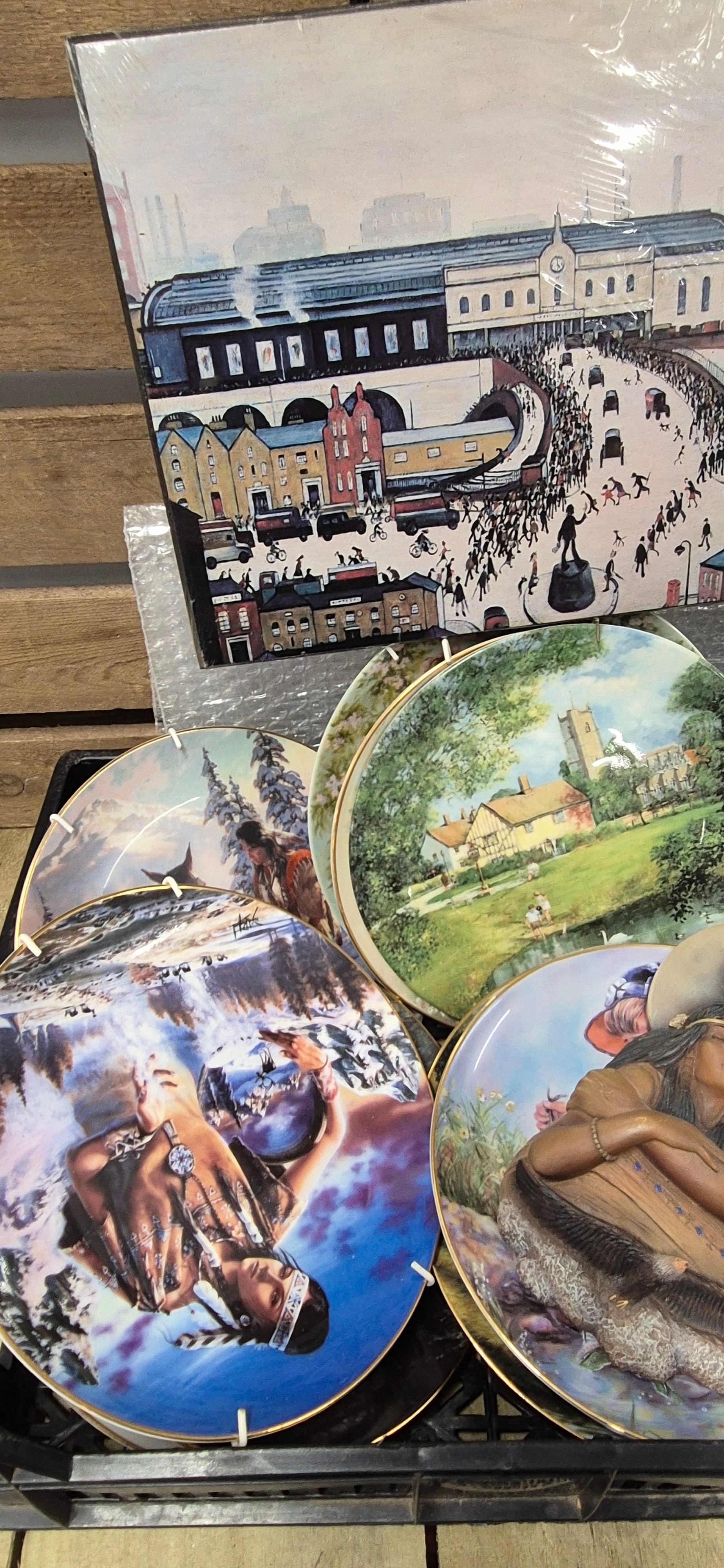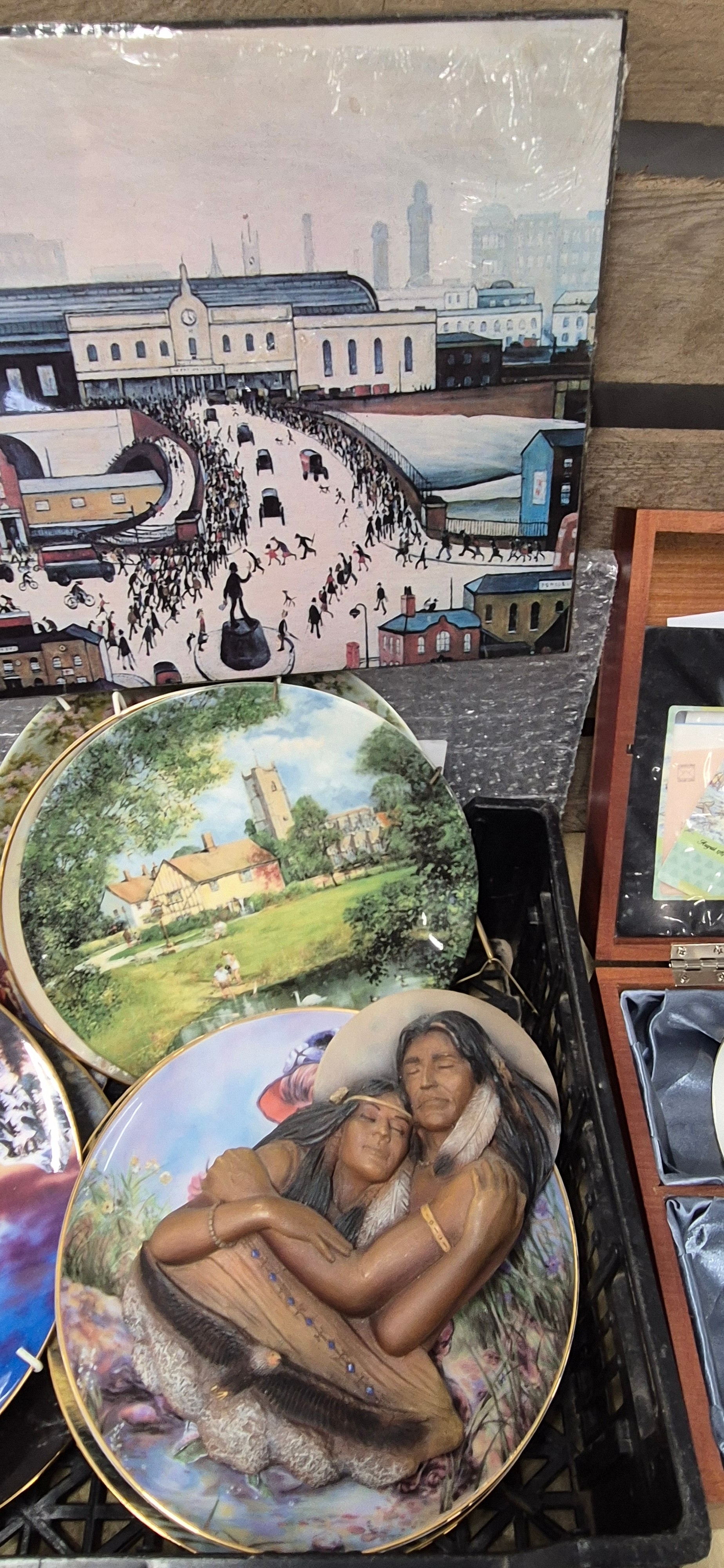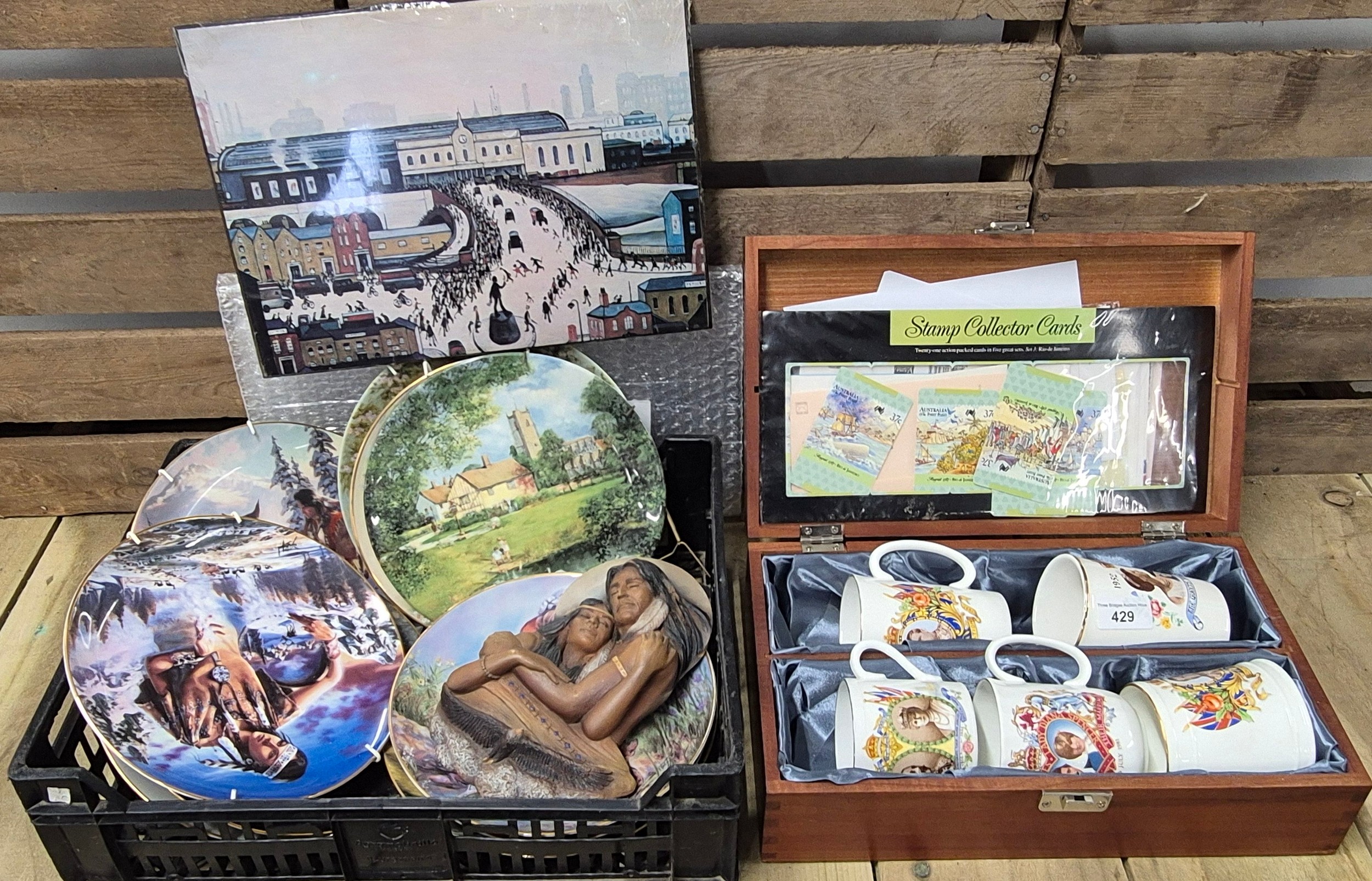 A selections of collectables; Indian scene collectors plates, Indian wall plaque, Royalty commemorative cups, first day covers & Lowry print