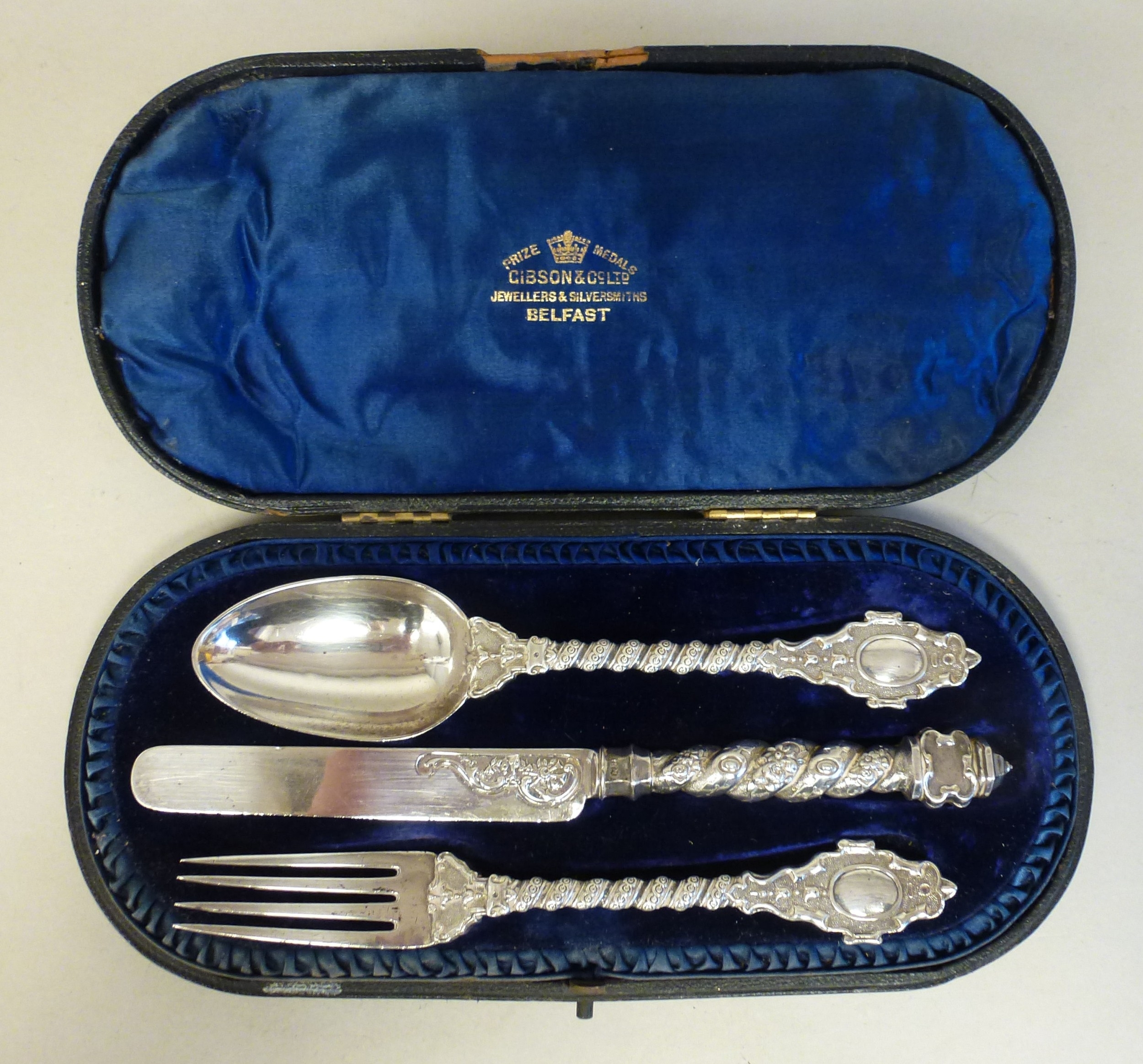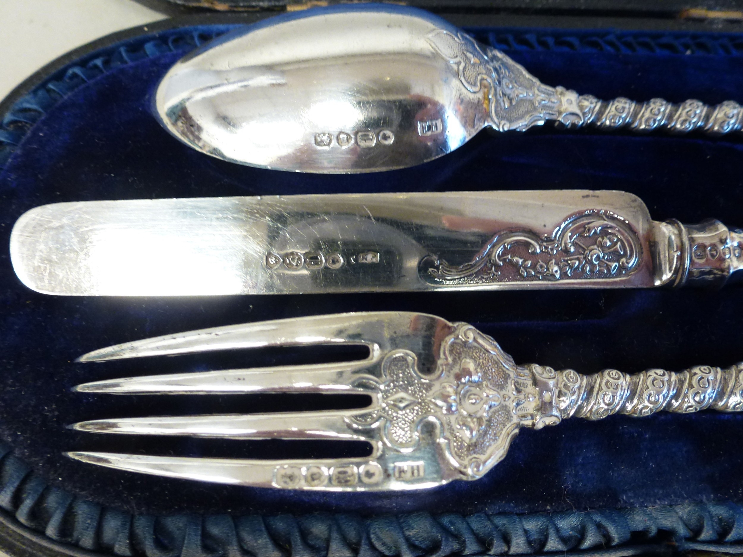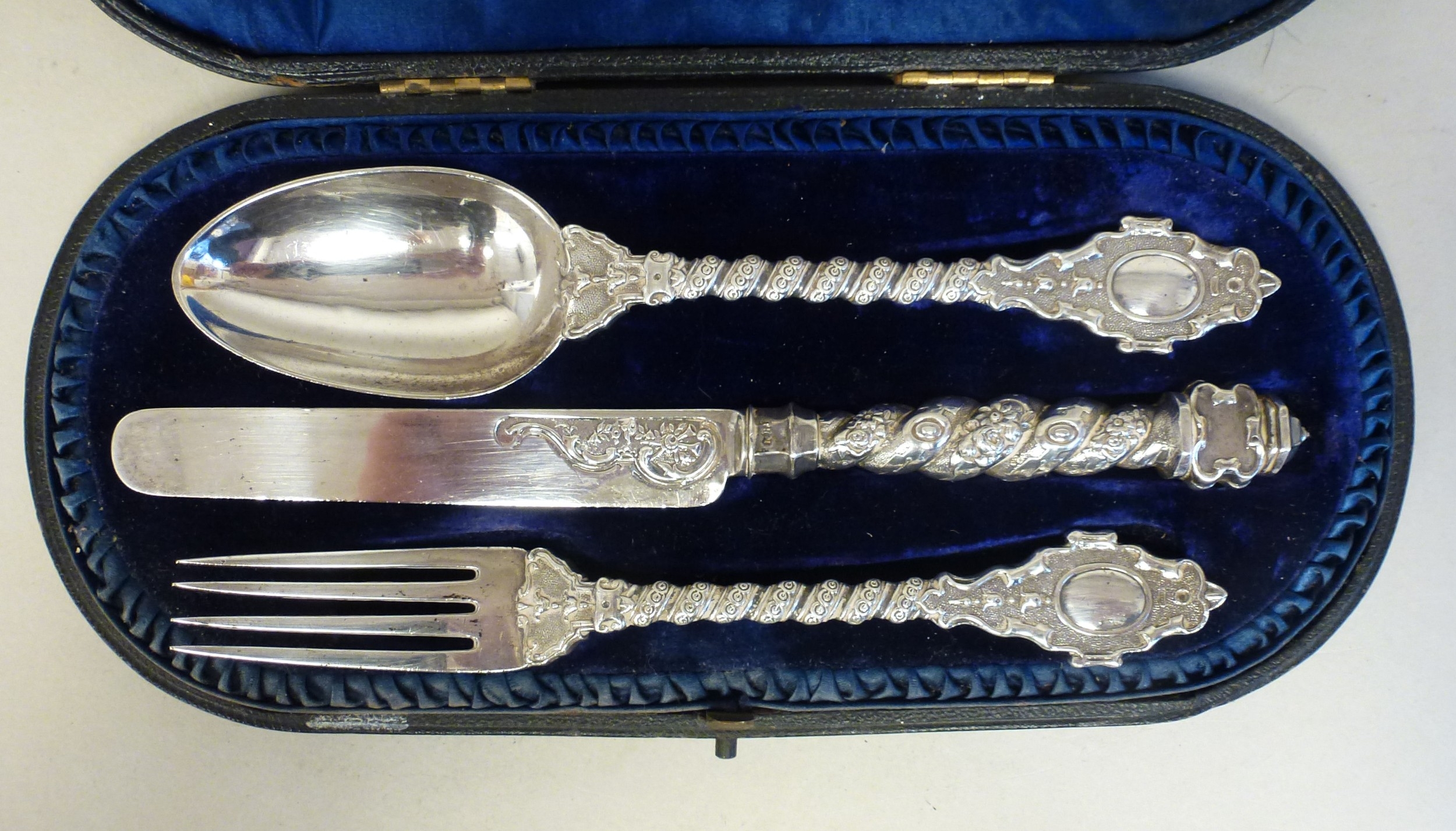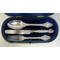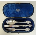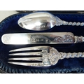 A late Victorian silver three piece Christening set, comprising a spoon, knife and fork London 1866 cased