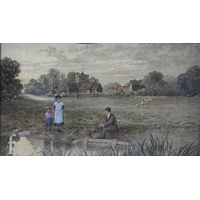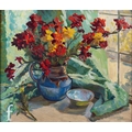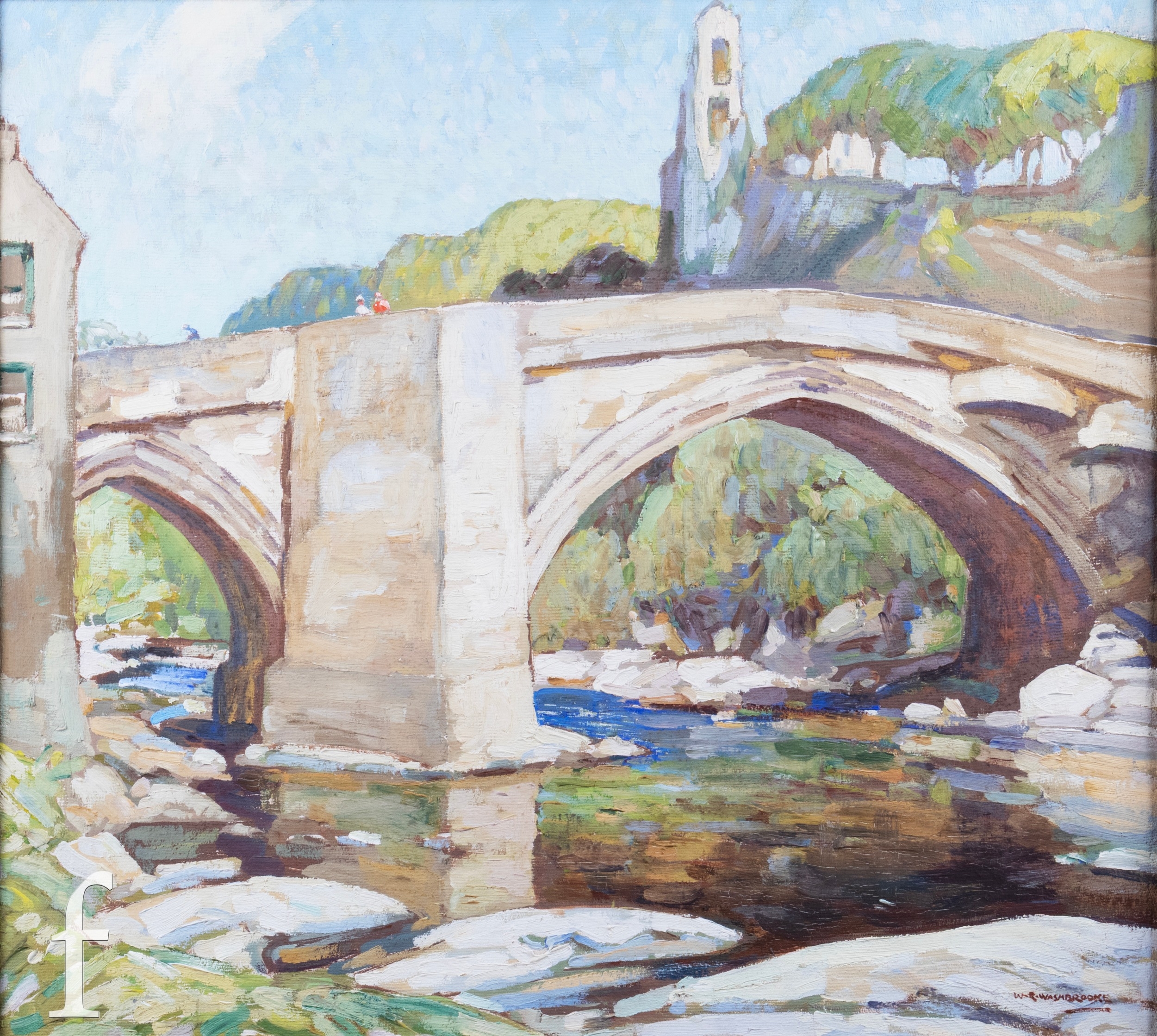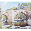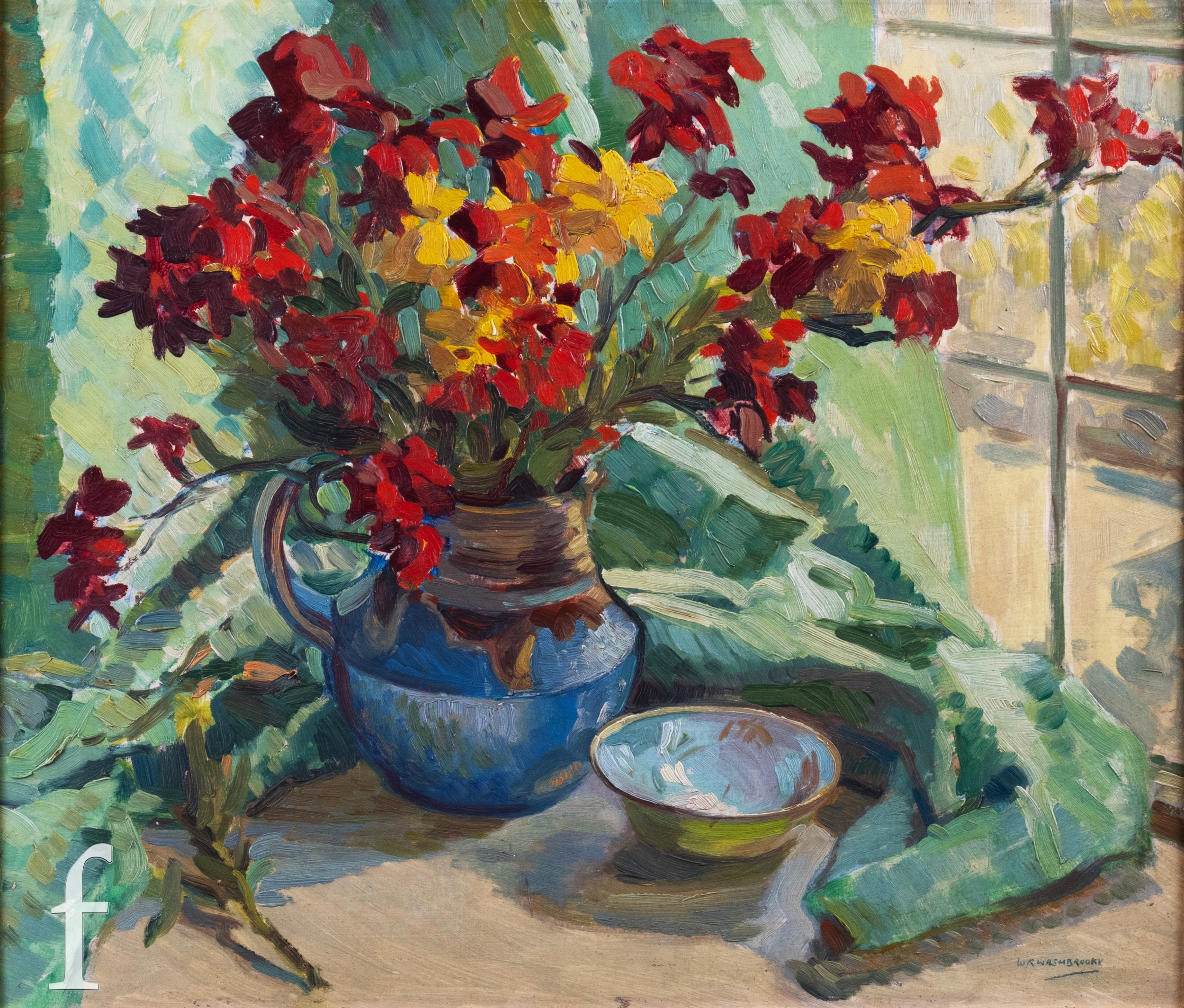 W. R. Washbrooke (20th Century) - River landscape with bridge, oil on board, signed, framed, 53cm x 59cm, frame size 71cm x 77cm, also a still life oil on board depicting red and yellow flowers in a blue jug by the same hand. (2)