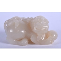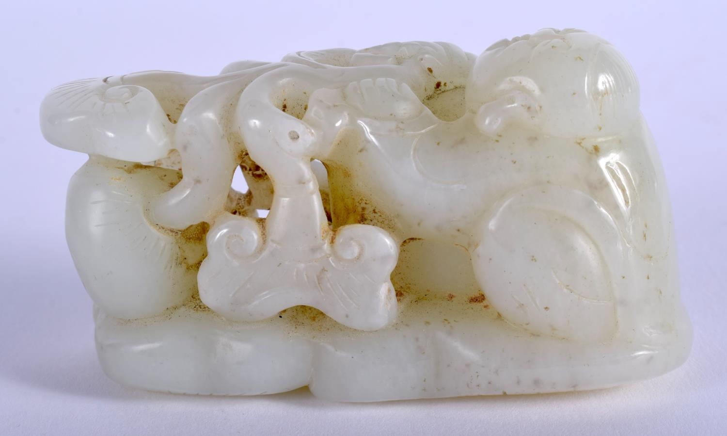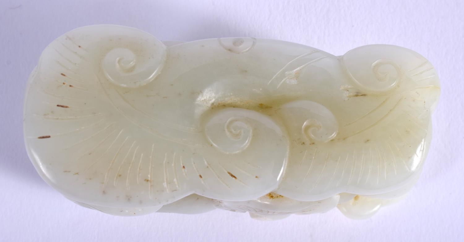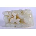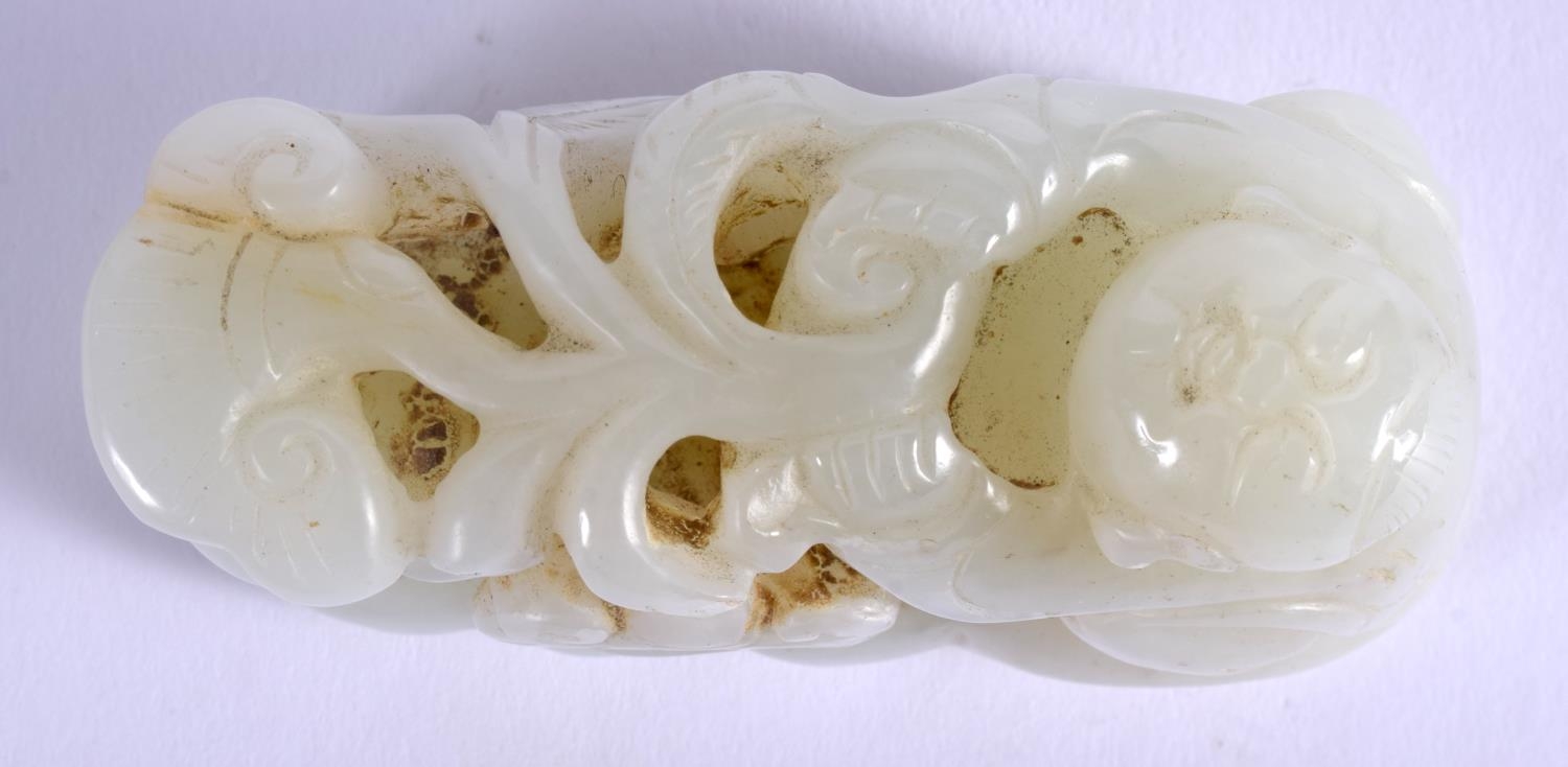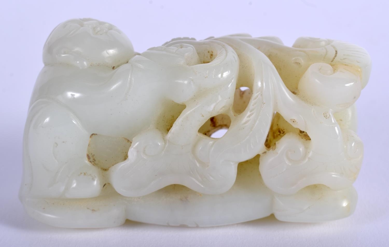 AN EARLY 20TH CENTURY CHINESE CARVED GREENISH WHITE JADE FIGURE Late Qing/Republic, modelled as a boy pulling a lotus. 7 cm x 4 cm.