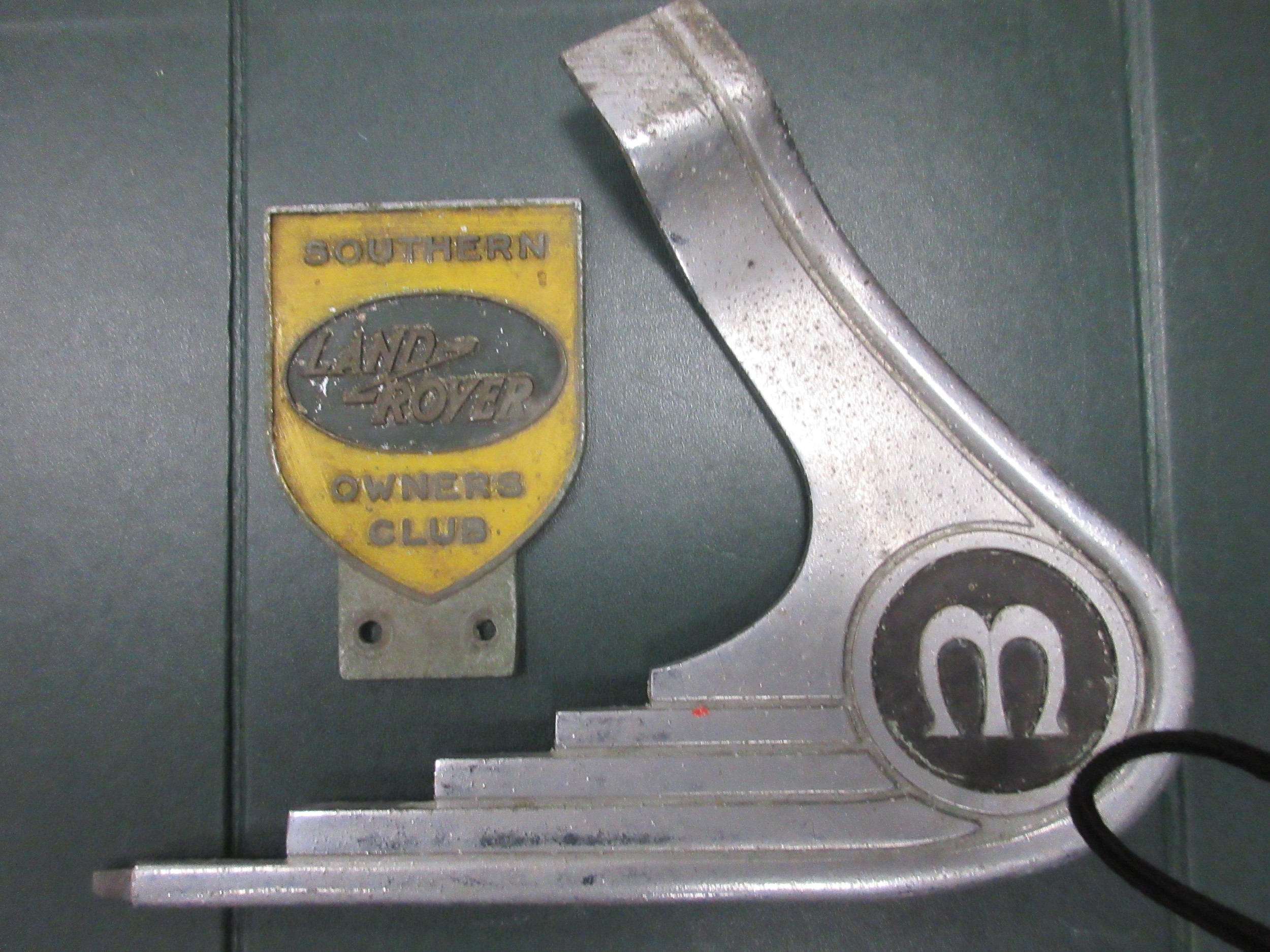 A vintage and original Southern Land Rover Owner's Club radiator badge, no fittings, plus a vintage Wolseley chrome badge
