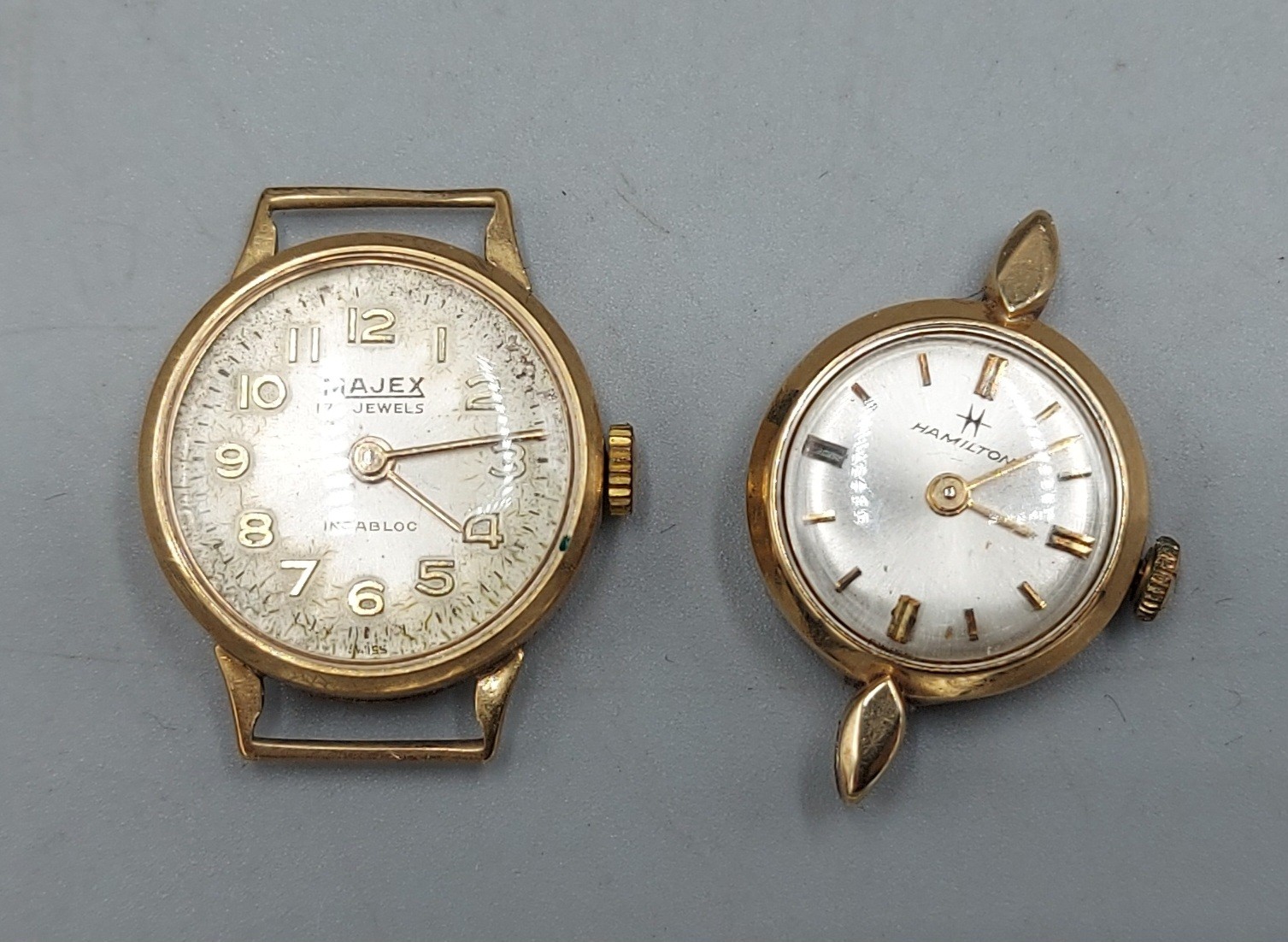 A 9ct gold cased ladies wristwatch by Majex together with another similar by Hamilton, 5.5gms excluding movements