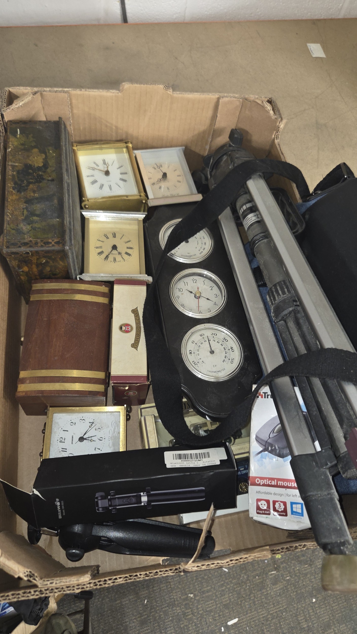 A Collection of Clocks, Weather Station, Tripods, and Sundries