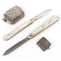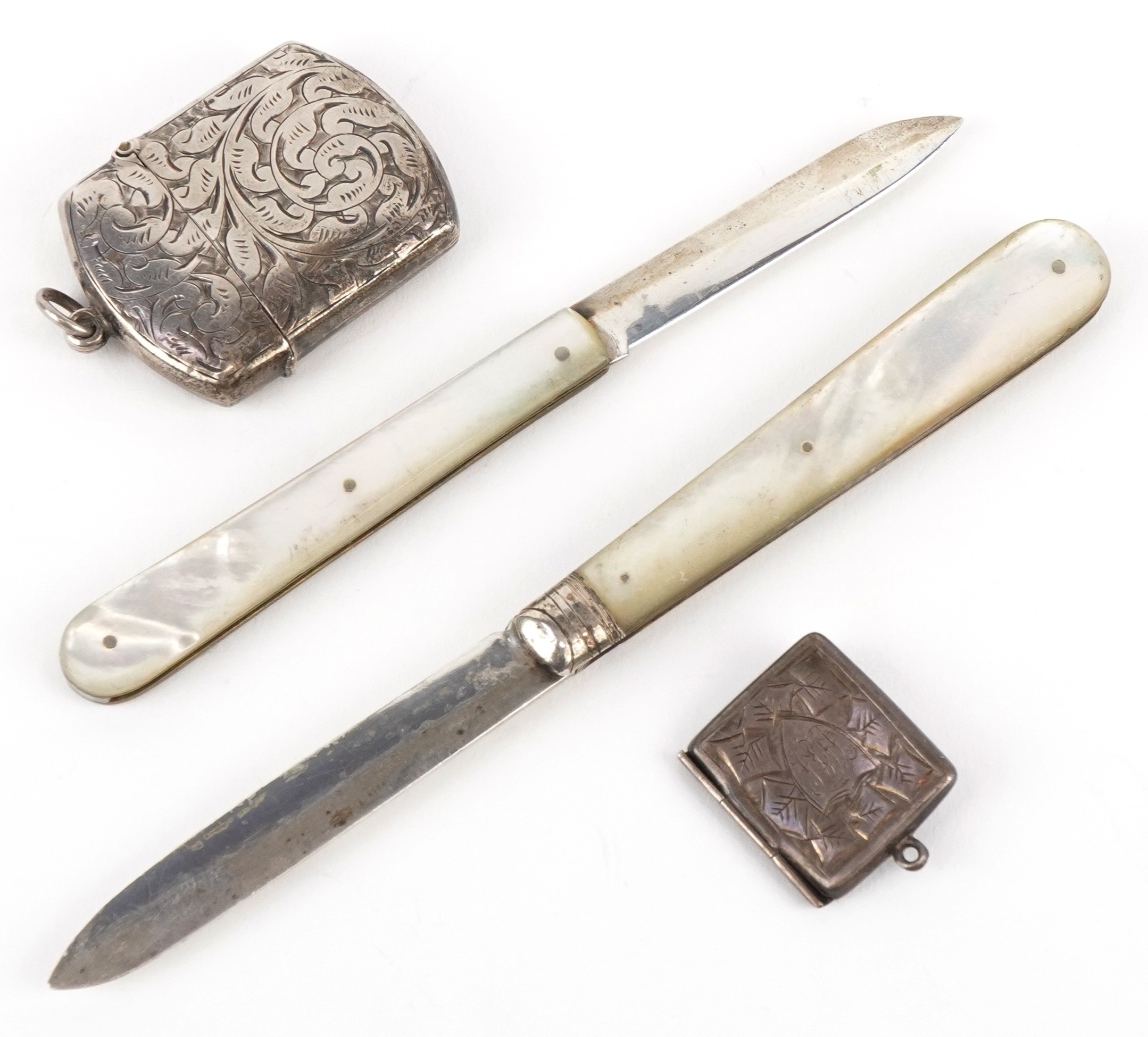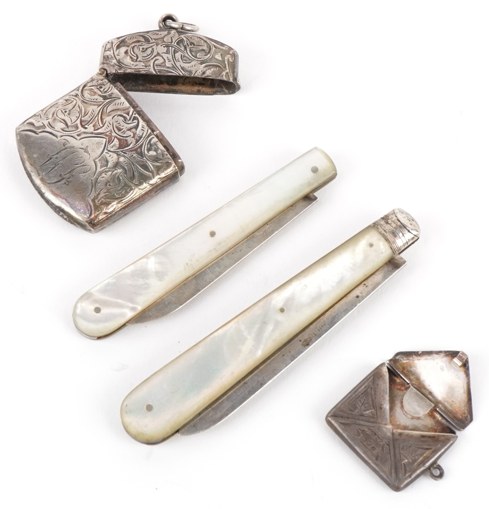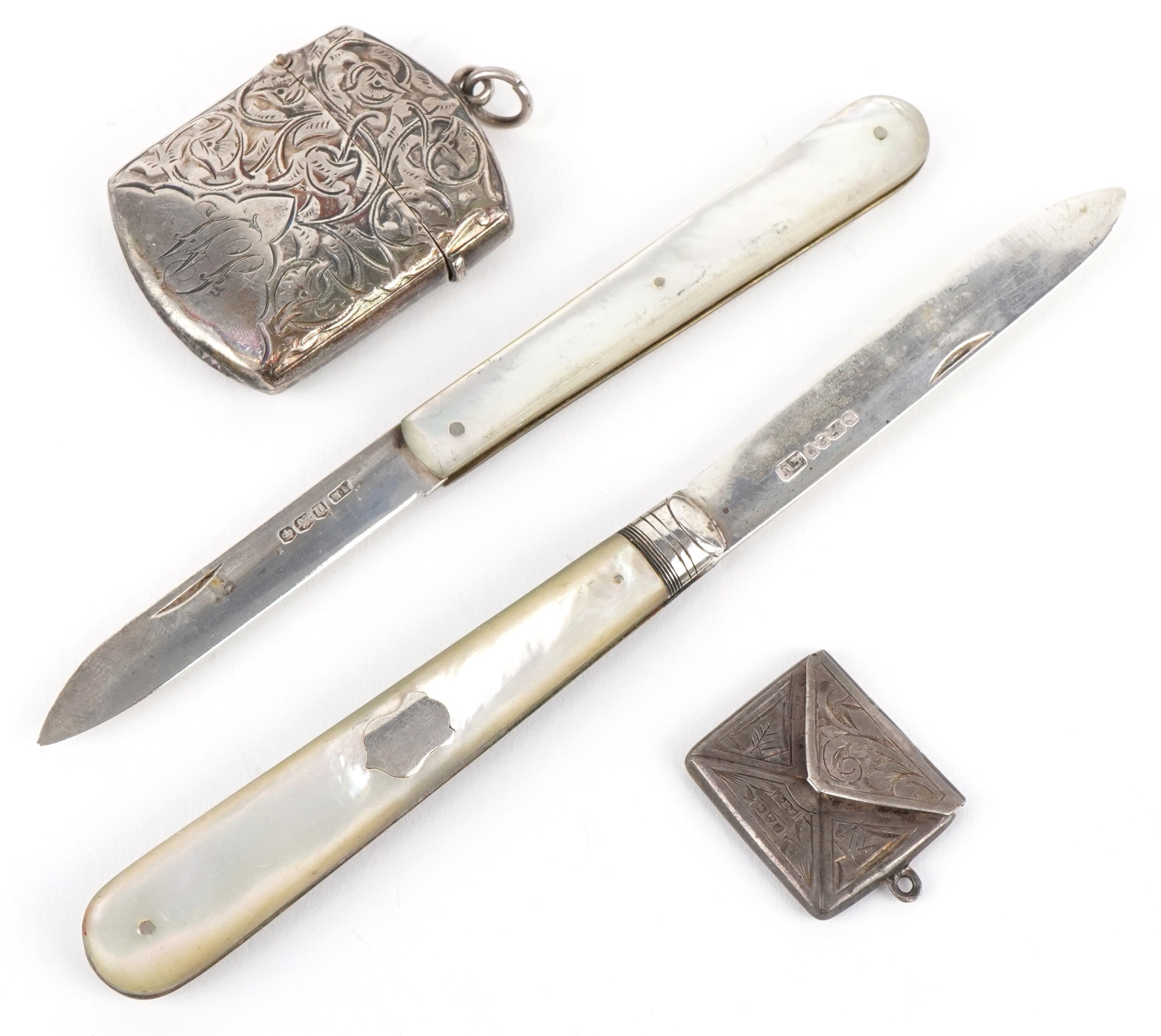 Victorian and later silver objects comprising two silver and mother of pearl folding pocket knives, a floral engraved vesta and a stamp case in the form of an envelope, the largest 9cm in length folded, total weight 90.4g.
