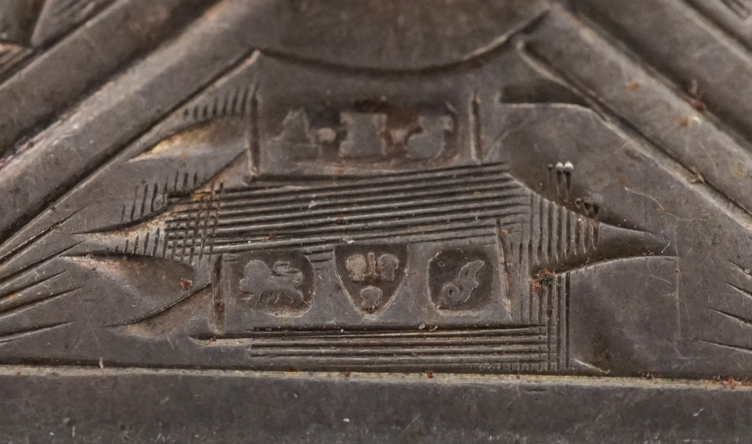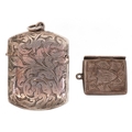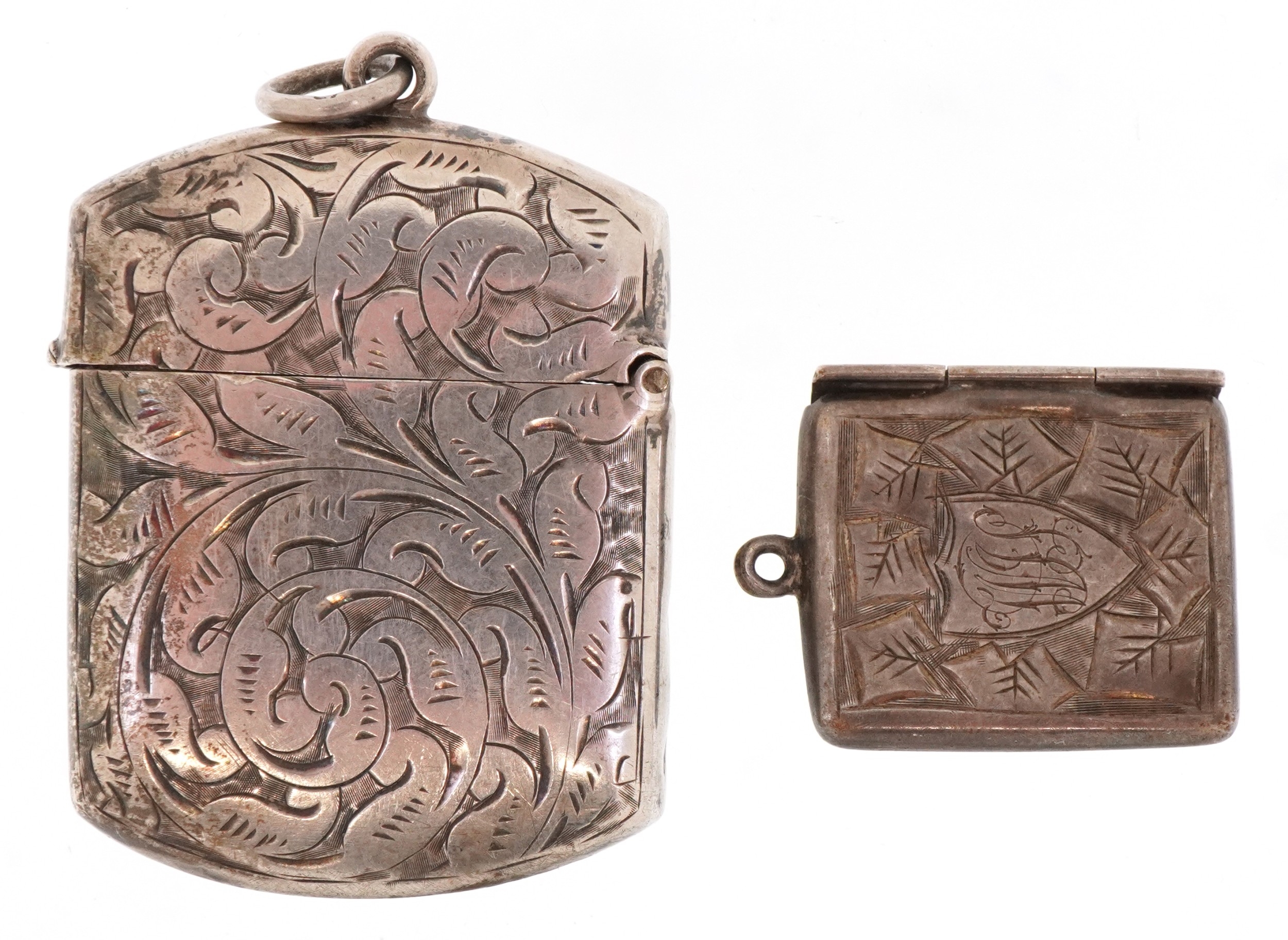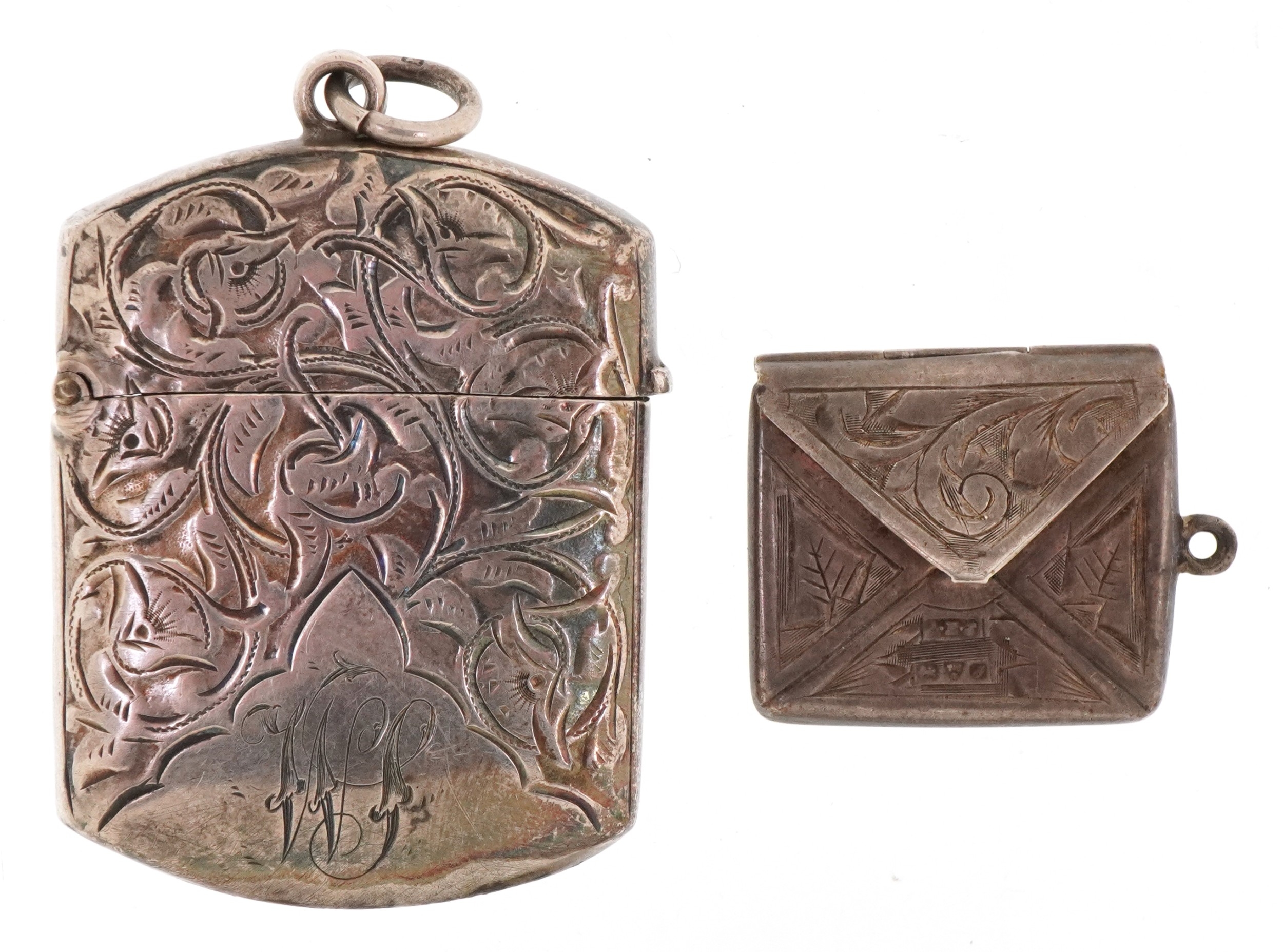 Victorian and later silver objects comprising two silver and mother of pearl folding pocket knives, a floral engraved vesta and a stamp case in the form of an envelope, the largest 9cm in length folded, total weight 90.4g.