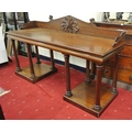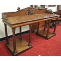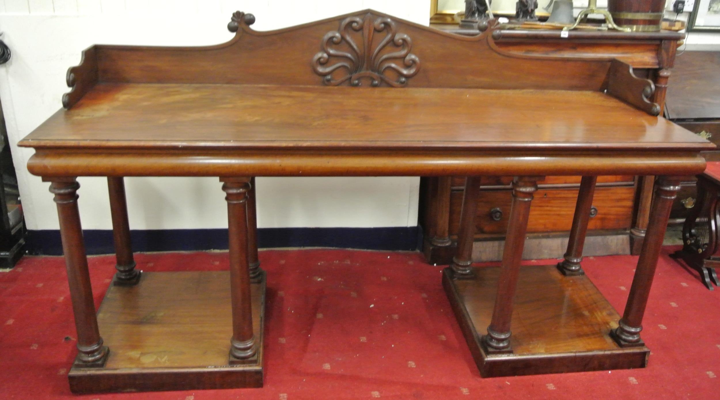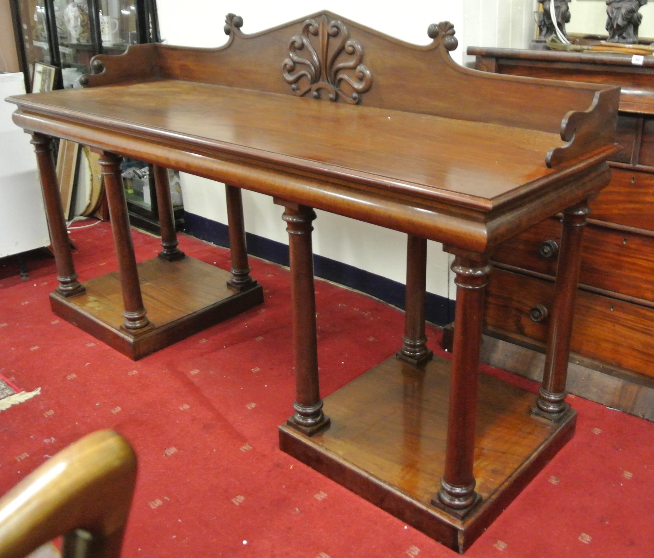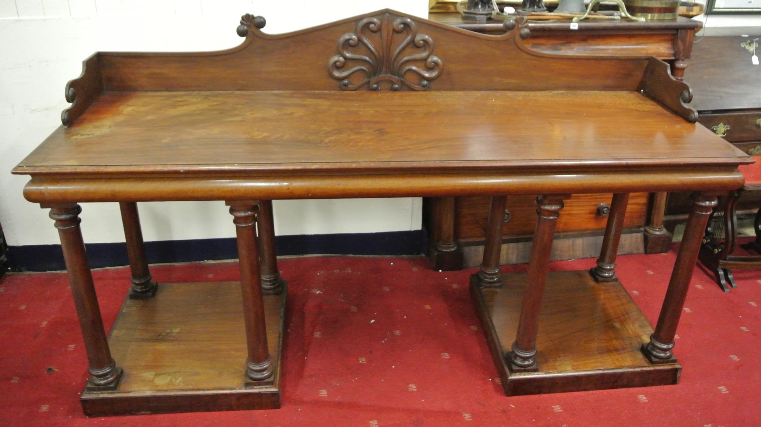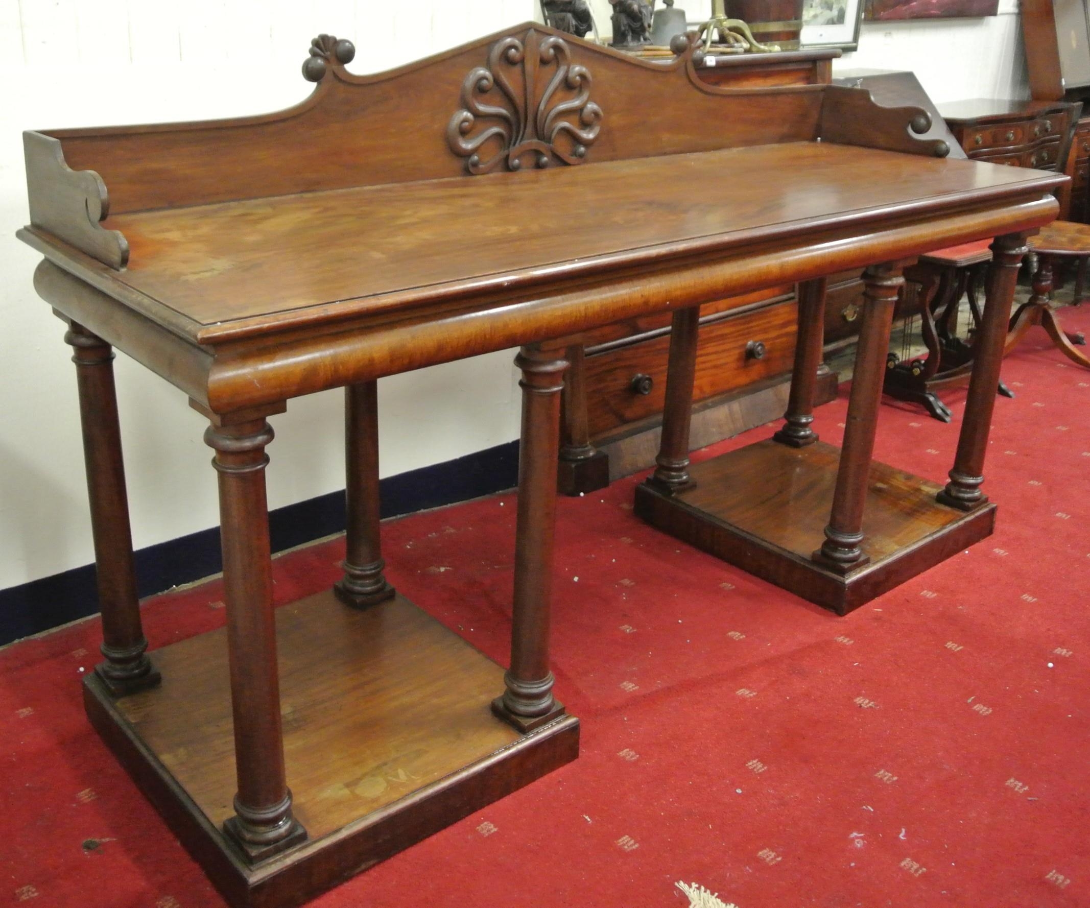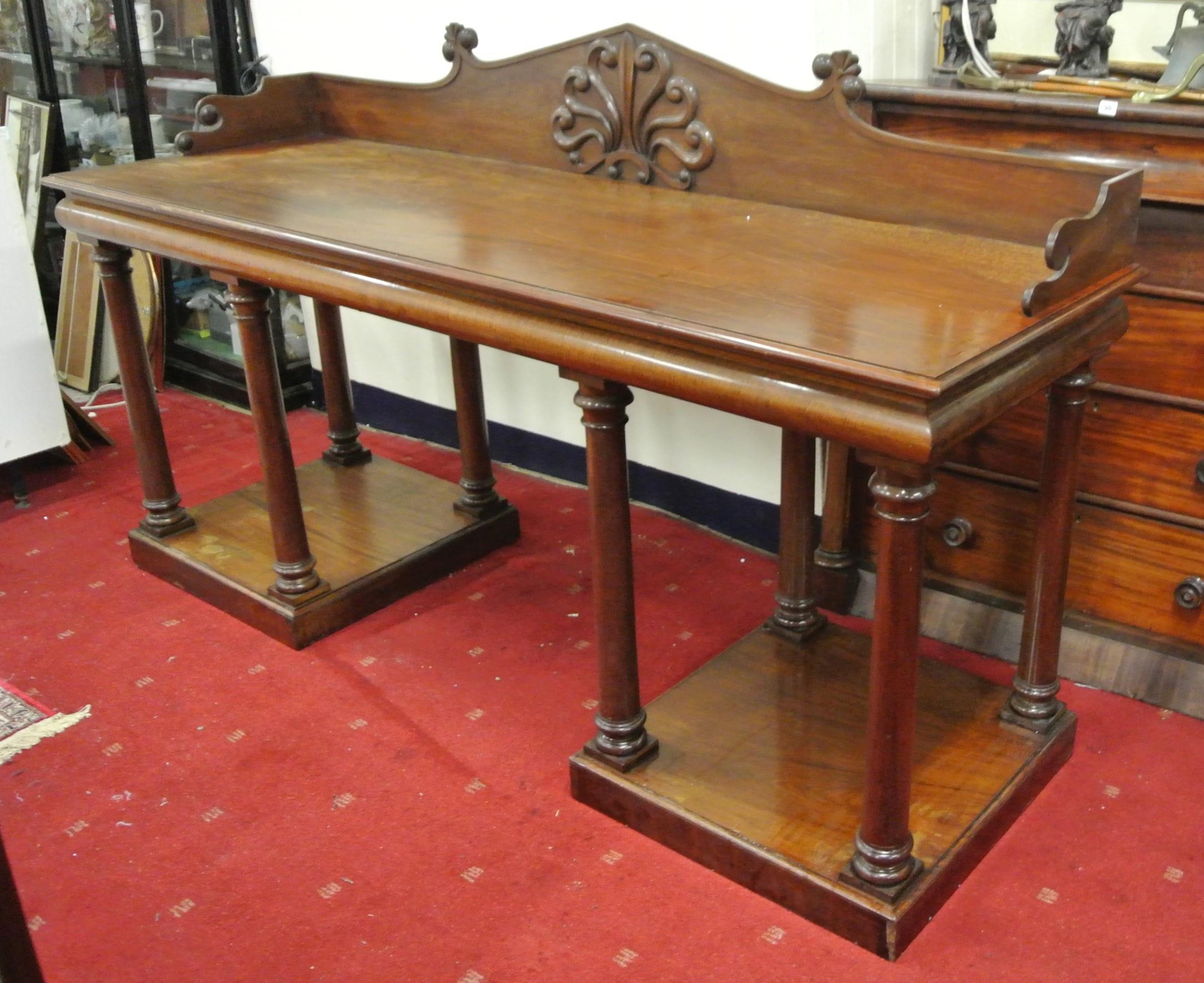 William IV mahogany sideboard with shaped tray back, with scroll decoration, with frieze, on turned tapering columns, on square plinths