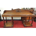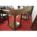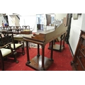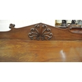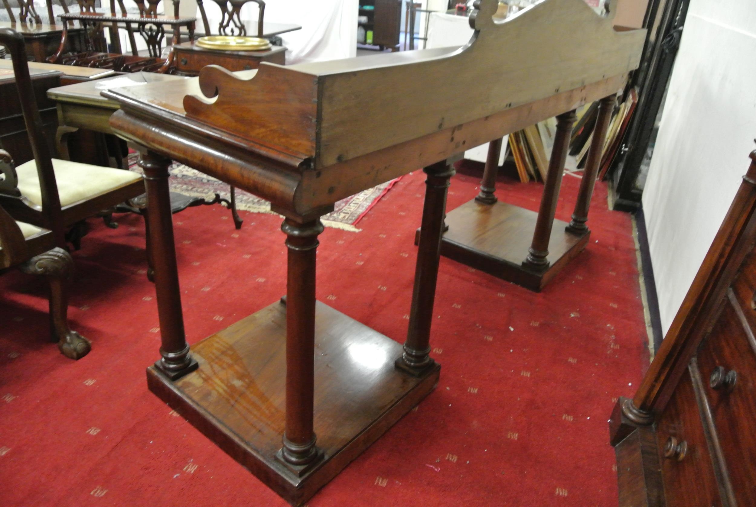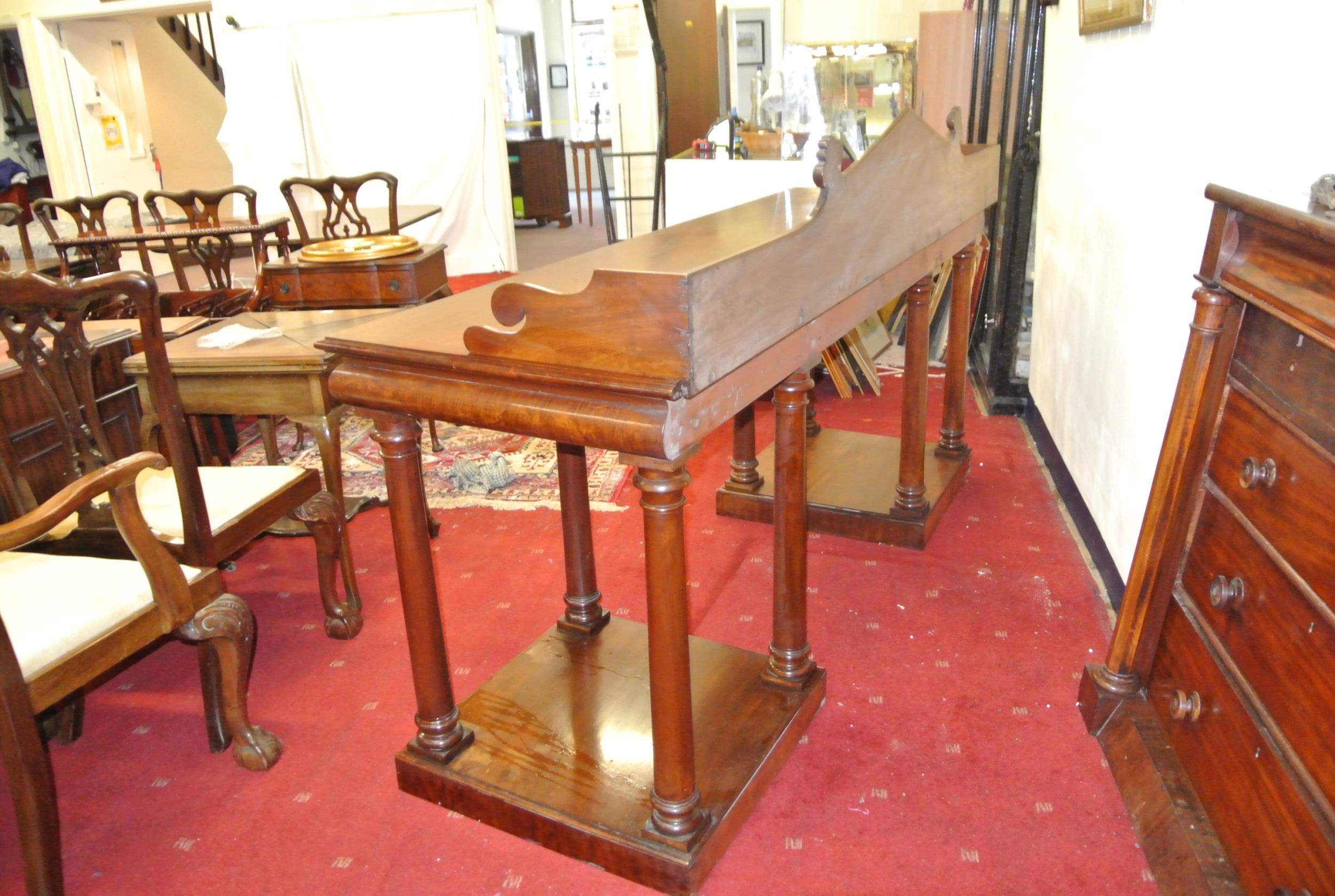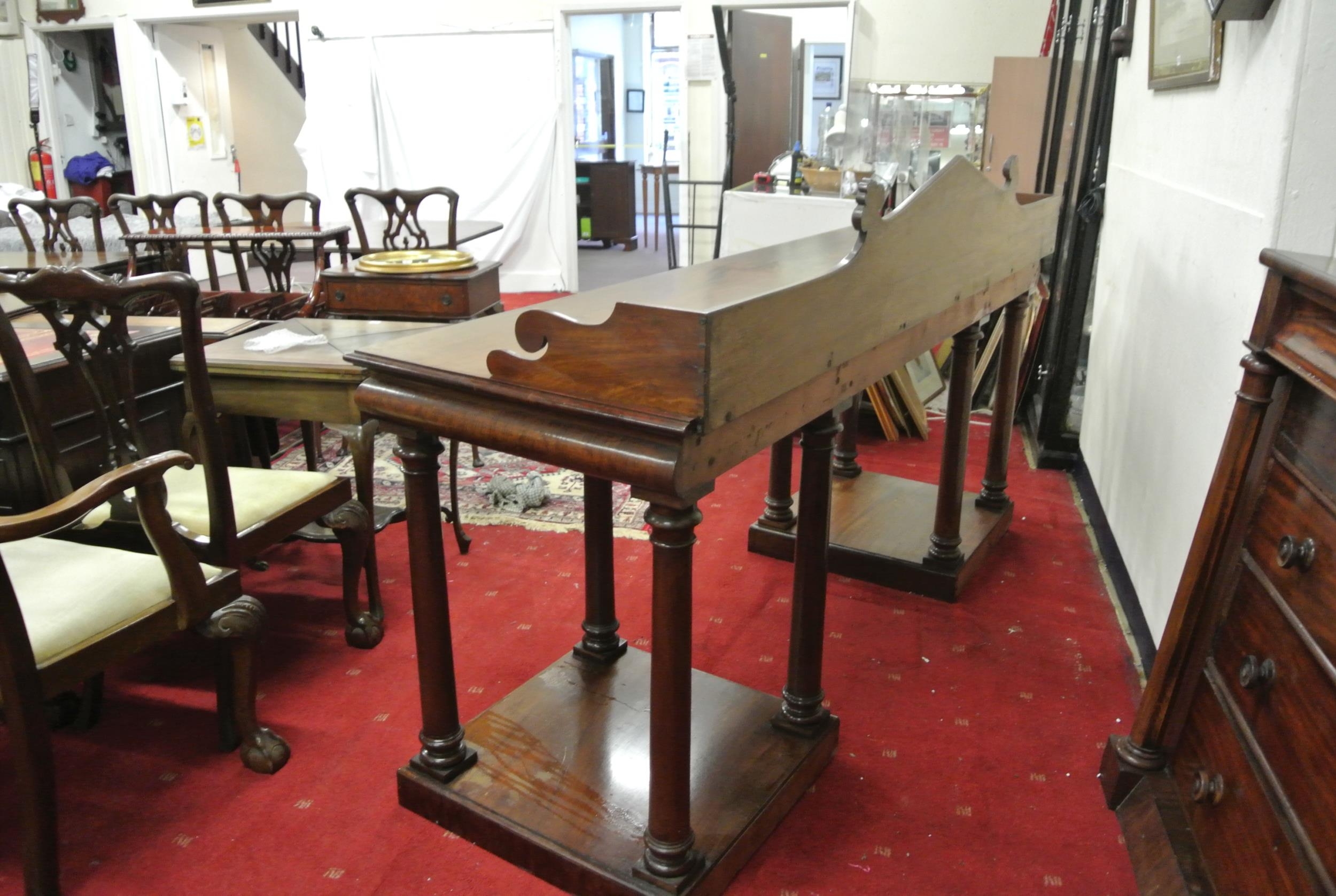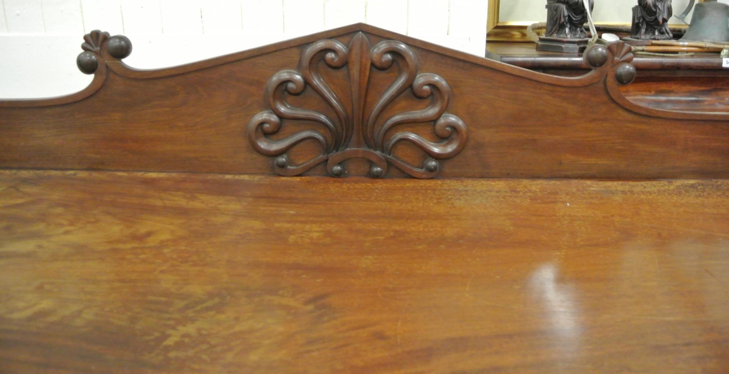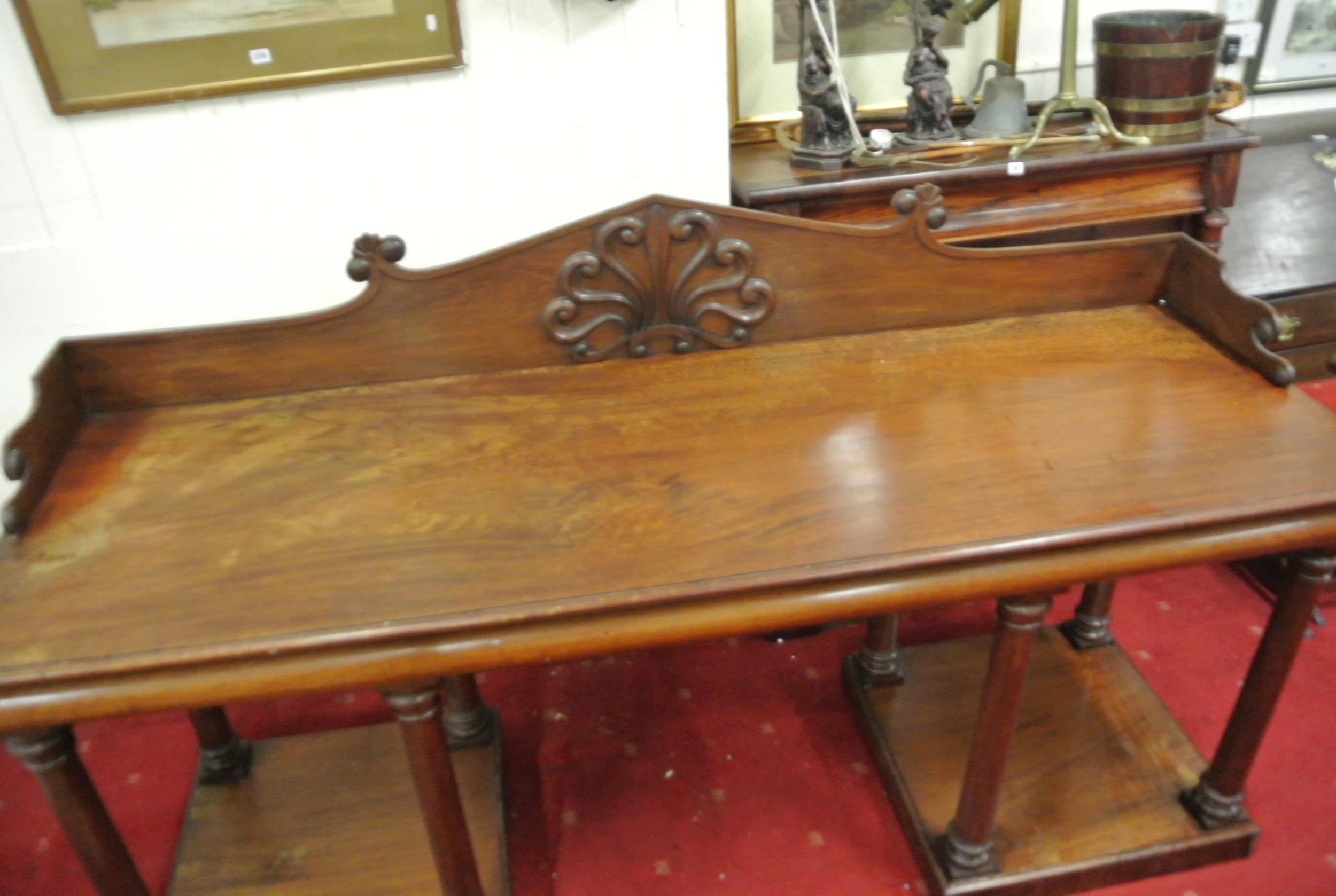 William IV mahogany sideboard with shaped tray back, with scroll decoration, with frieze, on turned tapering columns, on square plinths
