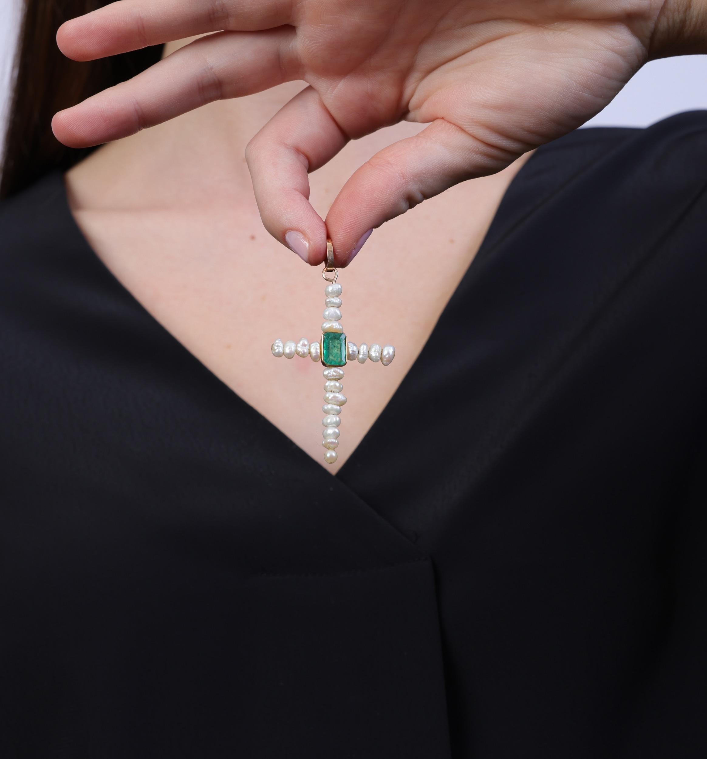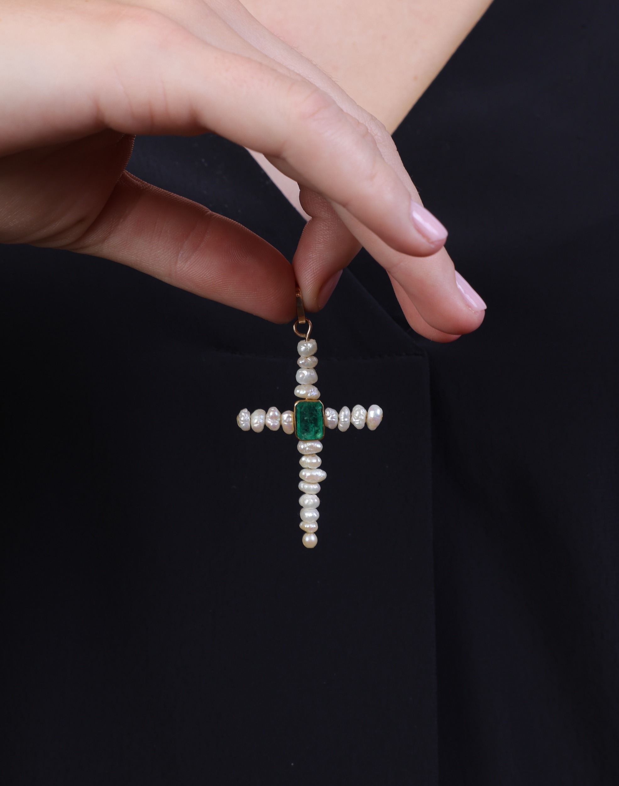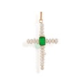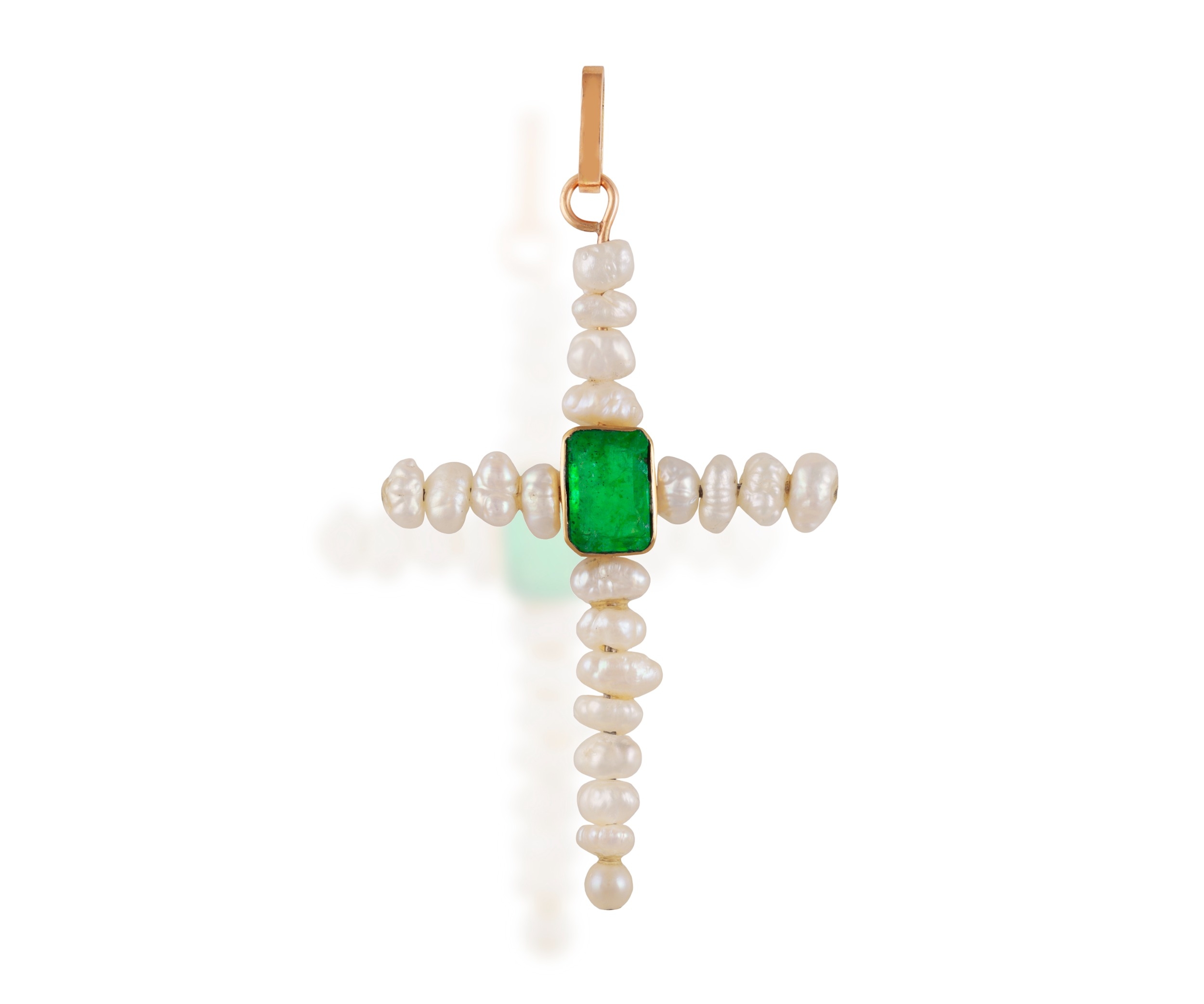 A FRESHWATER CULTURED PEARL AND EMERALD CROSS PENDANT The cross set with freshwater cultured pearls of white tint, centring a collet-set rectangular-shaped emerald, mounted in 14K gold, length 6.5cm * This lot is sold without a reserve