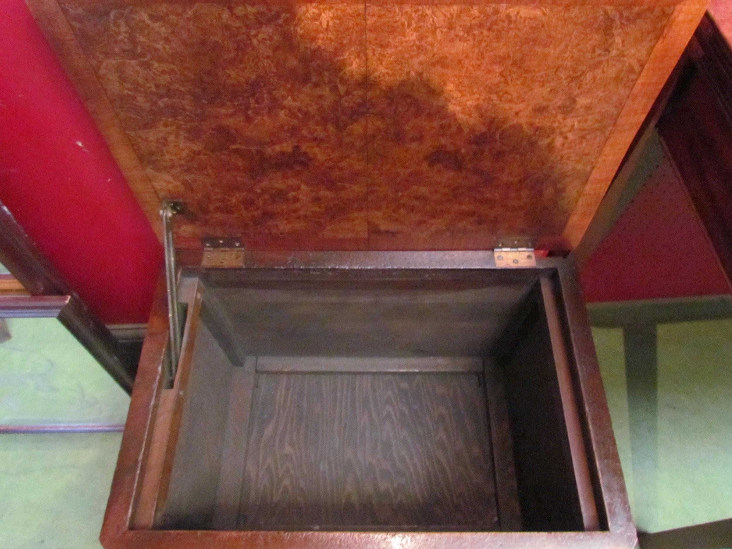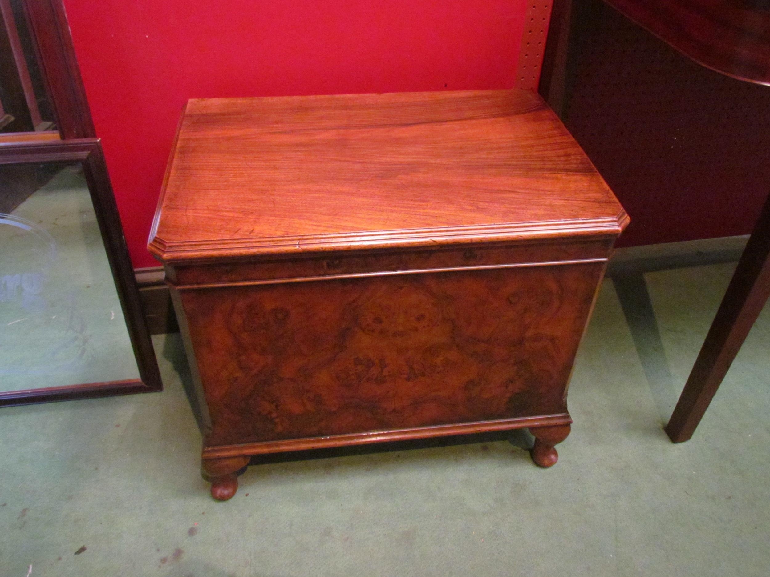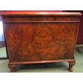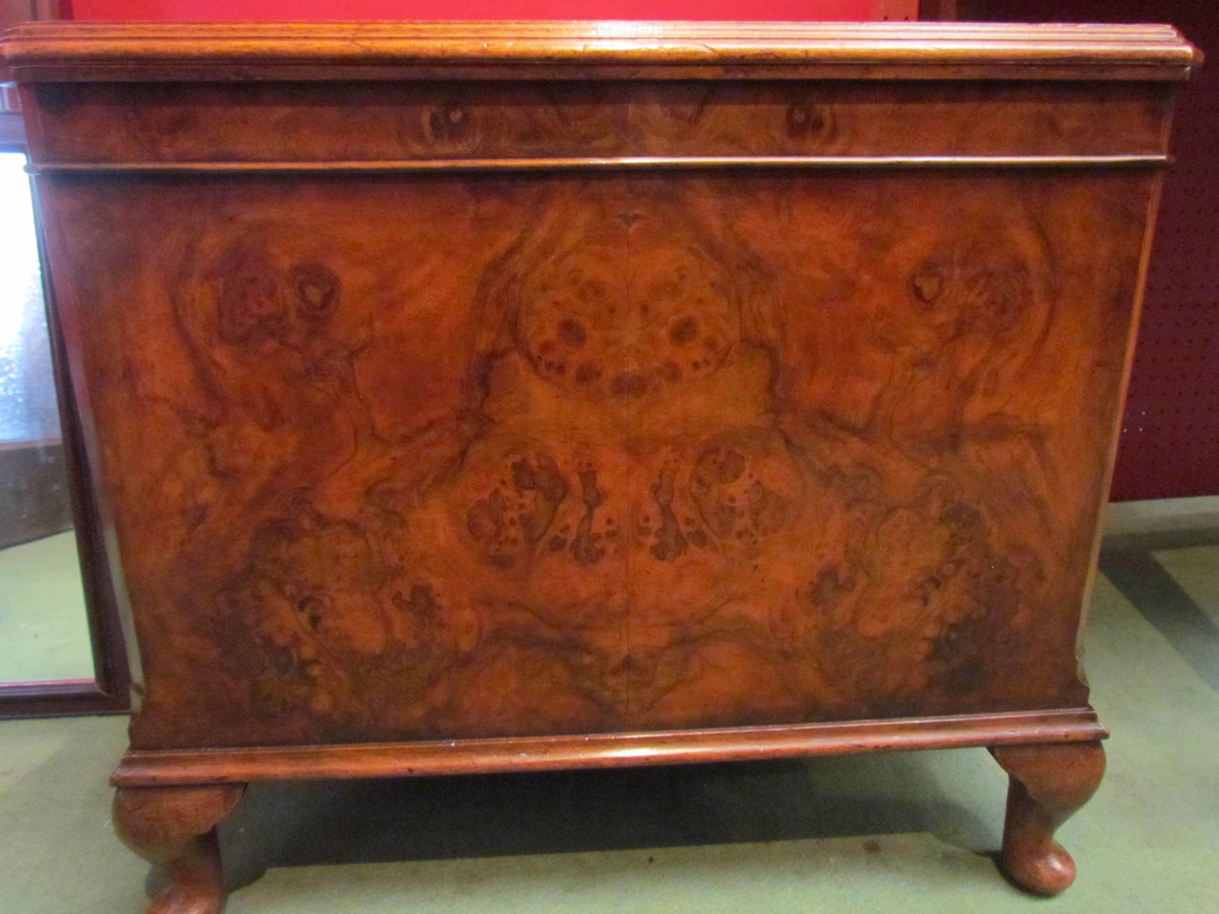 A burr walnut hinged top shoe cabinet with canted corners over squat cabriole feet, 46cm high x 52cm wide x 35cm deep