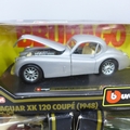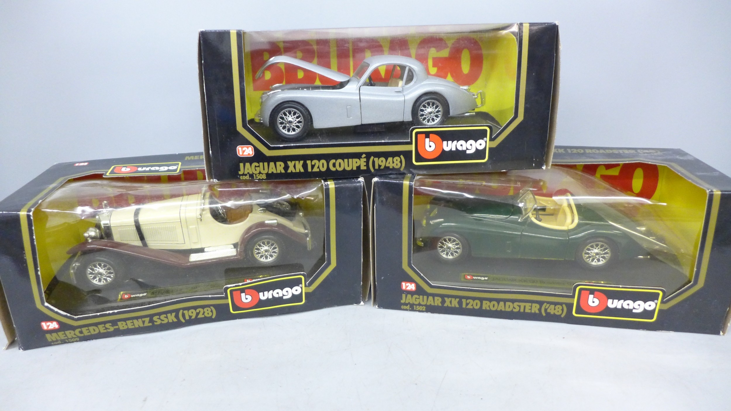 Three Burago 1/24 scale die-cast model cars, Jaguar XK120 Roadster ('48), Jaguar XK120 coupé (1948) and Mercedes-Benz 55K, (1928), boxed