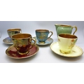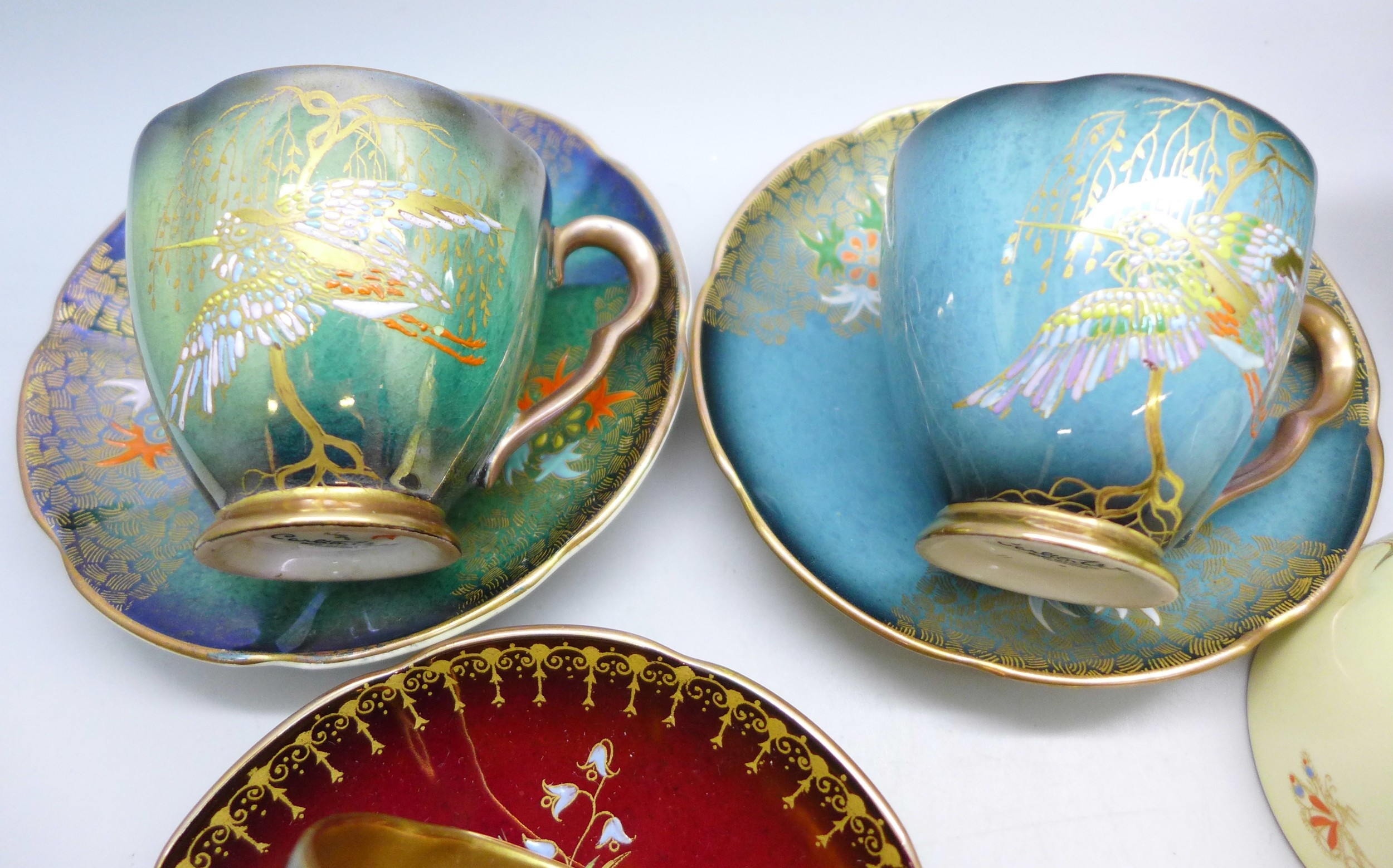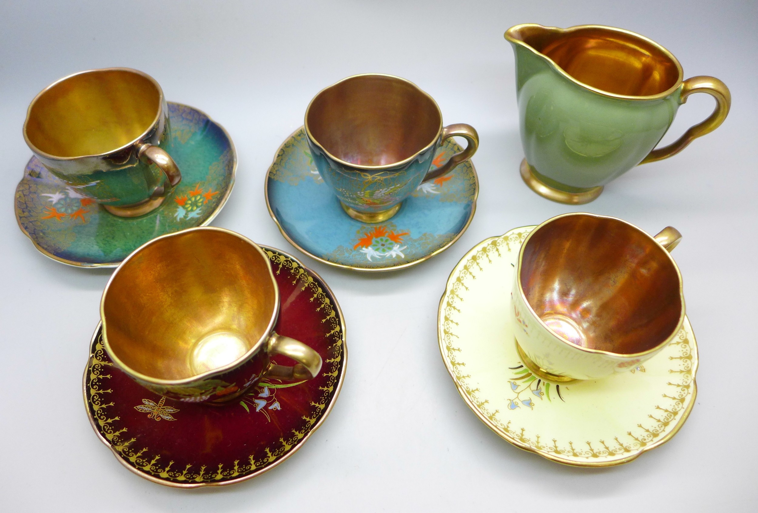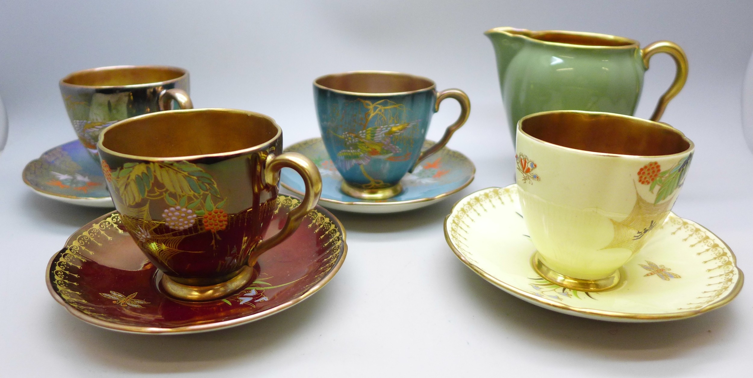 Two pairs of Art Deco Carlton Ware lustre coffee cups and saucers including two Spider's Web pattern in red lustre and in cream ground; and two with oriental bird design. Together with a Carlton Ware milk jug. All with gilt interior