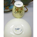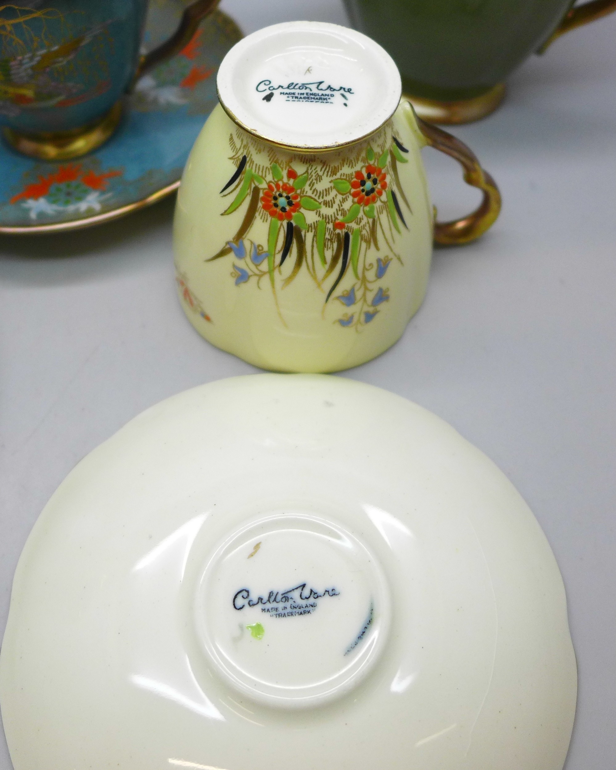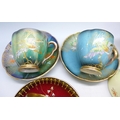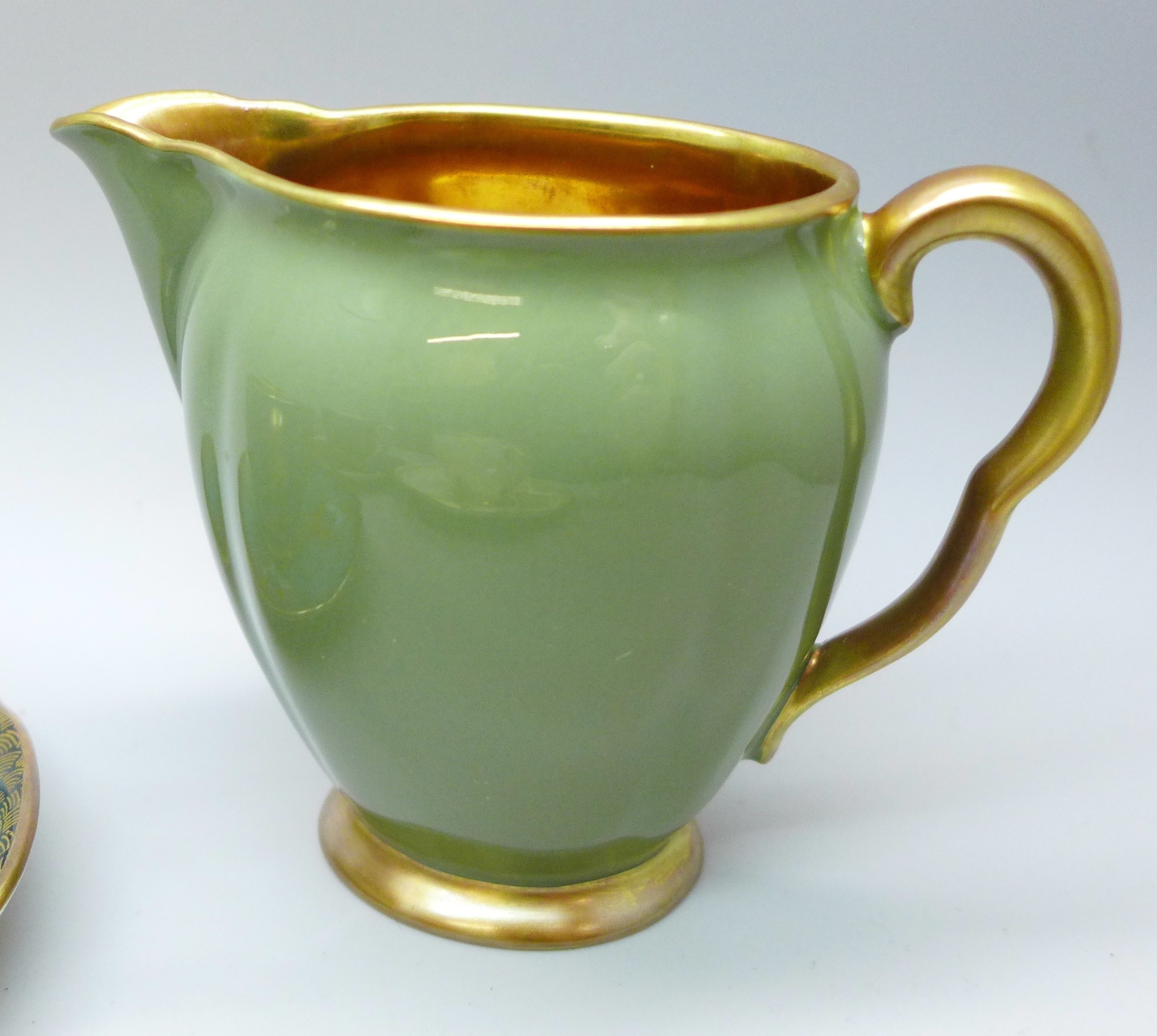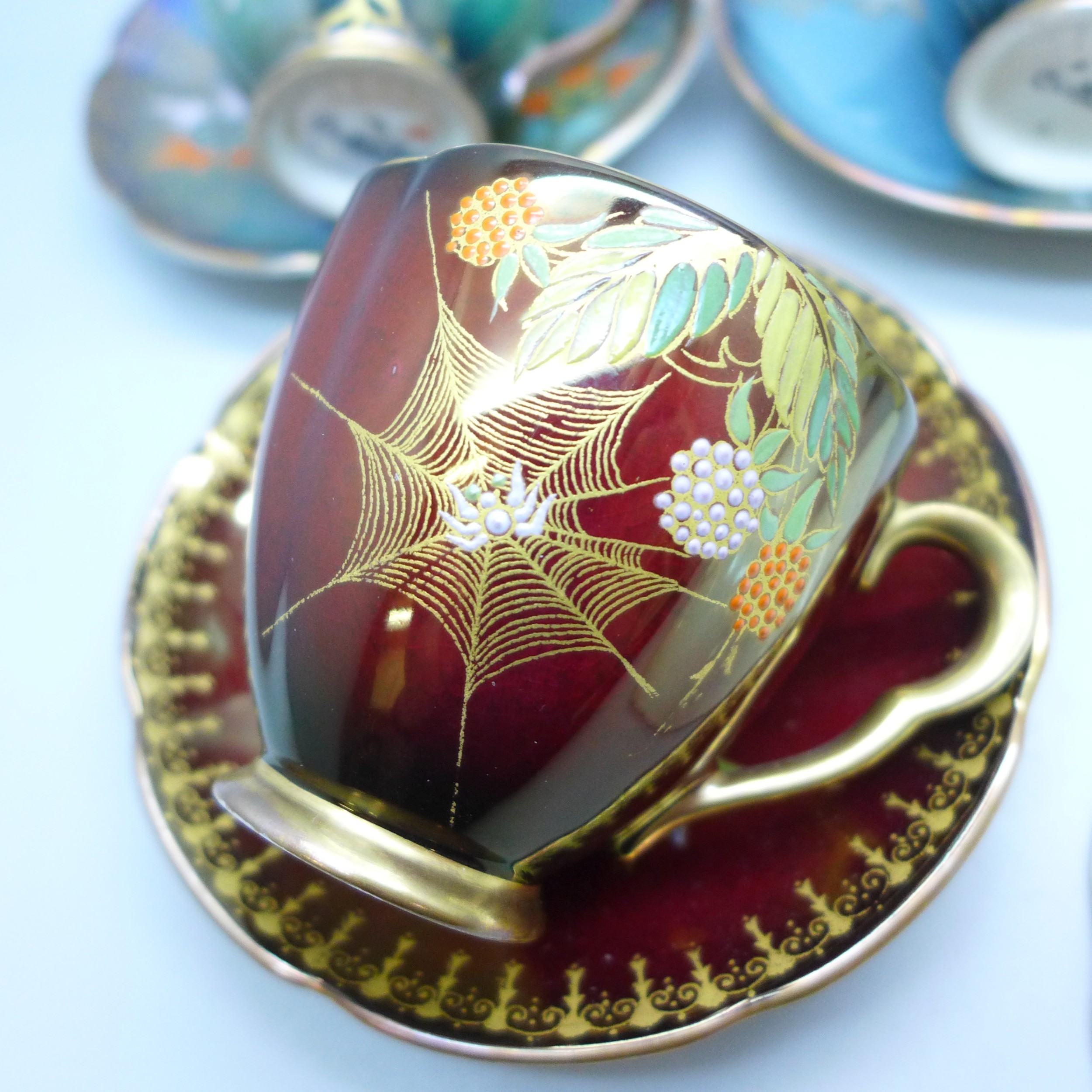 Two pairs of Art Deco Carlton Ware lustre coffee cups and saucers including two Spider's Web pattern in red lustre and in cream ground; and two with oriental bird design. Together with a Carlton Ware milk jug. All with gilt interior