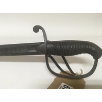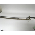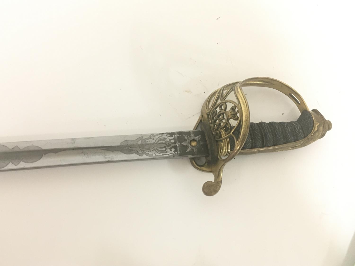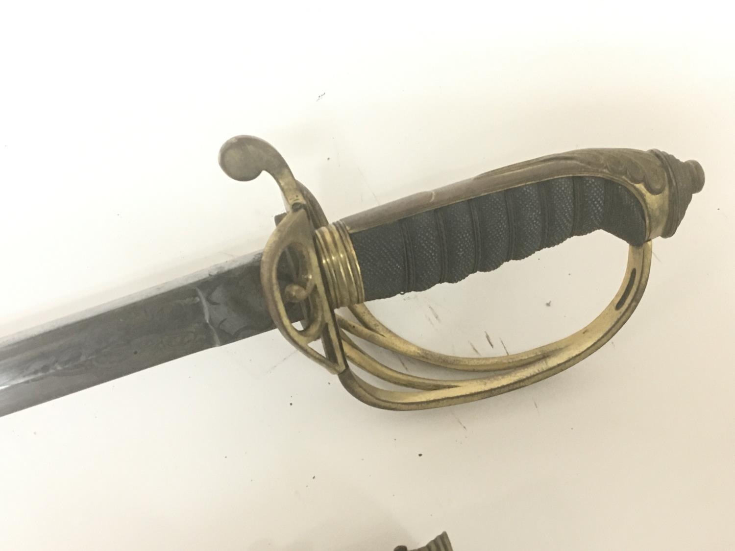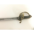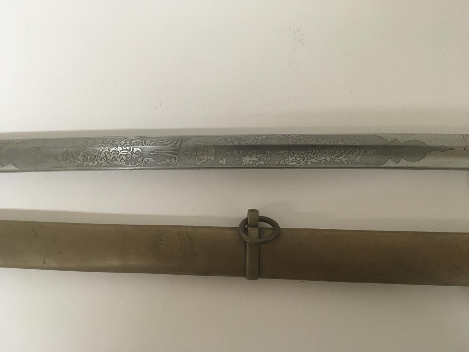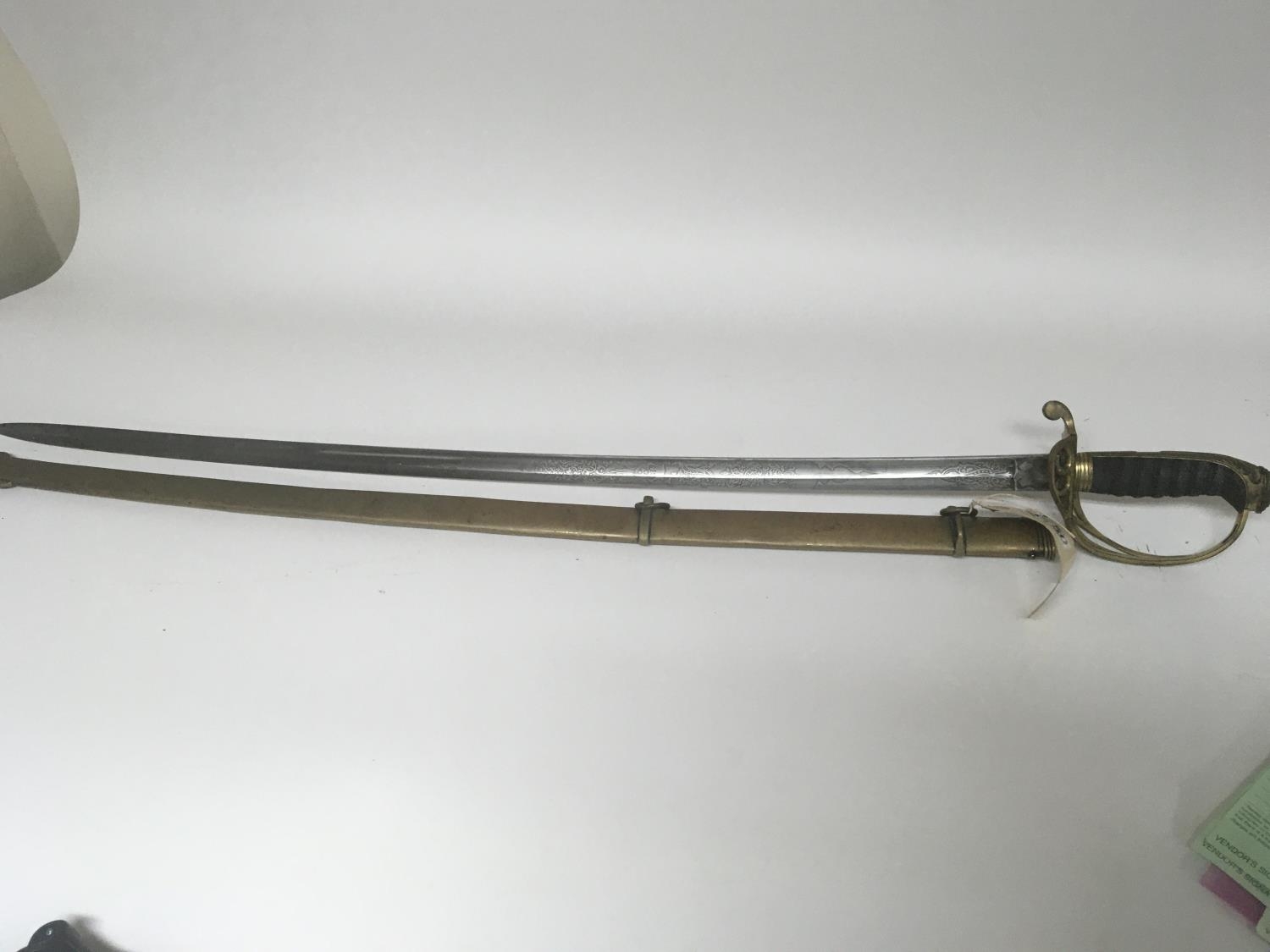 A Victorian brass field officers sword the decorative guard with Victorian cypher and hinge edge engraved blade and brass scabbard. Length 97cm