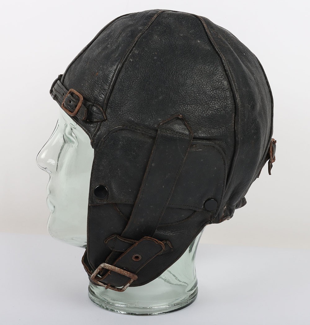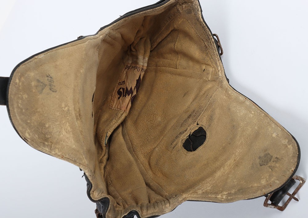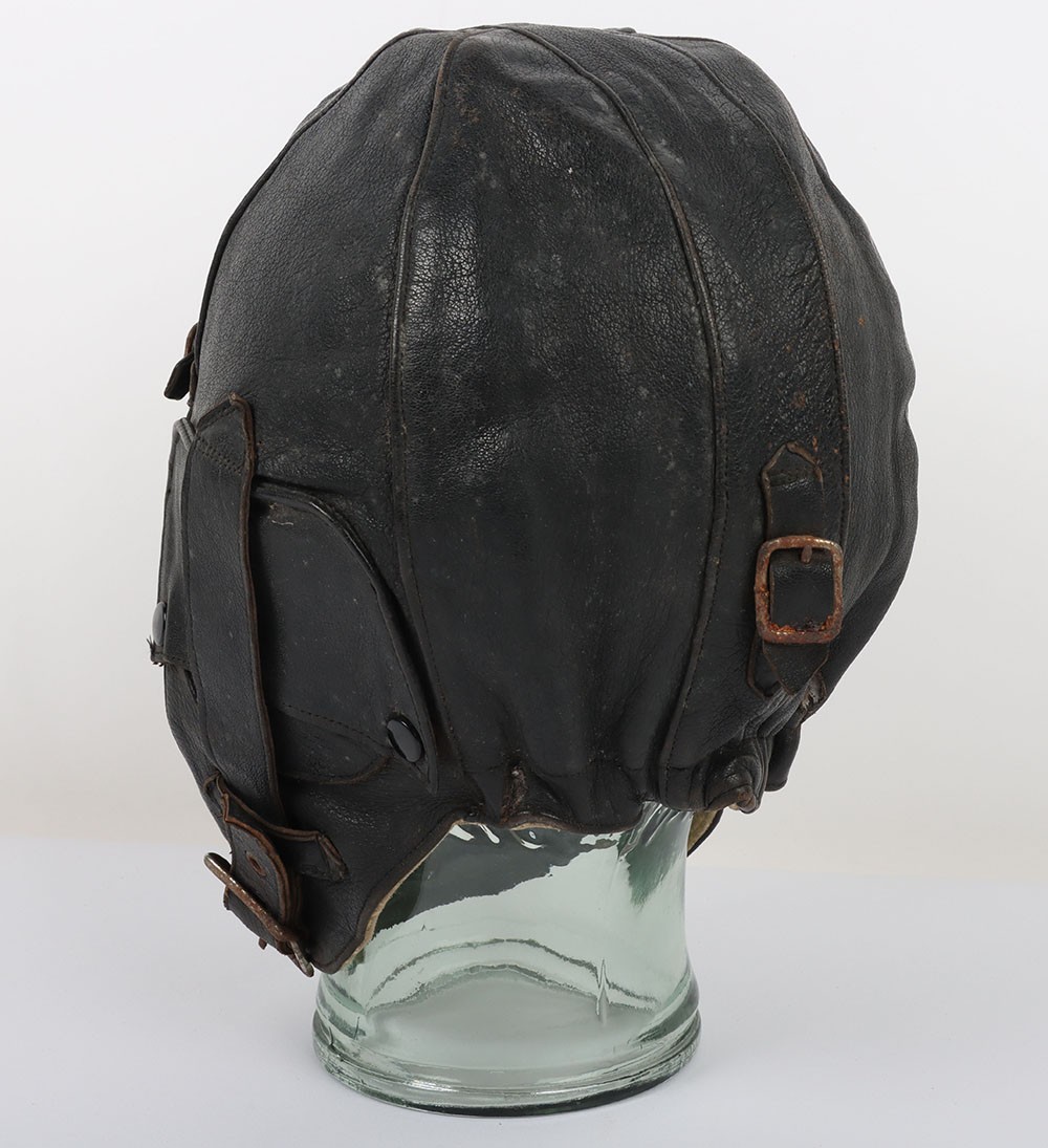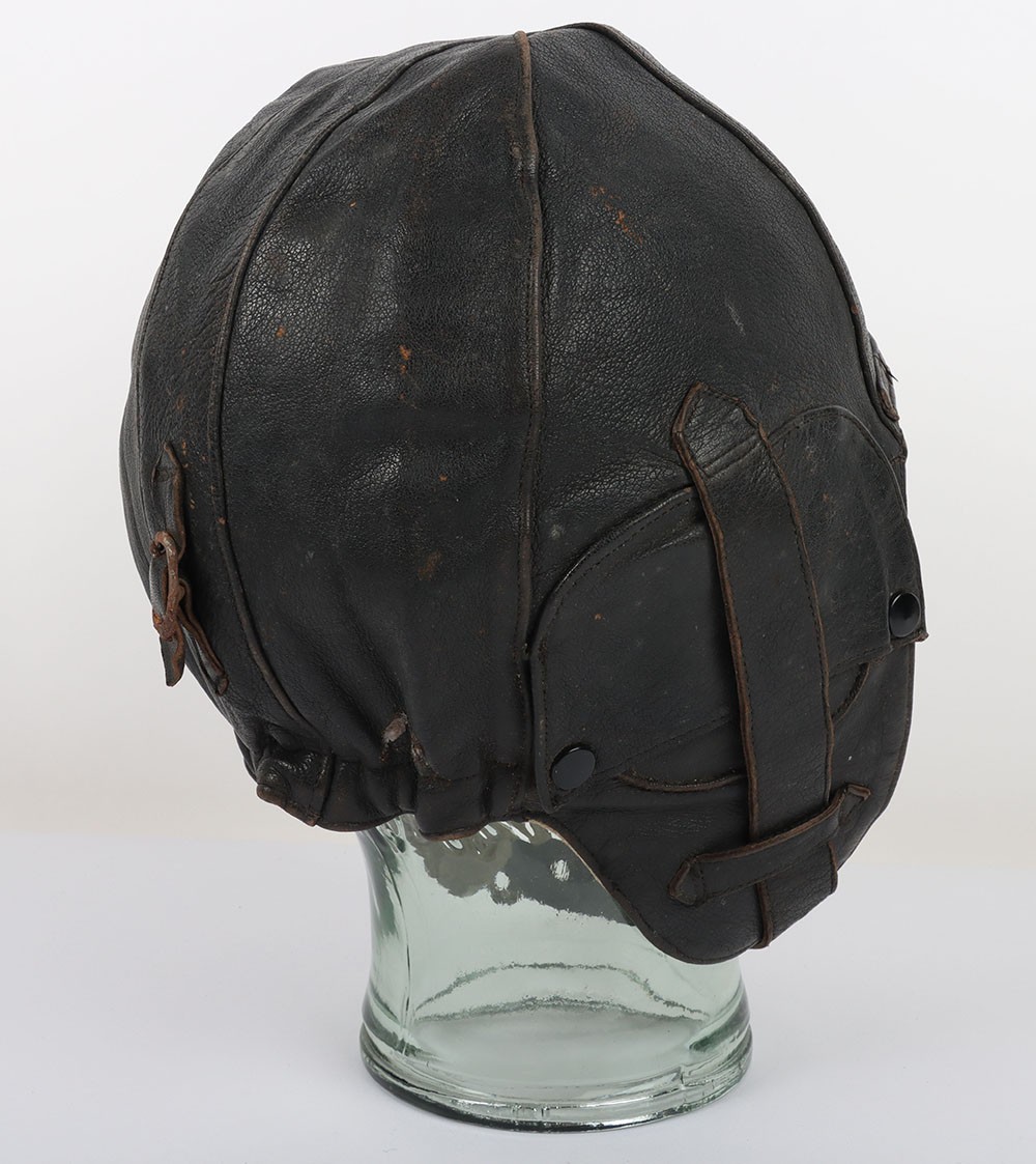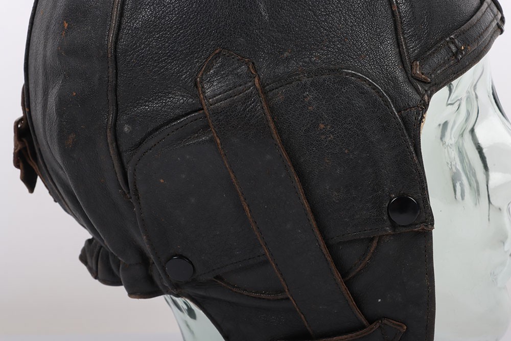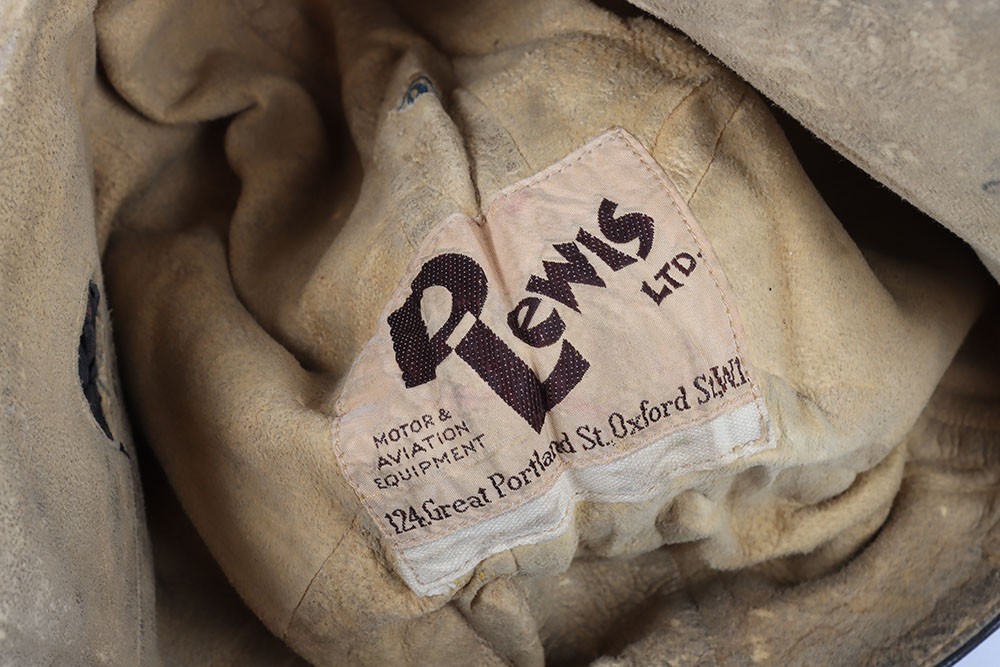 WW2 RAF 'Lewis Leathers' Flying Helmet, 'AM' and 1940 stamped. A good unusual example of a Lewis leathers flying helemt in a dark brown black leather. Featuring frontal adjustment strap and chin strap. These example though features a nice 'AM' and crown and a 1940 date to th chamois leather lining. The large original lewis Leathers' branded tailors labael sits inside the upper crown. Good condition with age related wear.