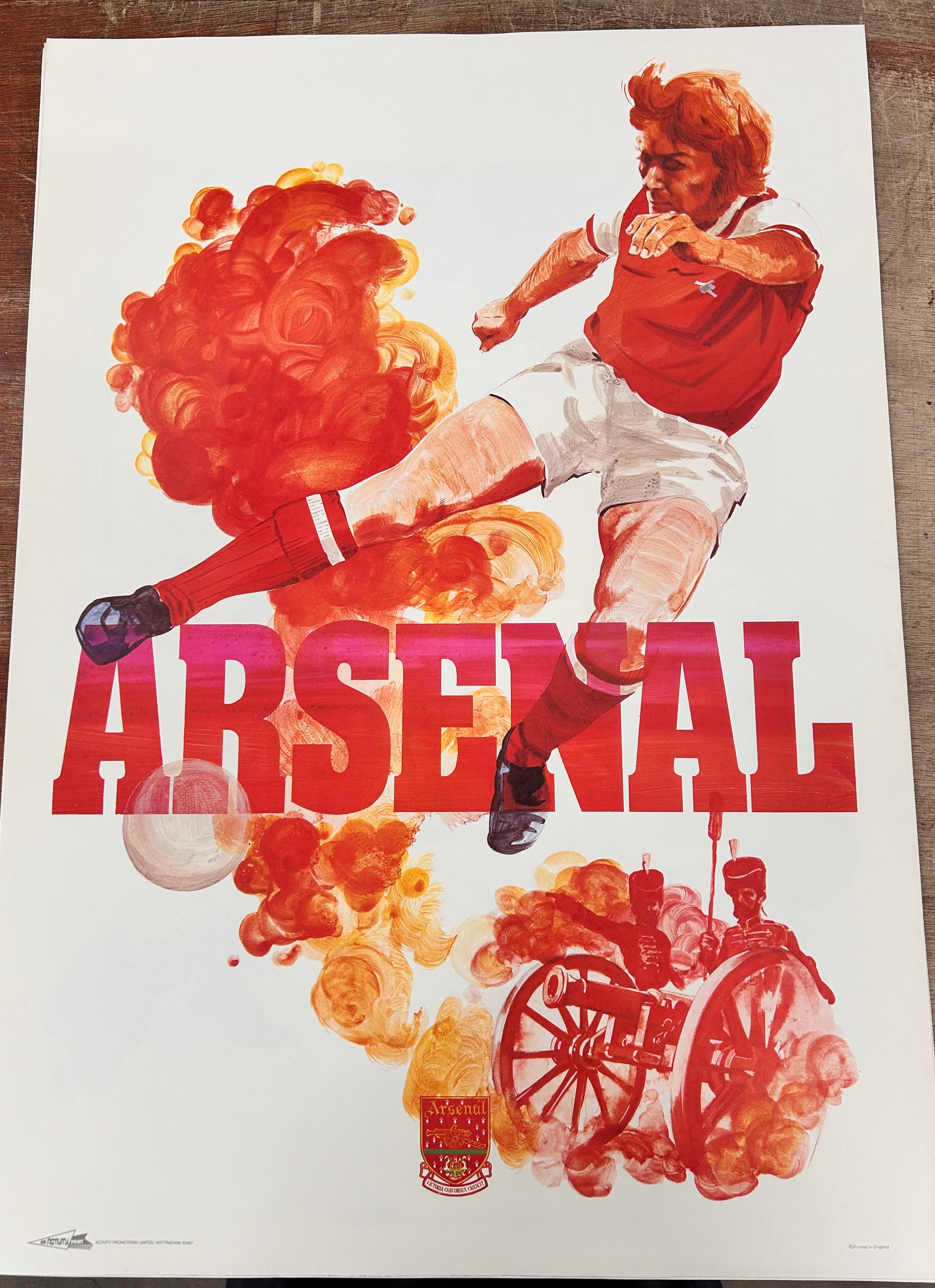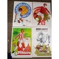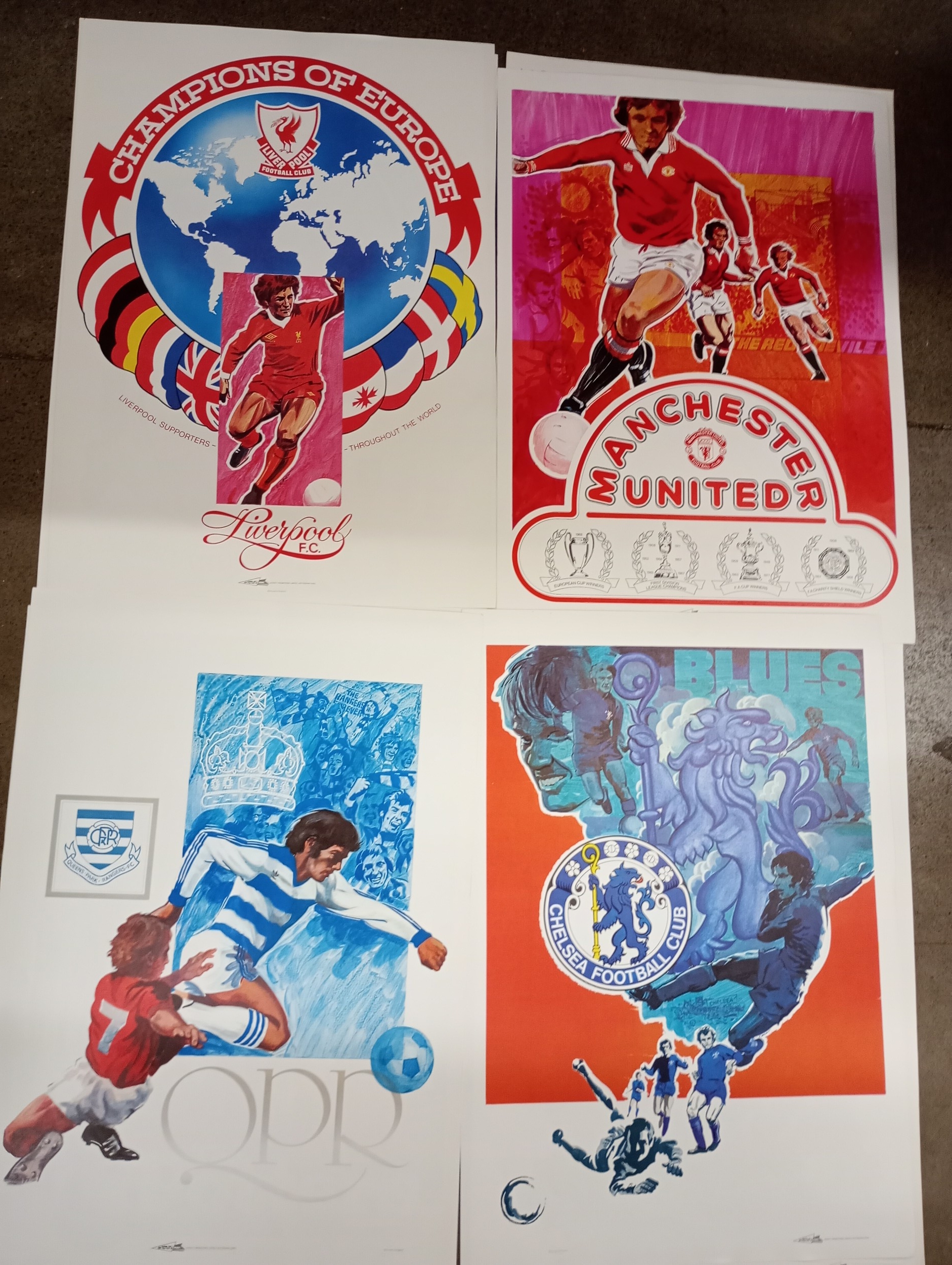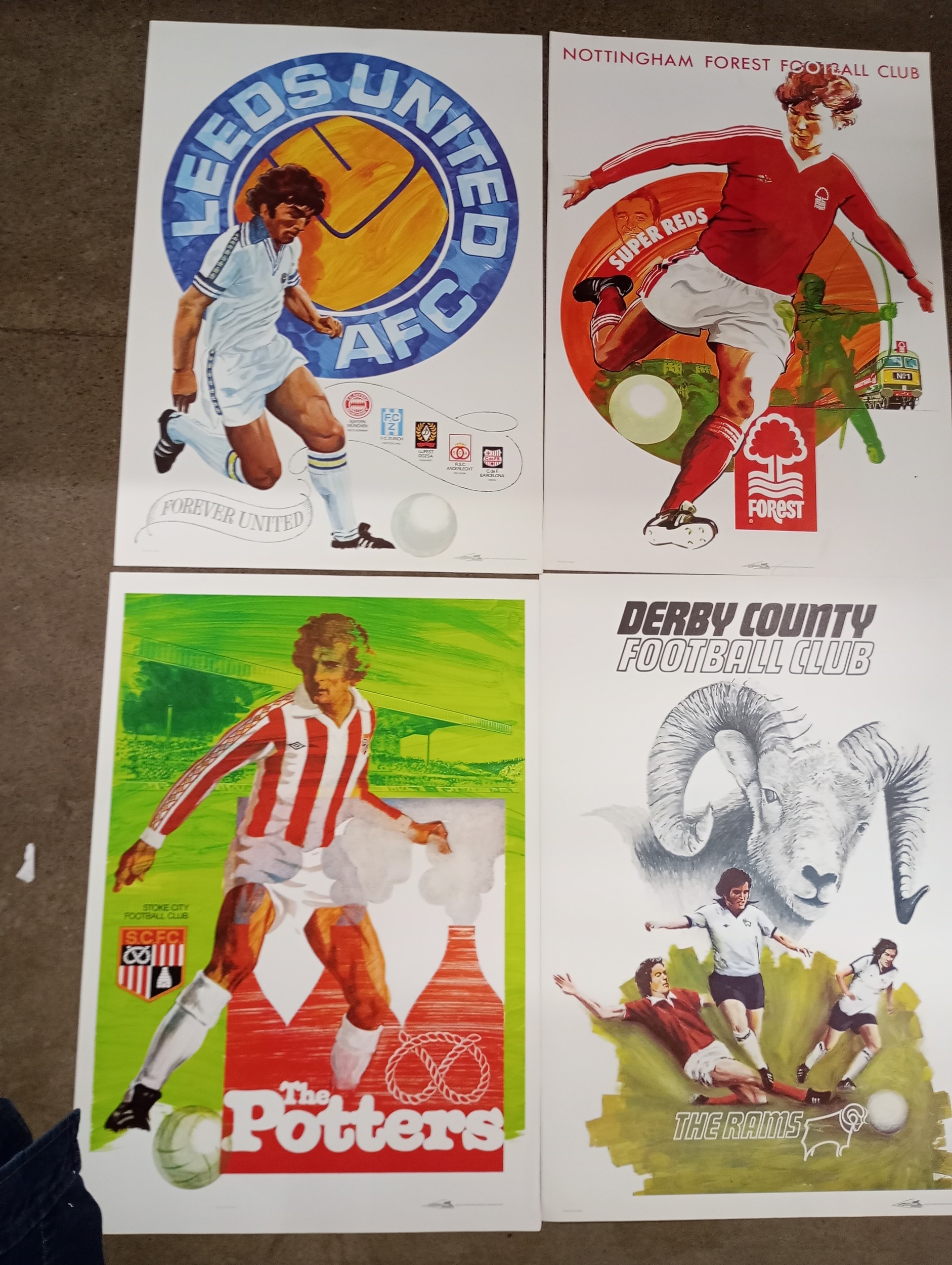 Nine original vintage football club posters printed in the 1980s by Activity Promotions of Nottingham; Nottingham Forest, Derby County F.C., Chelsea, Stoke, QPR, Arsenal, Leeds, Manchester Utd and Liverpool F.C. - Champions of Europe (A2 size)