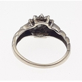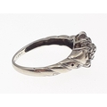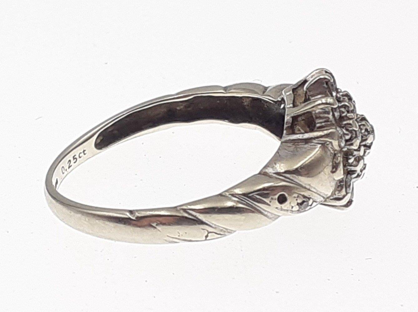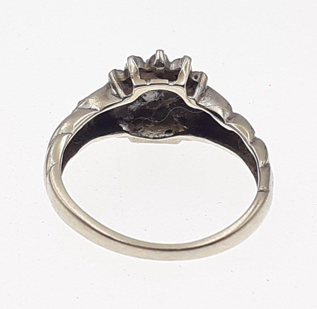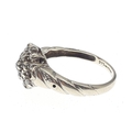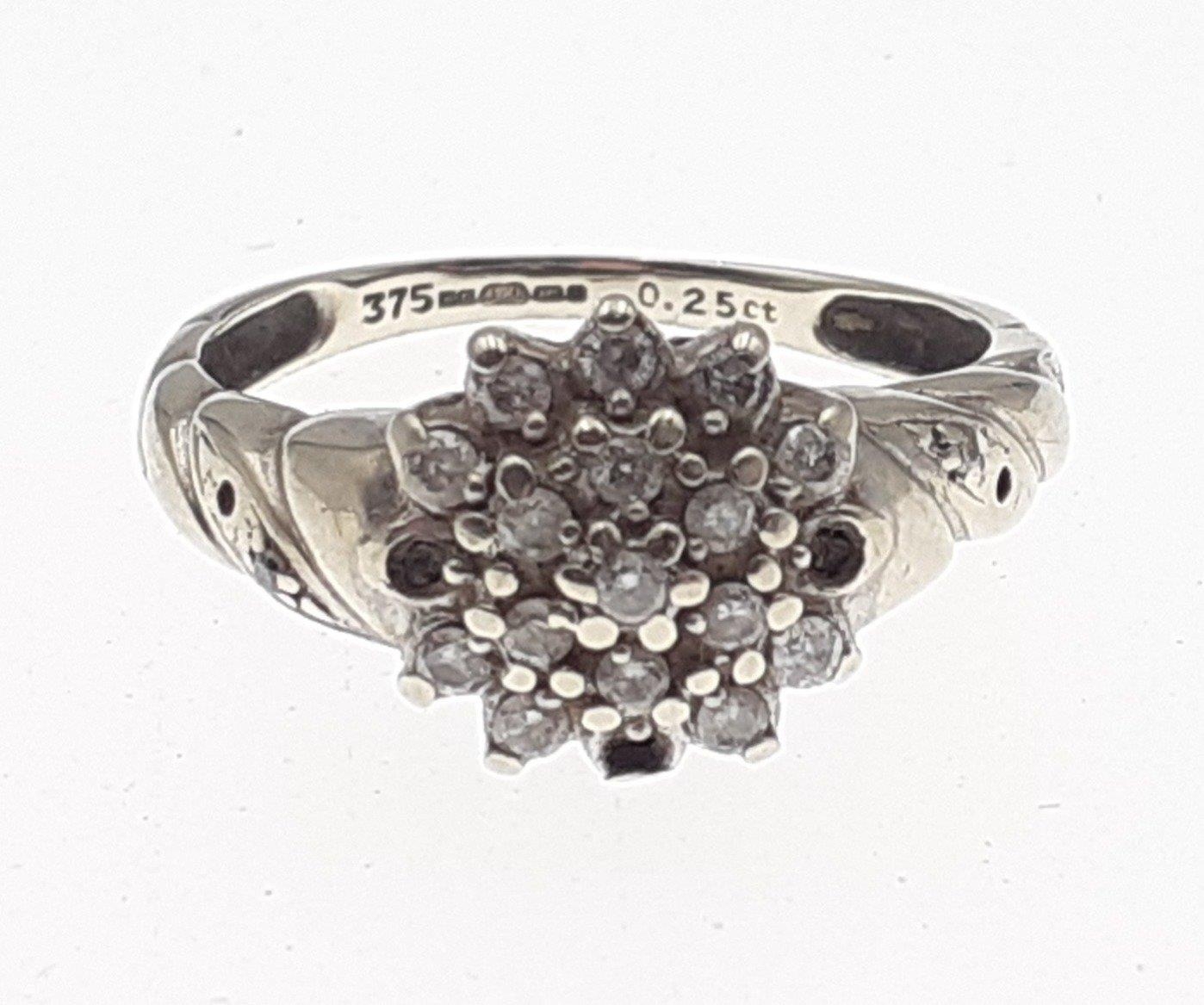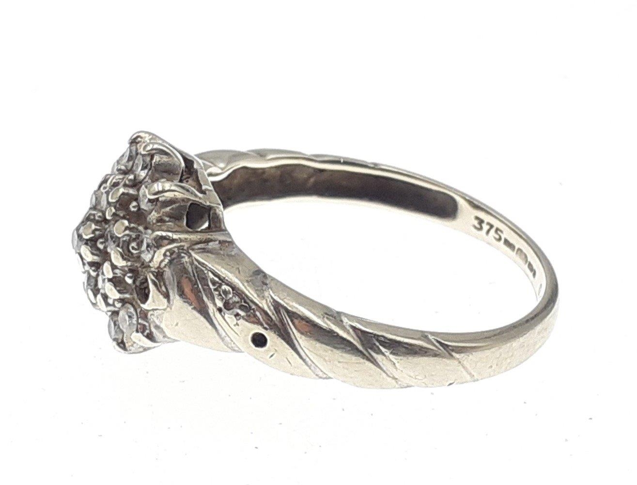 A 375 fully marked white gold ring set with a diamond cluster of small stones (some missing). Size L, gross weight 2.3g approx.