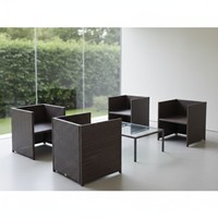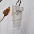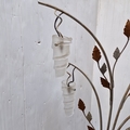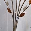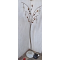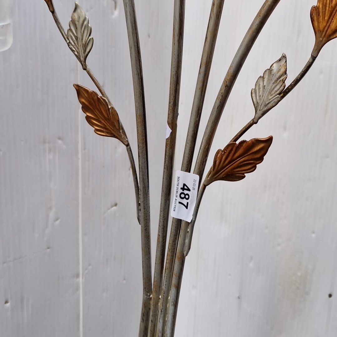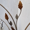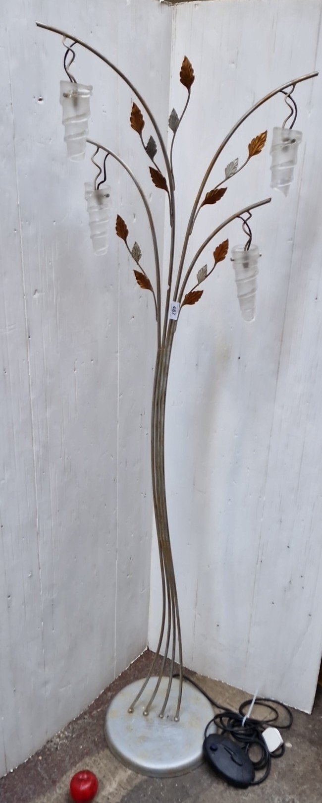 A sculptural metal floor lamp with five arched arms issuing frosted spiral glass shades, enriched with leaf-form appliqués in contrasting tones, on a circular weighted base with foot switch.