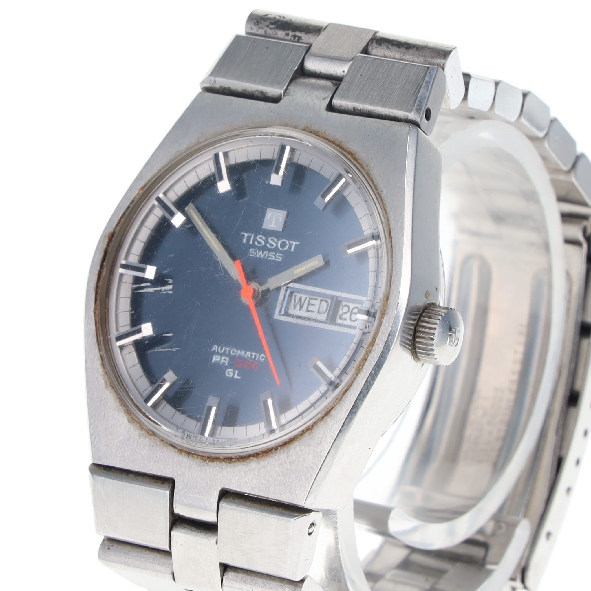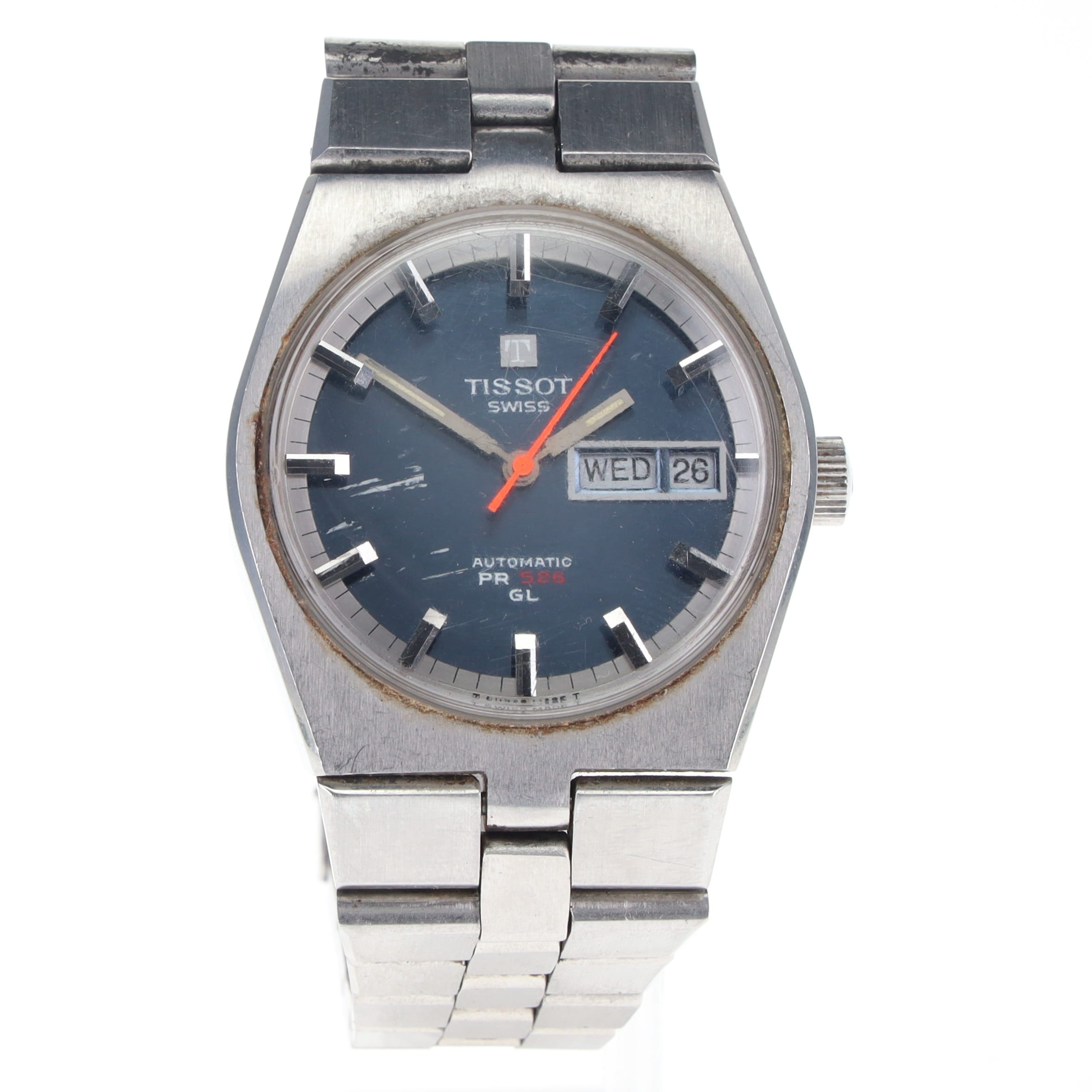 Tissot - Vintage PR 526 GL Day/Date Steel Automatic Watch. Swiss made Automatic movement. Stainless steel case and bracelet. Acrylic crystal has some scratches present. Watch is in full working order, offered without original box or papers.