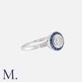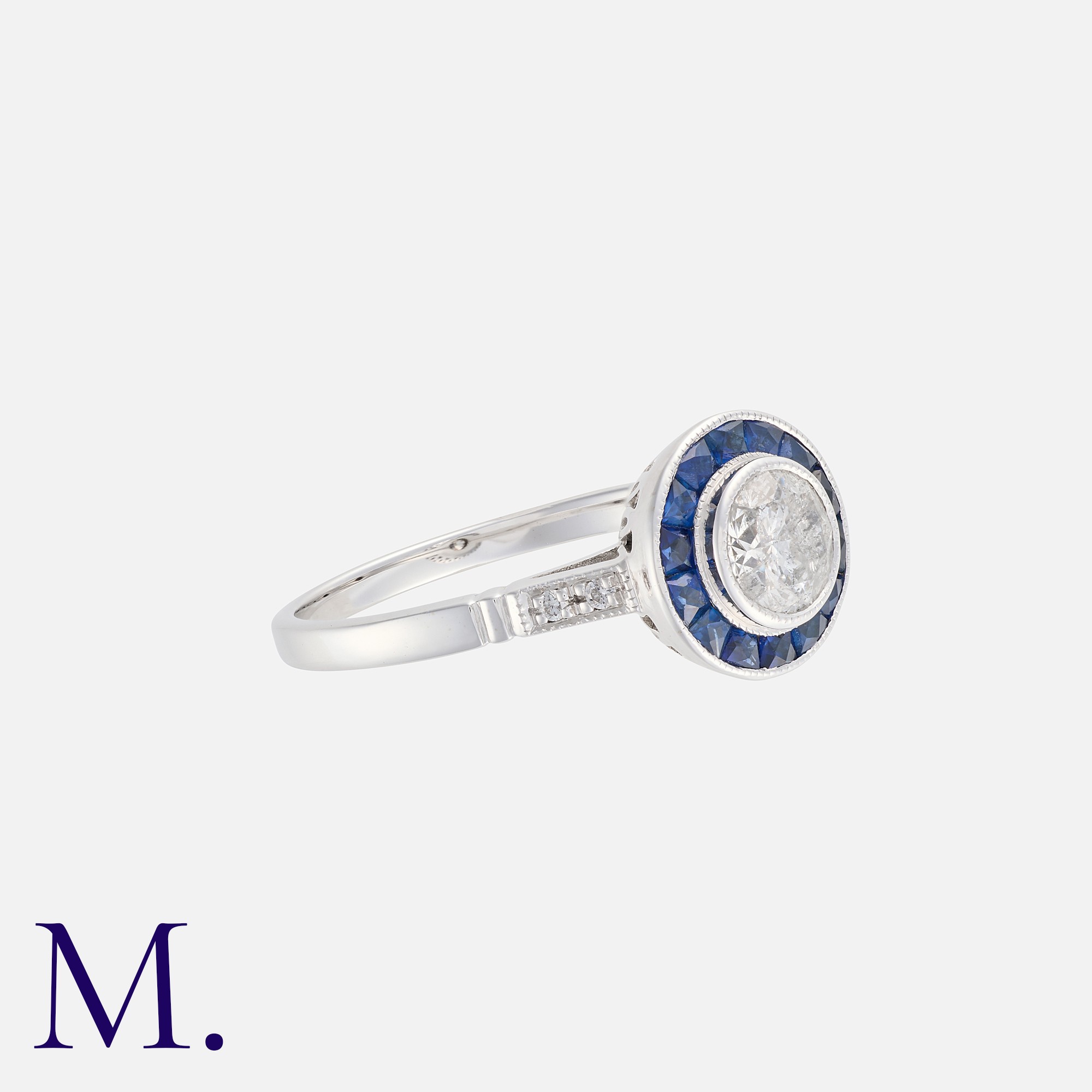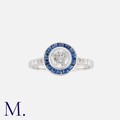 A Sapphire And Diamond Target Ring in 18k white gold set with a central round cut diamond of approximately 0.60cts within a border of calibre cut sapphires. Stamped 18k.