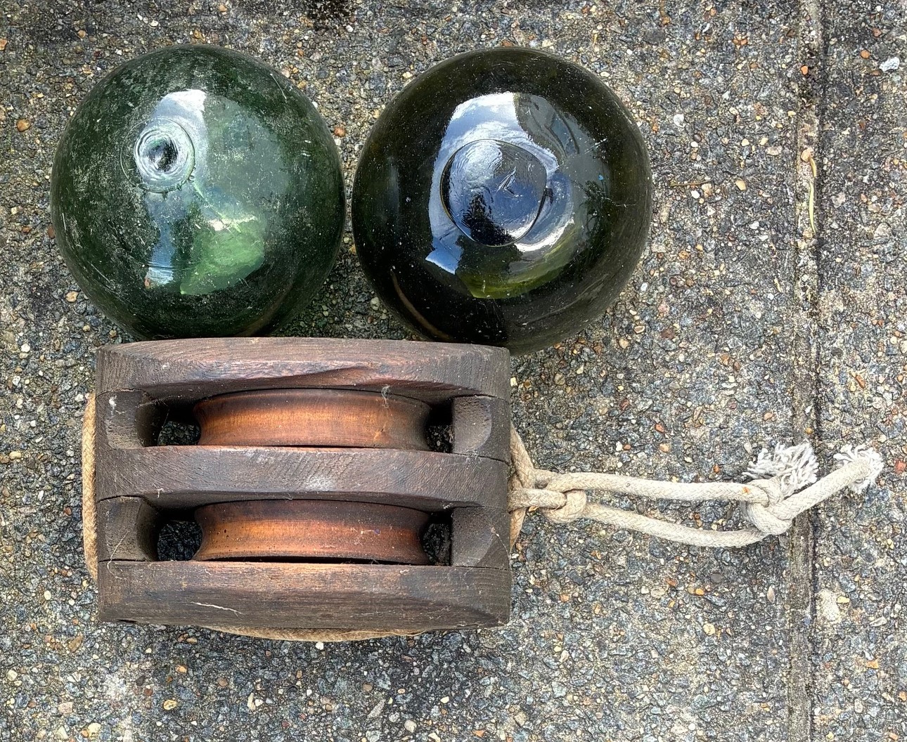 Two glass fishing floats, Maritime wooden pulley block (3).