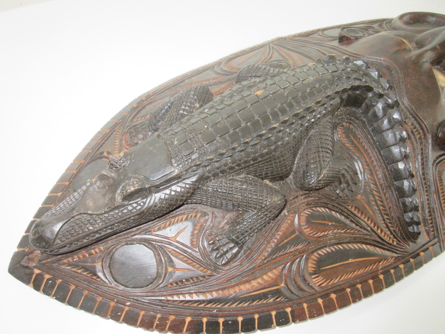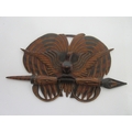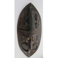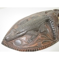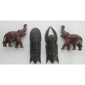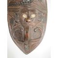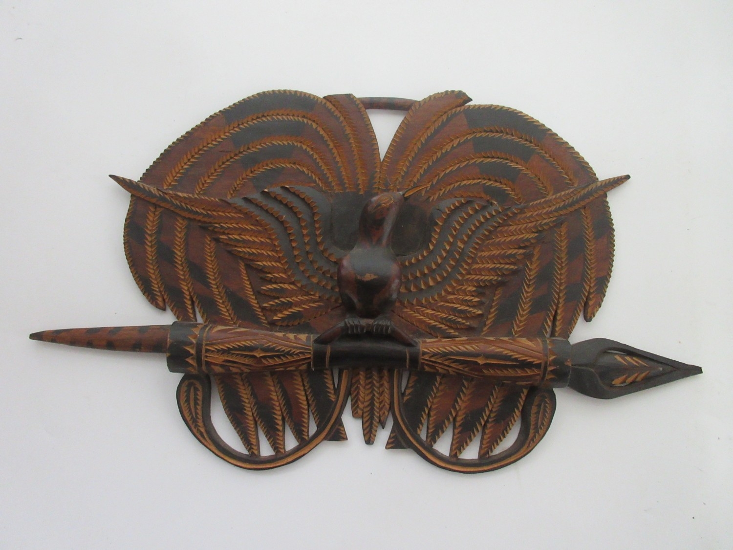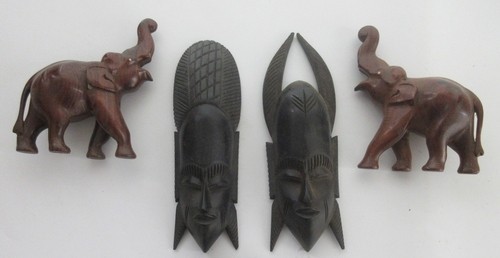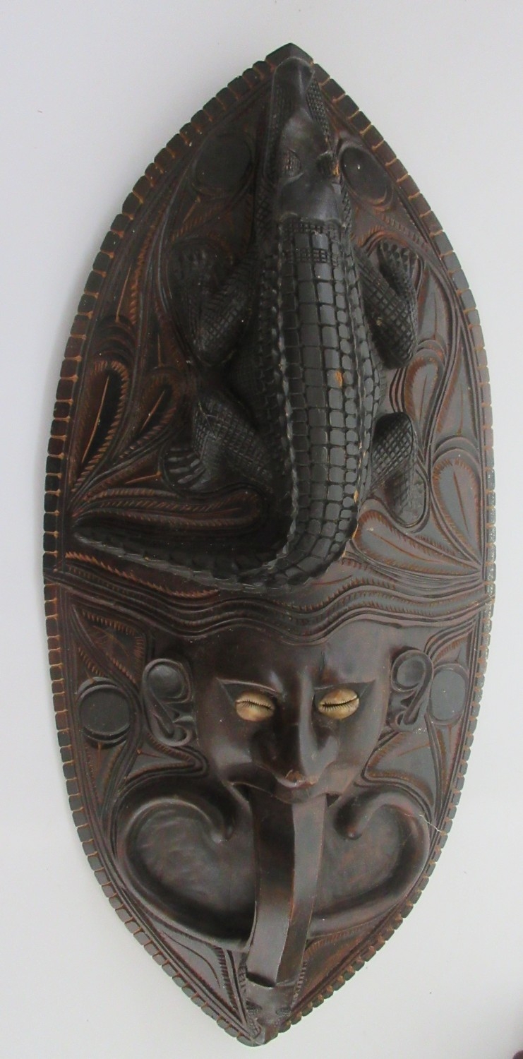 Collection of tribal art. Papa New Guinea flat woven grain basket, carrying basket, lidded basket, wooden carved national crest bird of Paradise, well carved ornate ceremonial mask. African wood carved elephants, small tribal masks