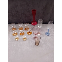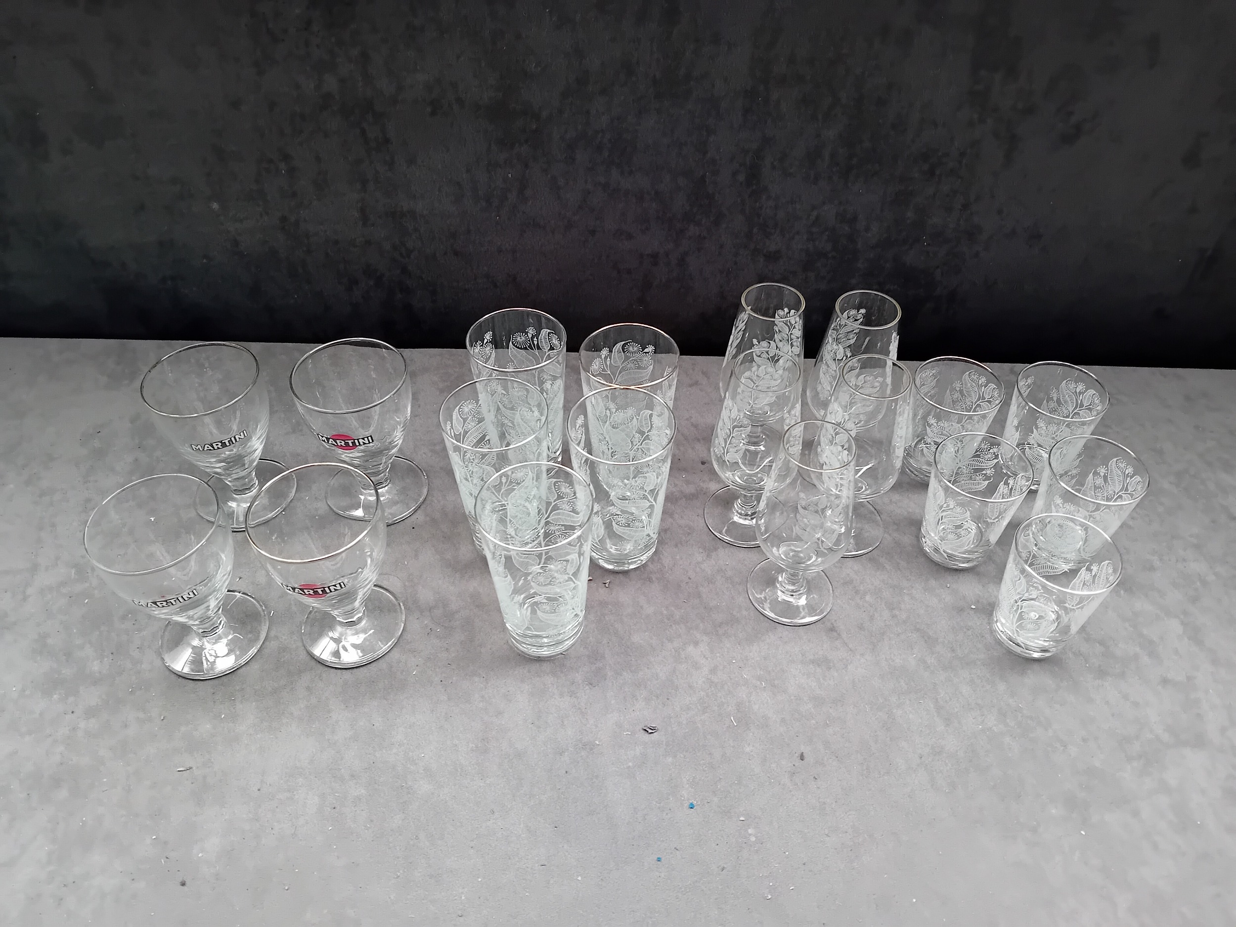 The second group consists of four small, stemmed cocktail glasses. These vessels are prominently marked with the red and black "MARTINI" logo printed beneath the rim.