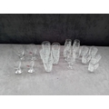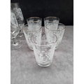 A collection of 20 clear glass drinking vessels, likely dating to the mid-20th century, comprising two distinct groups. The majority of the collection, consisting of 16 pieces, is attributed to Tiffin or similar Italian etched crystal manufacturers, consistent with patterns such as Florence or Byzantine noted in market research. These 16 pieces are uniformly decorated with a dense, acid-etched or frosted white botanical and foliate pattern. This group includes four stemmed glasses and twelve short tumblers.