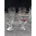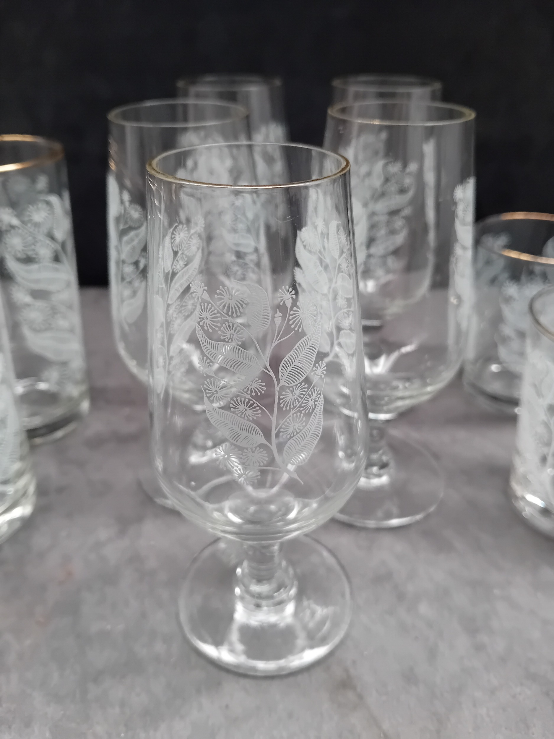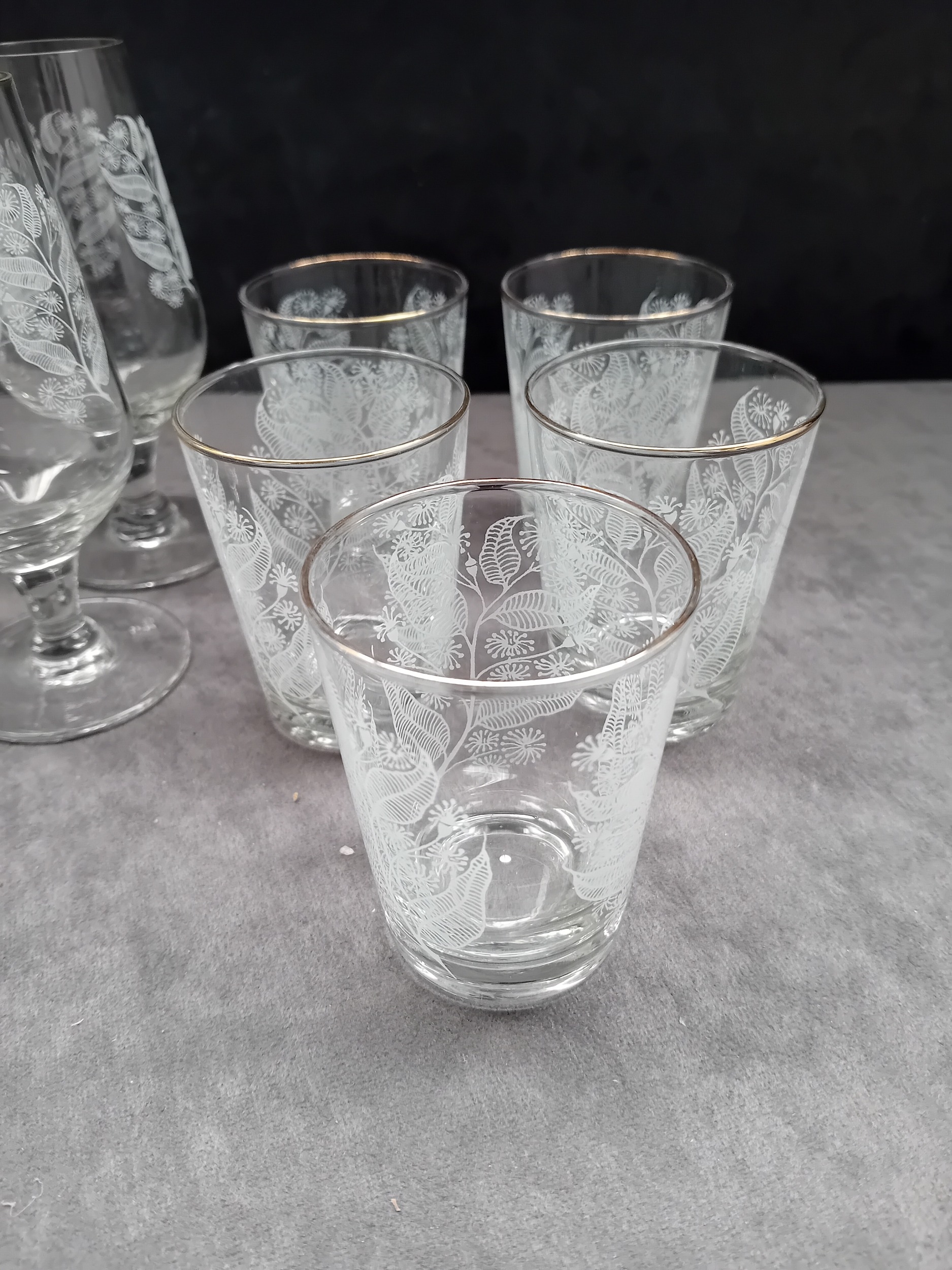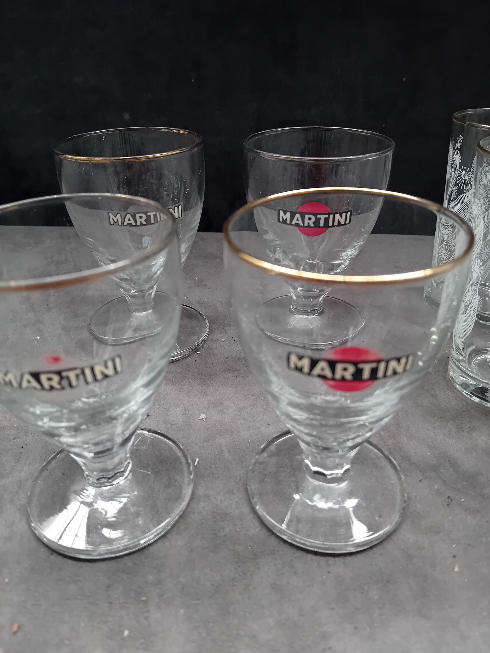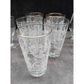 A significant portion of the tumblers and all four Martini stemmed glasses feature a thin gold band applied around the rim.