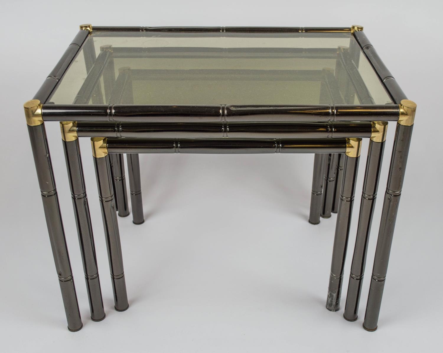 FAUX BAMBOO NEST OF TABLES, a set of three, largest 59cm L x 43cm W x 45cm H, Italian 1970's, gun metal faux bamboo, with brass caps and smoked glass. (3)