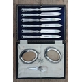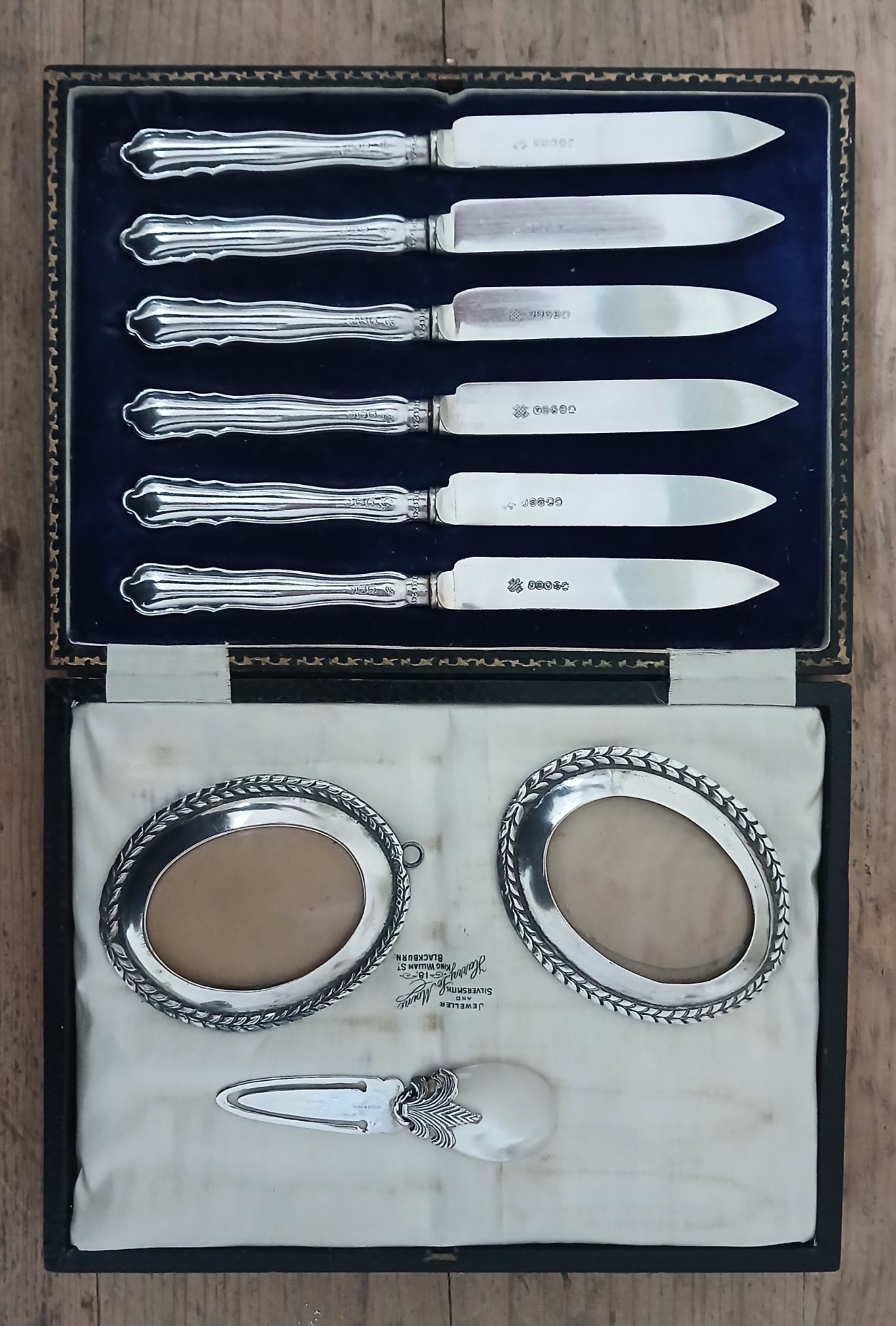 A mixed lot comprising a cased set of hallmarked silver handled knives, a hallmarked silver and mother of pearl book mark and a pair of white metal oval photograph frames.