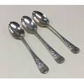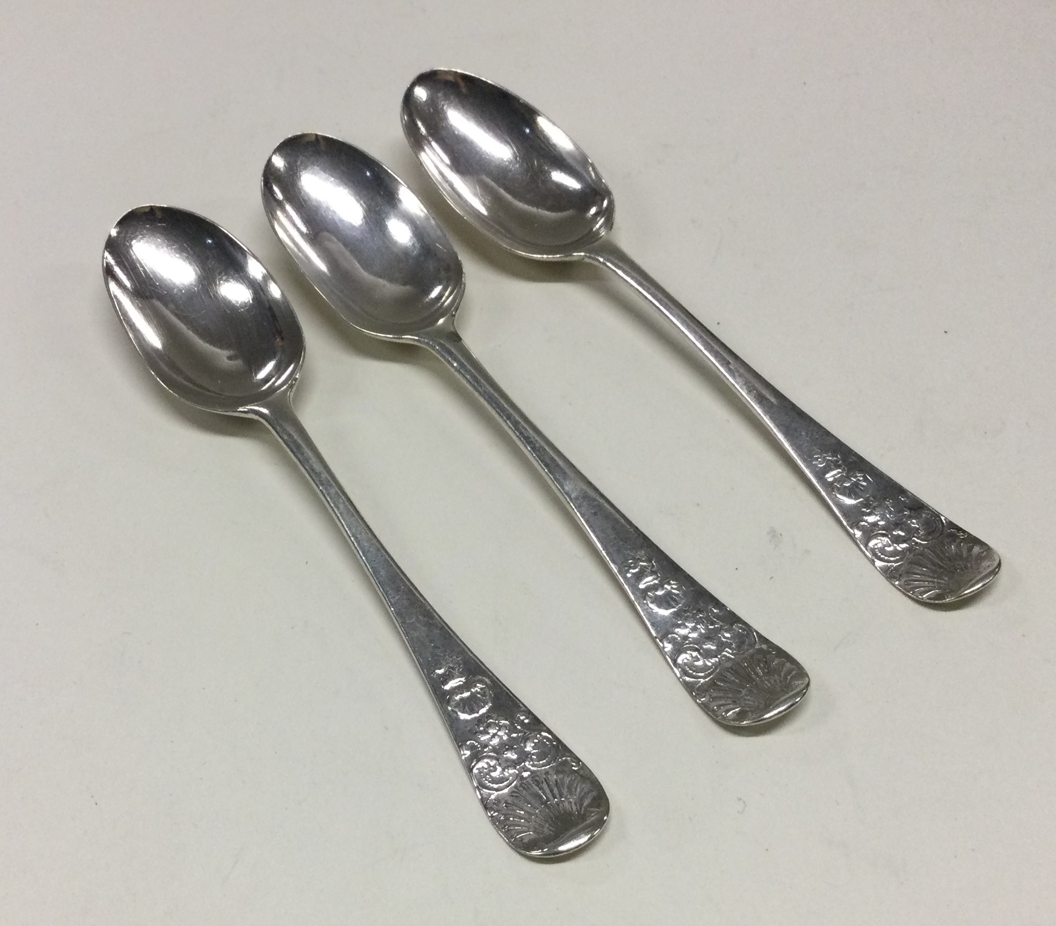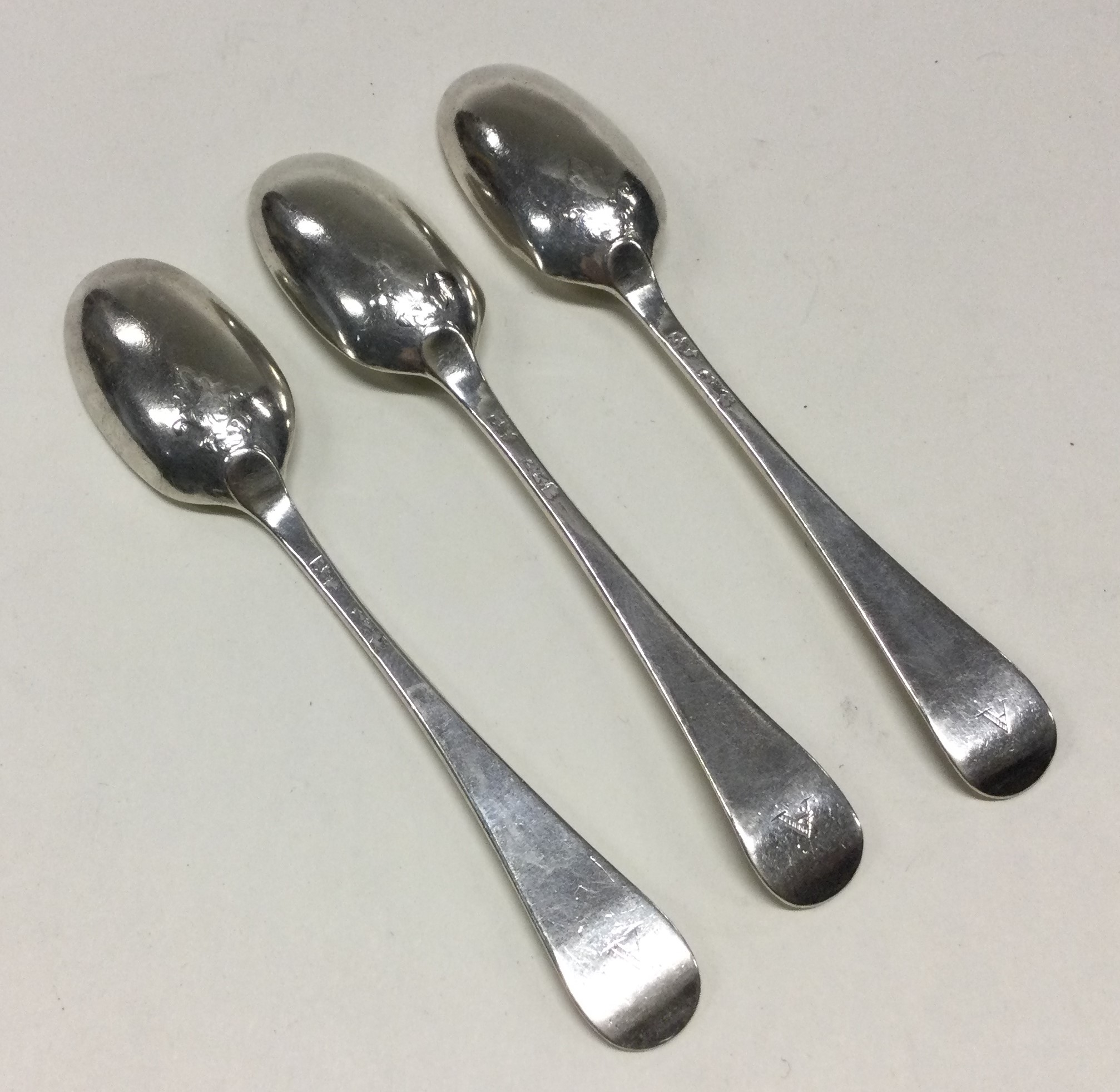A set of three 18th Century silver picture back spoons. Makers mark only. Approx. 41 grams. Est. £50 - £80.