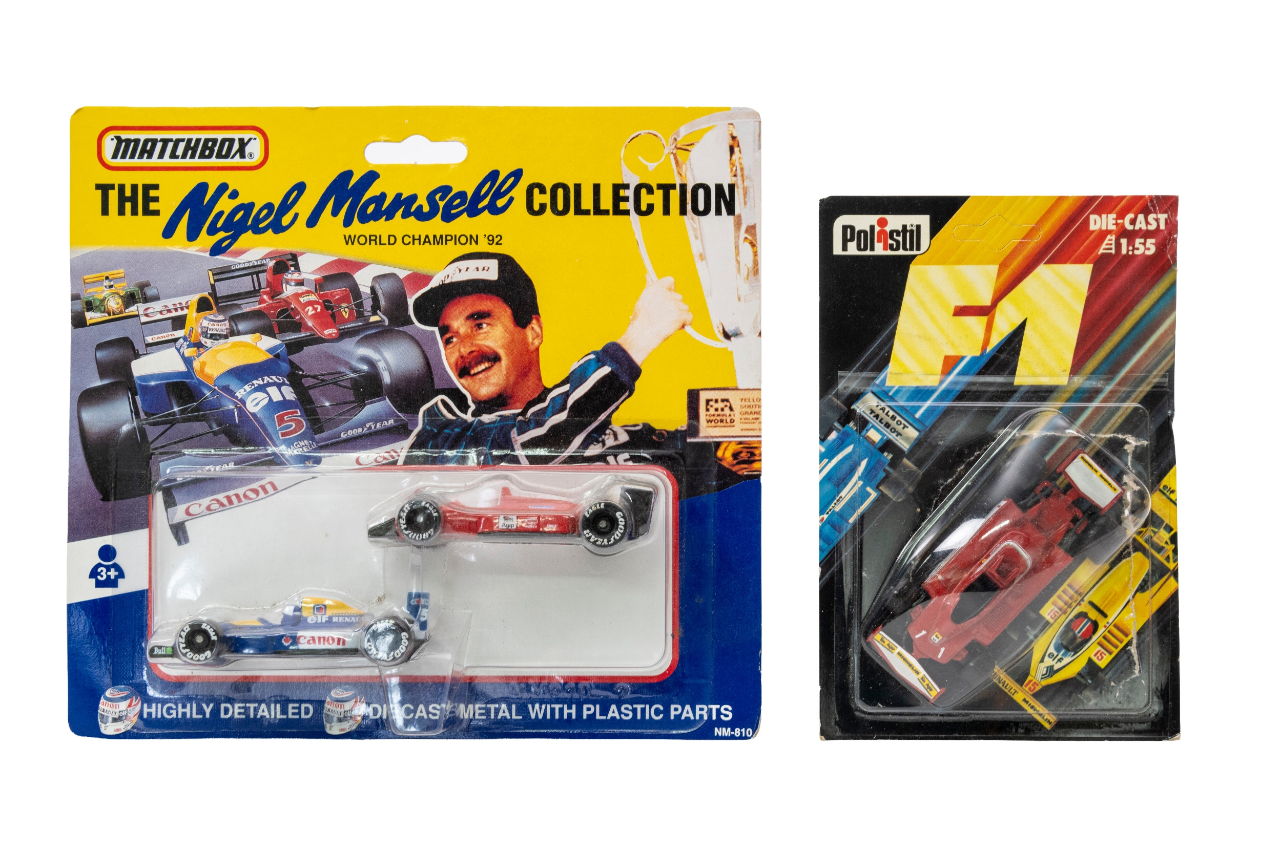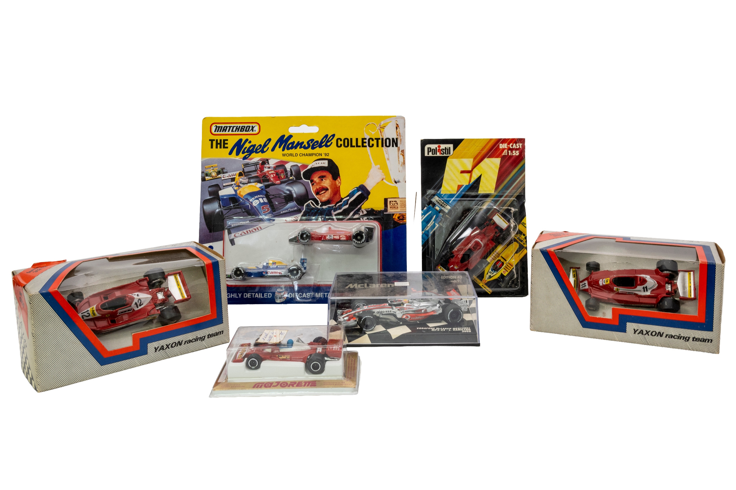 Yaxon and others. A boxed group of various Formula One cars, two Ferrari 312 T2, Minichamps Vodaphone McLaren Mercedes MP4-23 L Hamilton , 2008, Matchbox 'The Nigel Mansell Collection, World Champion '92' and two others.