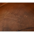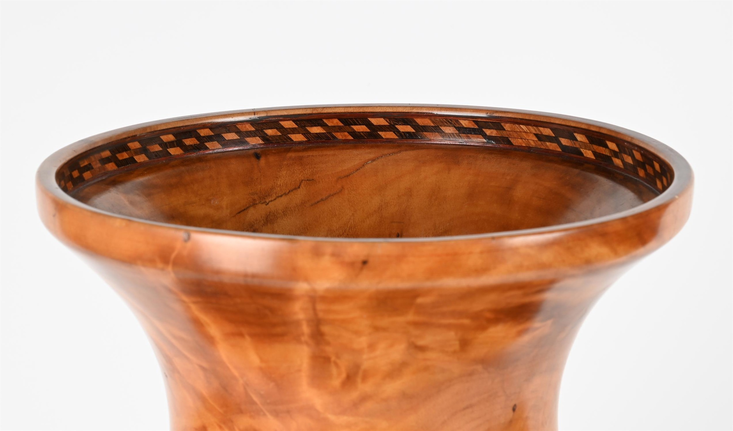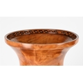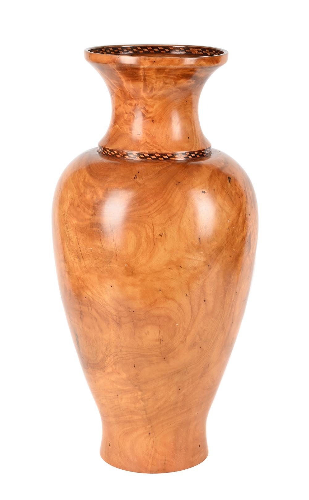 ROBERT W BUTTS, A HAWAIIAN PLUMERIA KOA AND PHEASANT WOOD BANDED BALUSTER VASELATE 20TH CENTURYSigned and inscribed to the underside64cm high The vase formed from a turned chunk of plumeria that was found by the artist abandoned in Moanalua alongside the H-1 freeway.Provenance:Private Collection