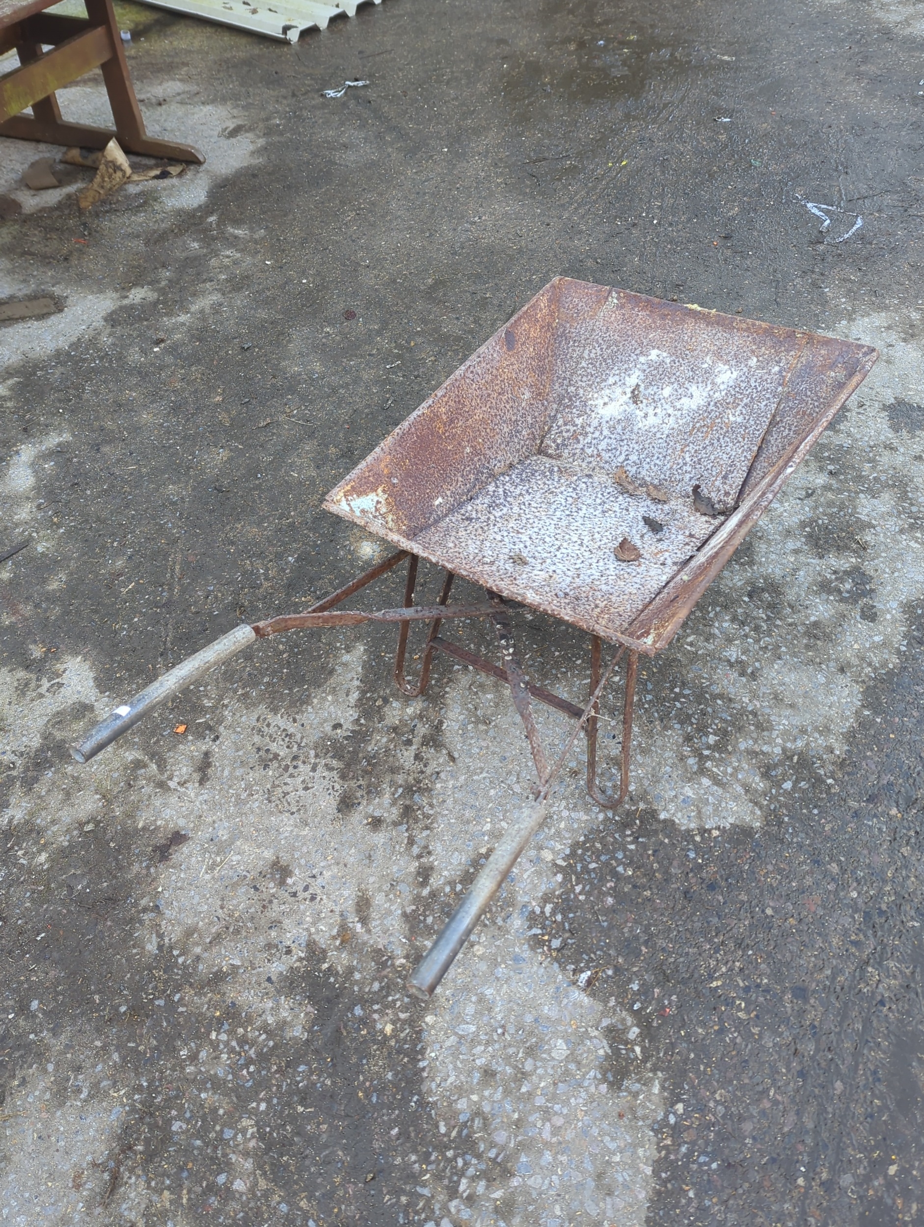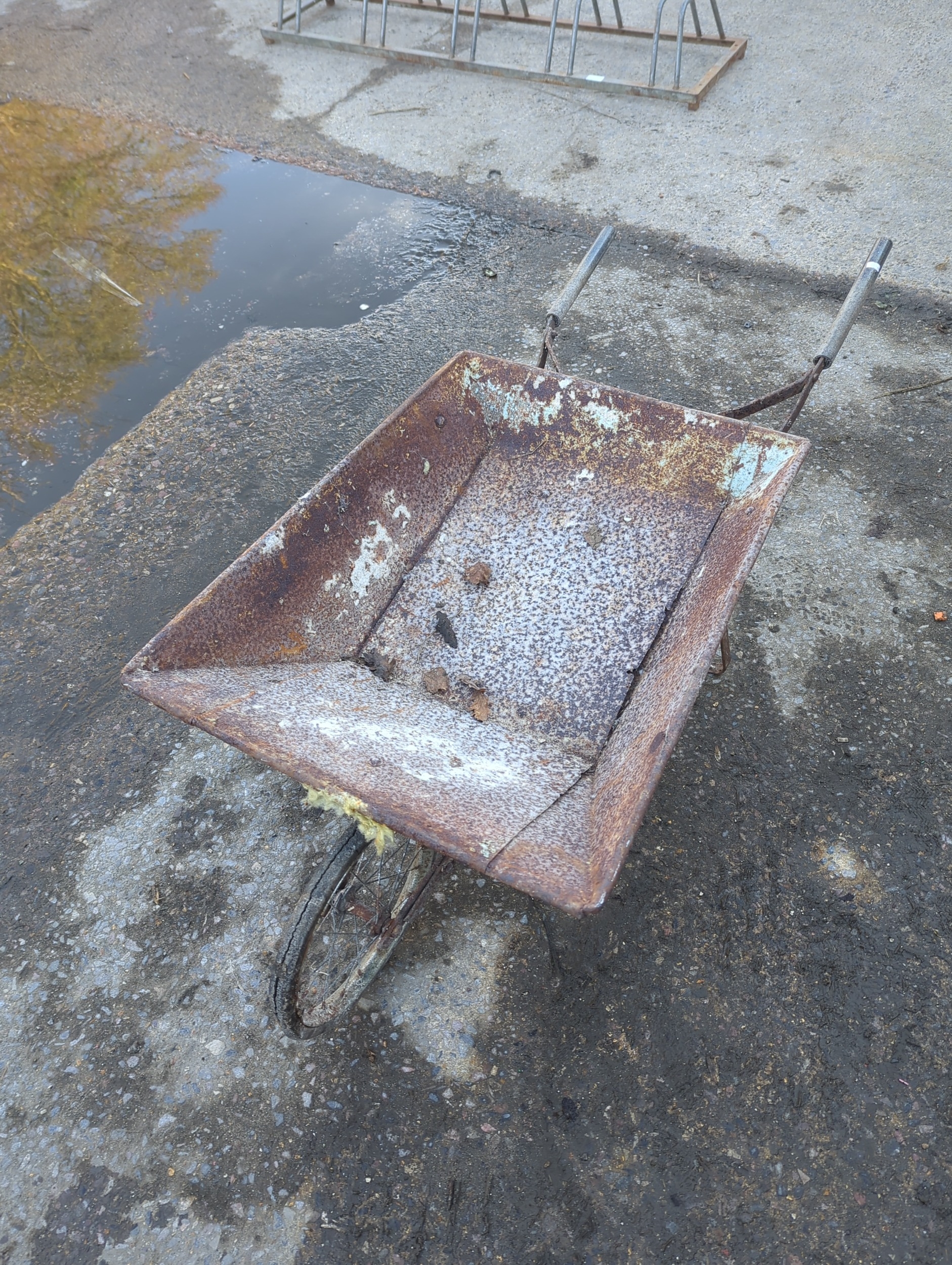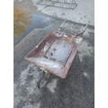 A sturdy metal wheelbarrow designed for hauling materials. It features two metal handles for easy maneuverability and a single wheel for balance. This classic garden tool is ideal for outdoor tasks such as transporting soil or tools.
