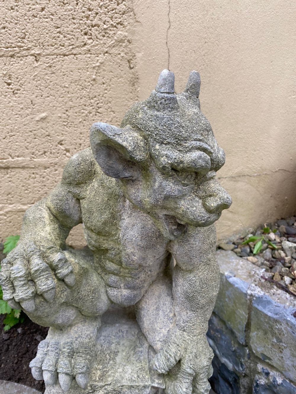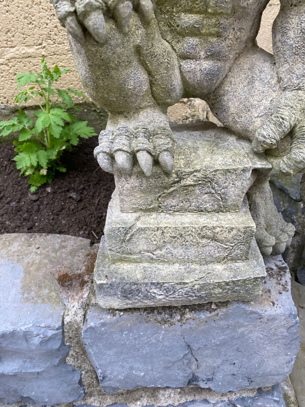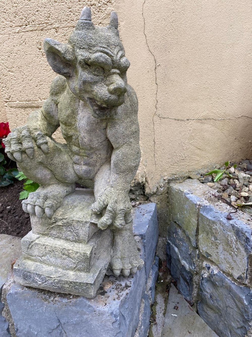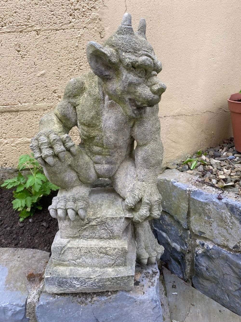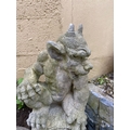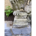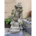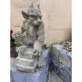 A GOOD QUALITY GARDEN ORNAMENT IN THE FORM OF A GARGOYLE, in a seated position, great detail to the gargoyle, his right foot resting on the platform base, the other lying down to the left. Dimensions: 52cm tall.