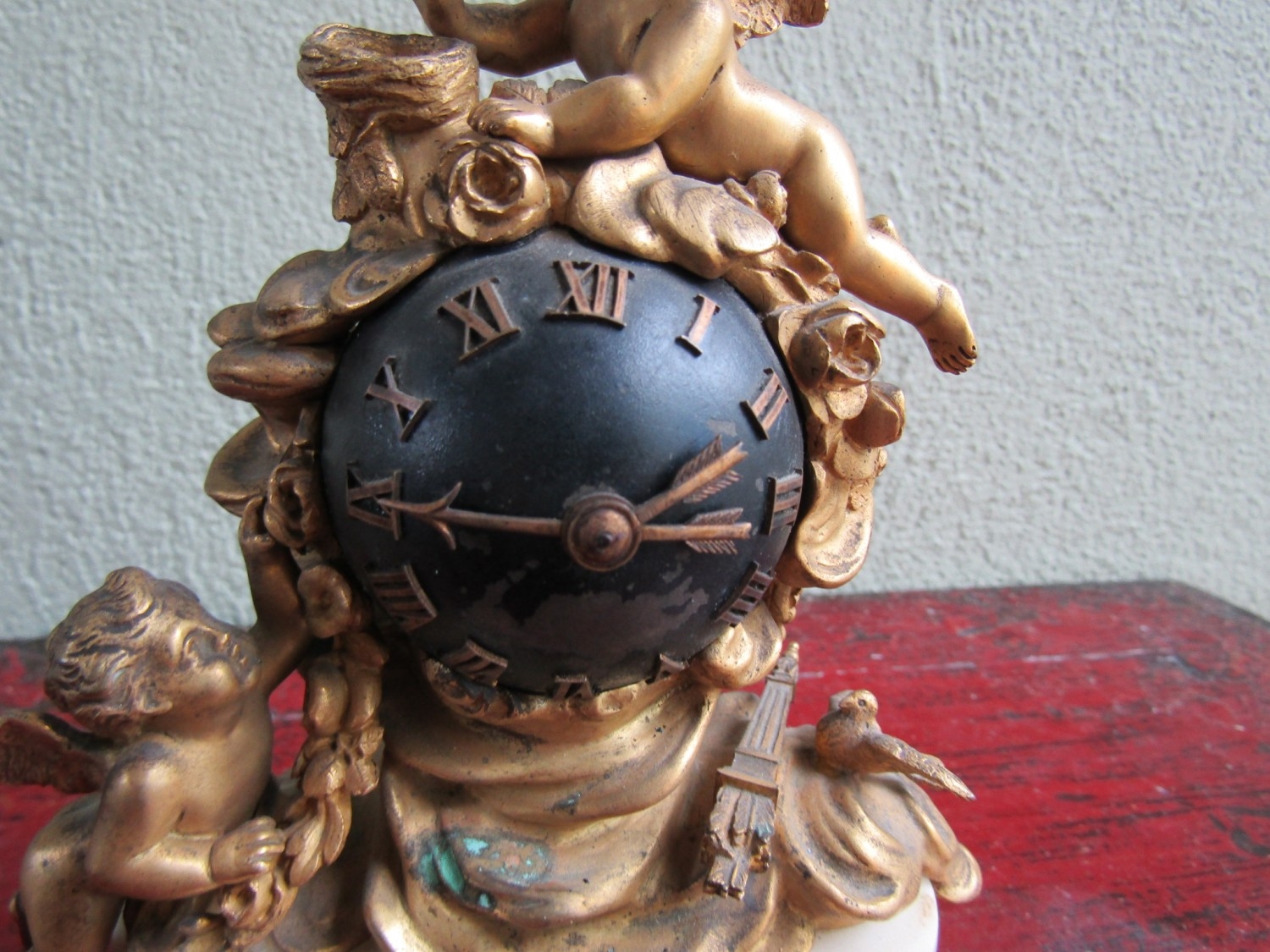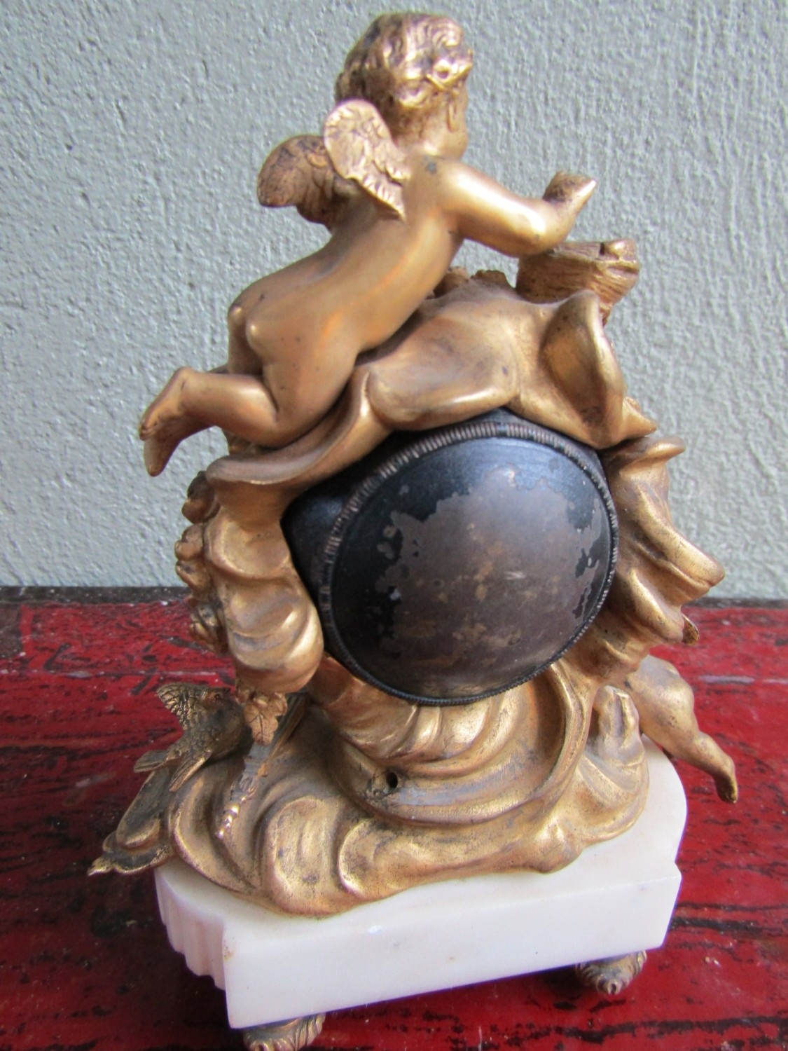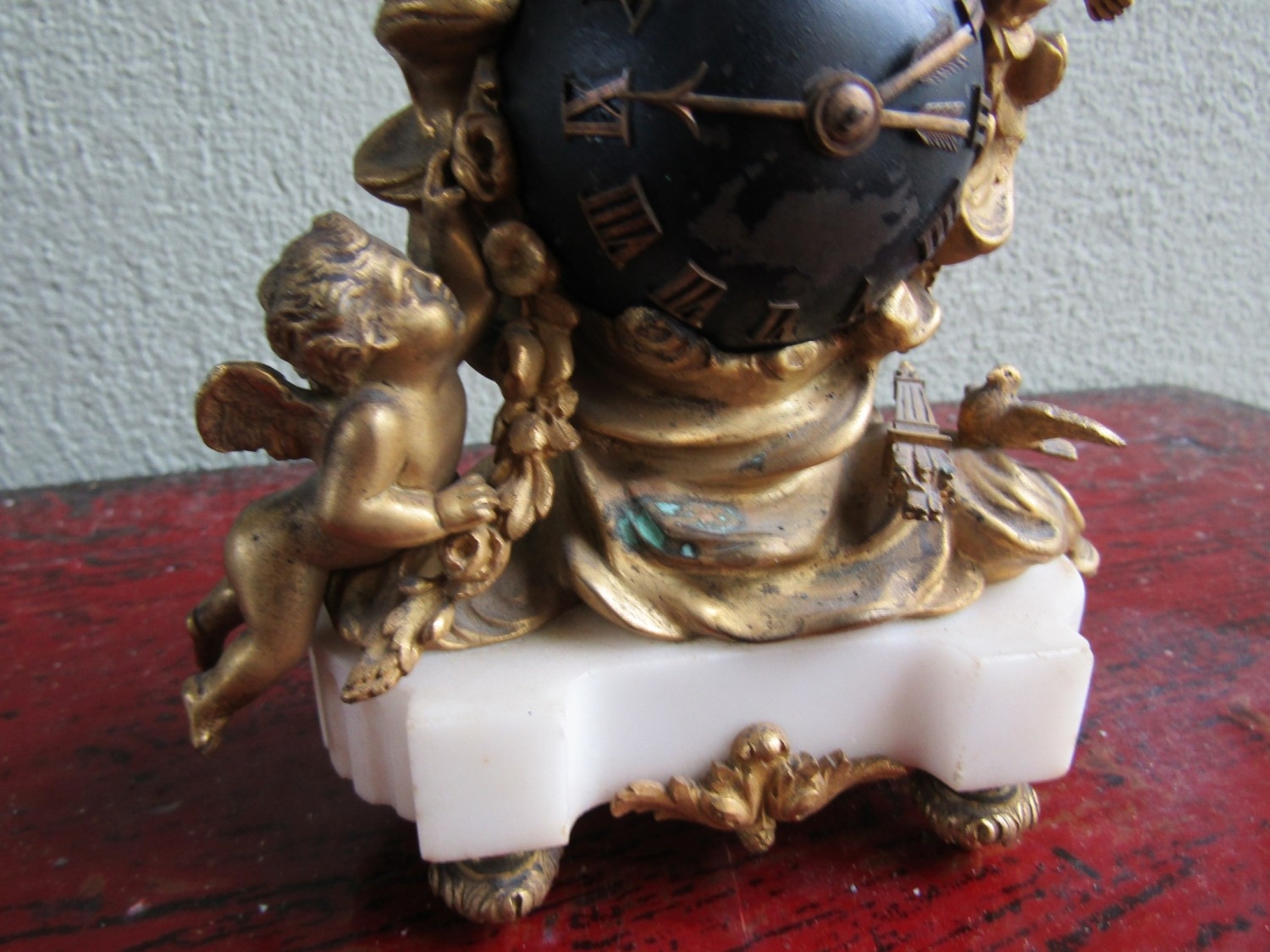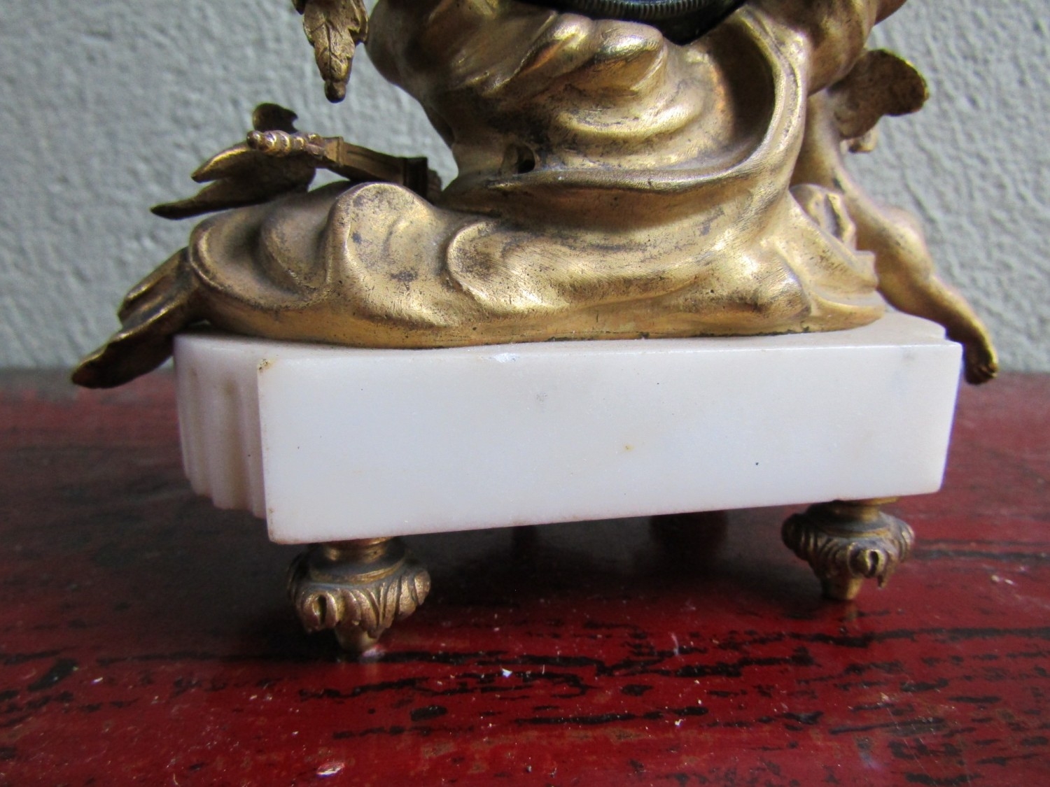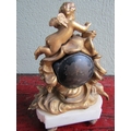 Antique Gilded Bronze Cherub and Bird Nest Motif Globe Form Mantle Clock Roman Numeral Decorated Dial Above Marble Base Attractively Detailed Throughout Approximately 7 Inches High x 6 Inches Wide