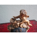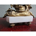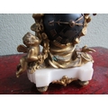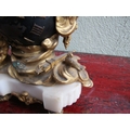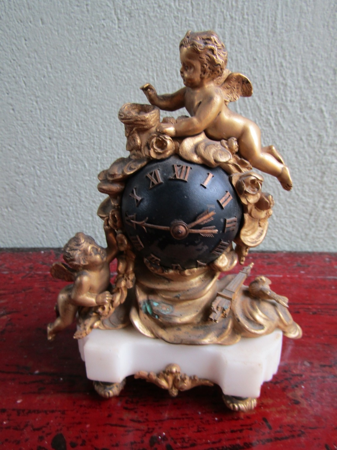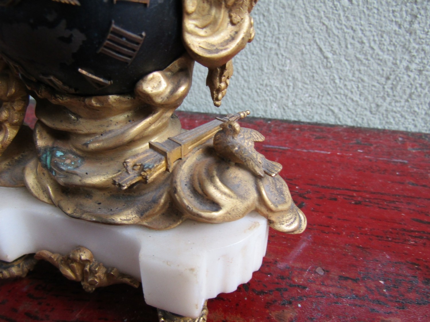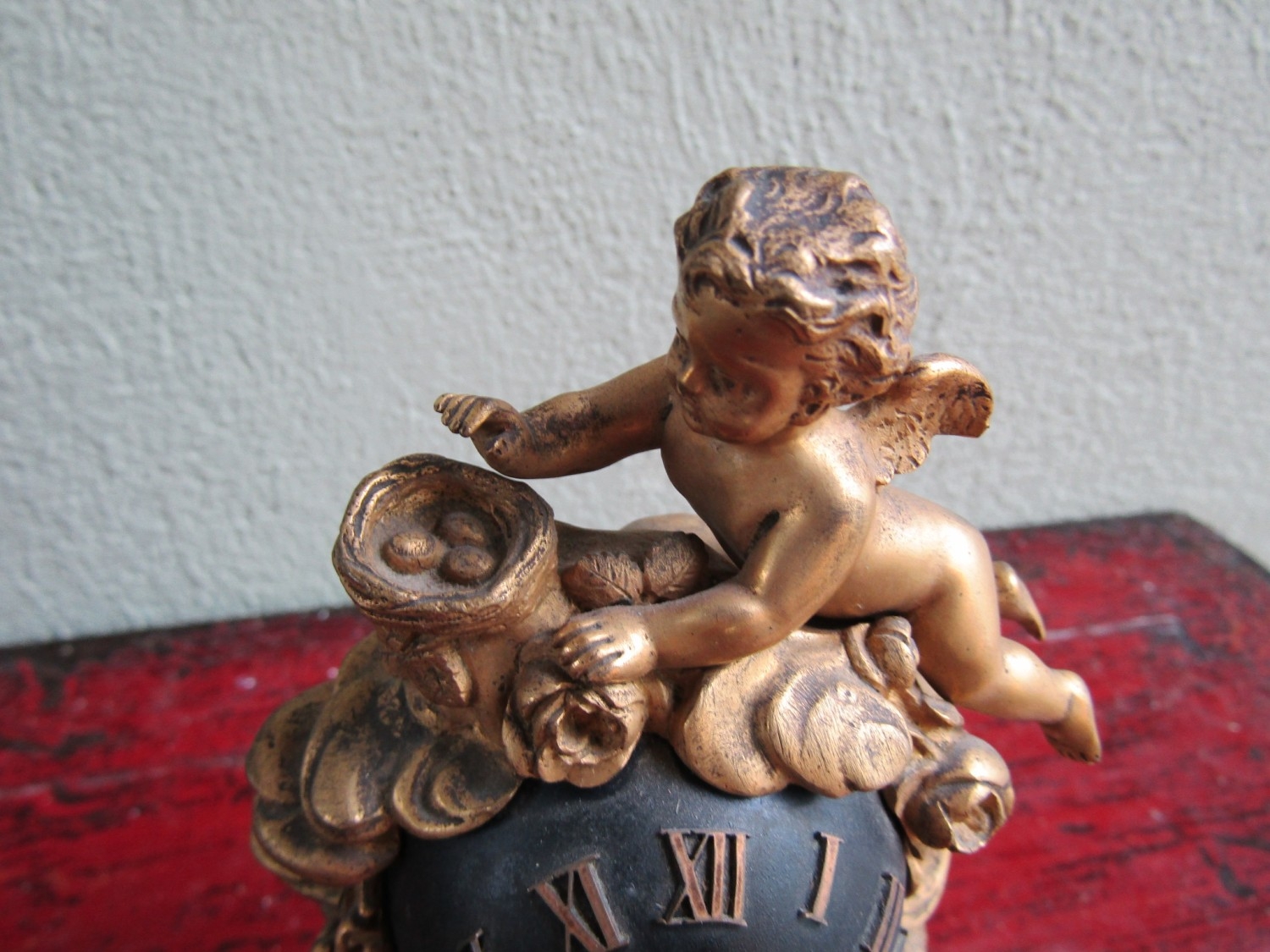 Antique Gilded Bronze Cherub and Bird Nest Motif Globe Form Mantle Clock Roman Numeral Decorated Dial Above Marble Base Attractively Detailed Throughout Approximately 7 Inches High x 6 Inches Wide